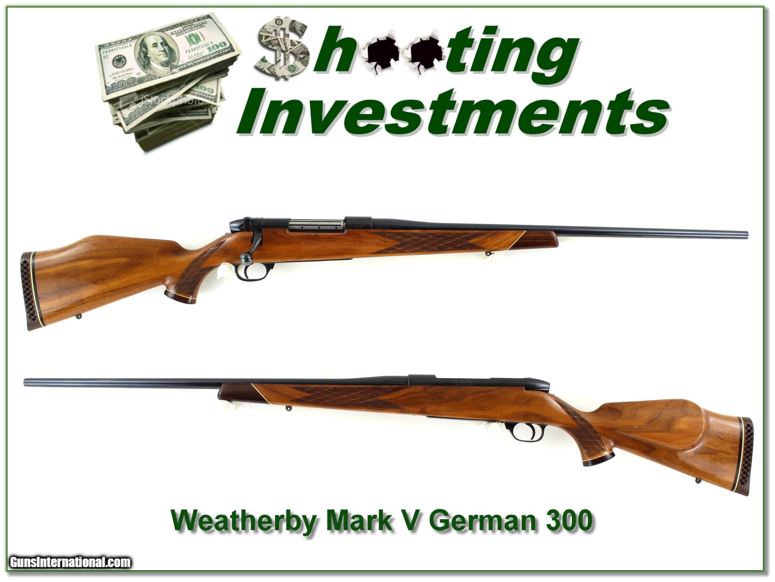 Description: This is a very nice German Weatherby Mark V Deluxe in the hard-hitting flat-shooting Weatherby 300 Magnum. The metal is excellent with no wear I see. The bolt and follower are jeweled and from the lugs I am sure not shot a lot. The wood has very nice grain and a honey blond color. The barrel is 24in making it perfect for most hunters that actually get into the woods! The just don’t make them like they used too! Shipping and insurance is $39. Please email me with any questions or larger pictures. (Consign your quality firearms with Shooting Investments for only 12%! Let me know if you have any you would like to sell!) 20-0278 Payment: Payment is by Money Order, Cashiers Check or Personal Check. I can now also accept Credit Cards (MasterCard, Visa, Discover & American Express) with a 3% convenience fee. PayPal can be used for some items but never for firearms. Shipping: The shipping charge will be listed in each description. It is $39 for most firearms. Some heavy guns or those insured for over $2000 will be higher. Shipments to Alaska and Hawaii are higher because air shipment is required. Most firearms are shipped on Tuesday and Thursday and usually in 5 days of receipt of payment. We package all shipments carefully and insure them. Optics are shipped Priority Mail and most other non-firearm shipments are shipped First Class. Returns: Our return policy is simple. If for any reason you are not pleased with your purchase, you may return your item for a full refund of purchase price. Ammunition cannot be returned. It is important to us that you are happy. Guns cannot be fired or dissembled before returning them and they must be returned in the same condition as received. Notification of a return must occur with-in 3 days of receipt at your dealer. Shipping, convenience and dealer fees are not refundable and are the responsibility of the buyer. Lay-a-way: If needed, we offer a 60 day lay-a-way option on most firearms. It is 1/3 now, 1/3 in 30 days and 1/3 in 60 days. Lay-a-way firearm sales are final and if not completed the first payment cannot be returned. Consigning your firearms with Shooting Investments: We will help you get top dollar for your firearms. While most local guns shops charge 20% or more, our fee is only 12% with a minimum of $75. At your local gun shop it might take months to sell. Selling on-line provides instant access to thousands of interested buyers. You won’t find any other on-line dealer willing to sell your firearms for only 12% or listing every gun on 3 separate s. Selling through an House typically costs the seller 15% and the buyer an addition 15% (so 30%) and you have to wait several months to sell and longer to receive funds. If properly priced, we will sell your firearms in a few weeks. Send us an email or give us a call and we’ll explain how easy it is for you to get top dollar. Trading: Trading for use is really just buying your gun to re-sell. If you have a gun you want to trade, please email a picture and we will let you know what we can give or it. You will always get more if we sell it for you on consignment. Help for California Buyers: We are happy to ship to California. It is the buyer’s responsibility to make sure any item you buy is legal in your state. We are also happy to help with your purchase of a firearm from someone other than us. If you see a gun you would like to buy but the seller can’t or won’t ship to California they can ship to use and we’ll then ship it to your California dealer. The cost for this service is only $30 + shipping. Let us know if we can help! SOLD |
