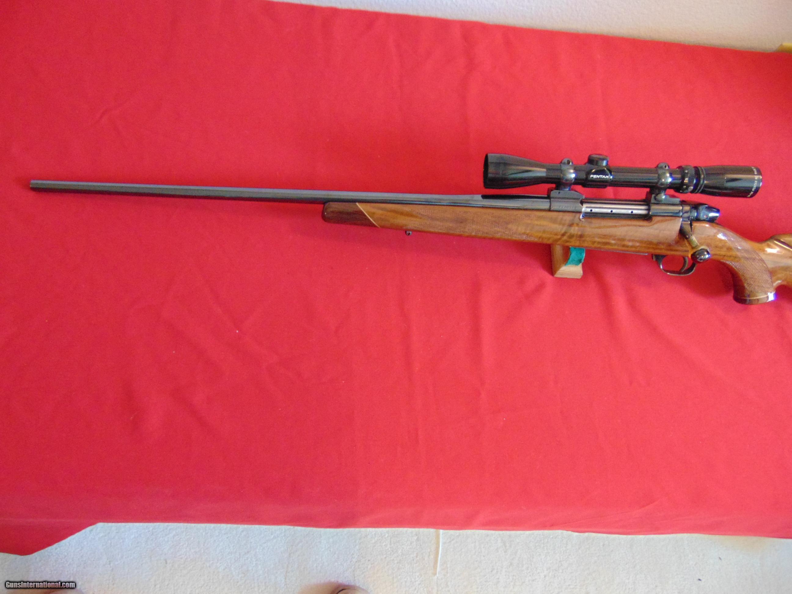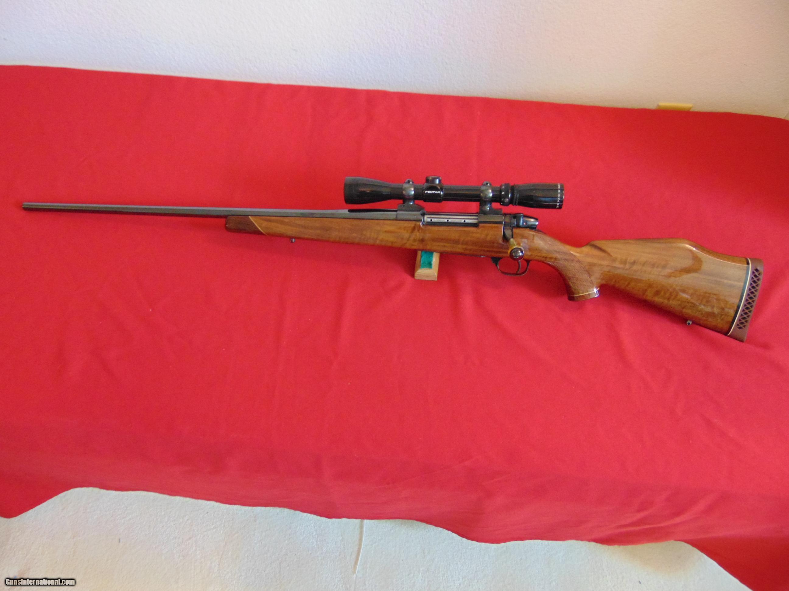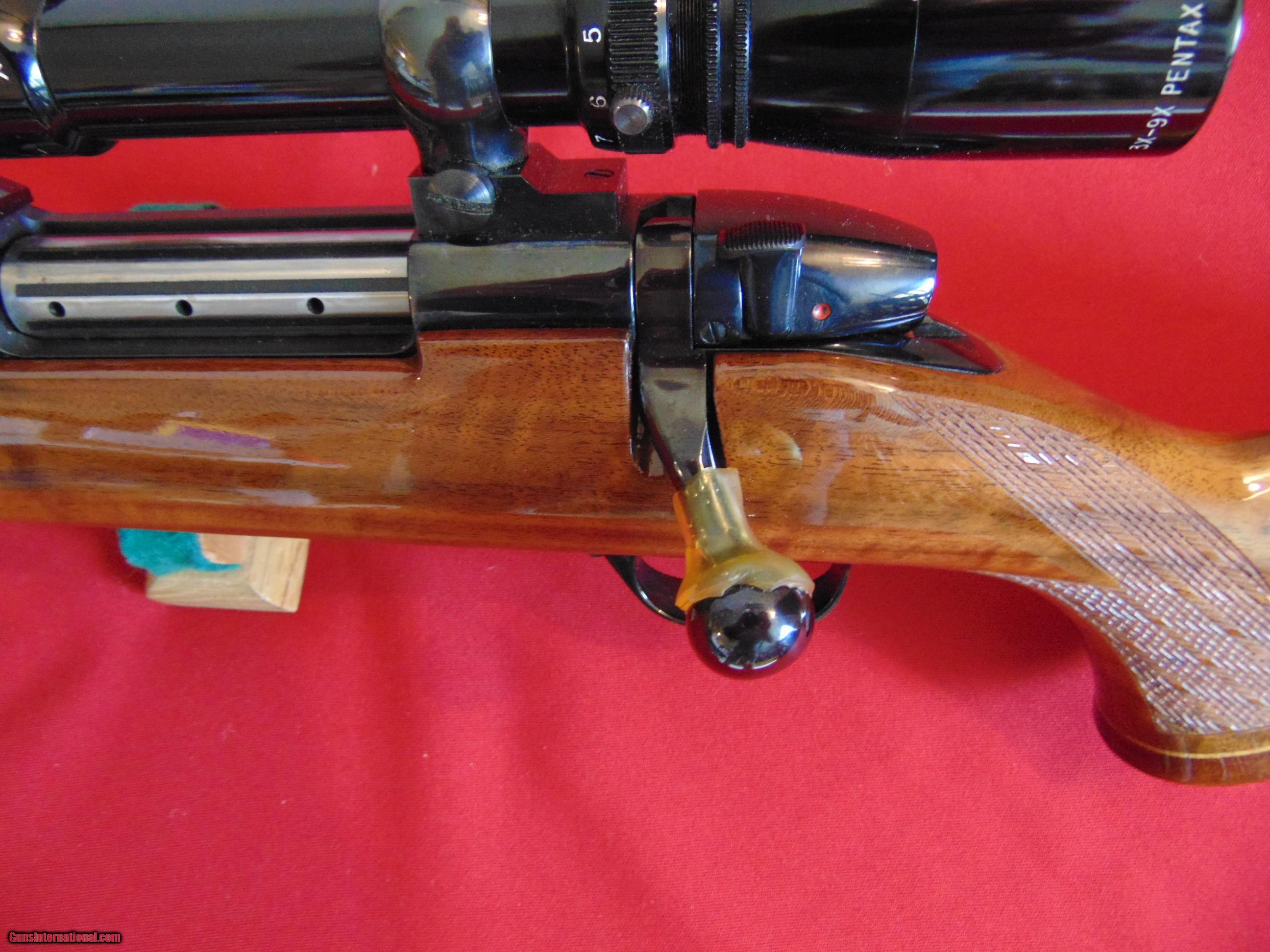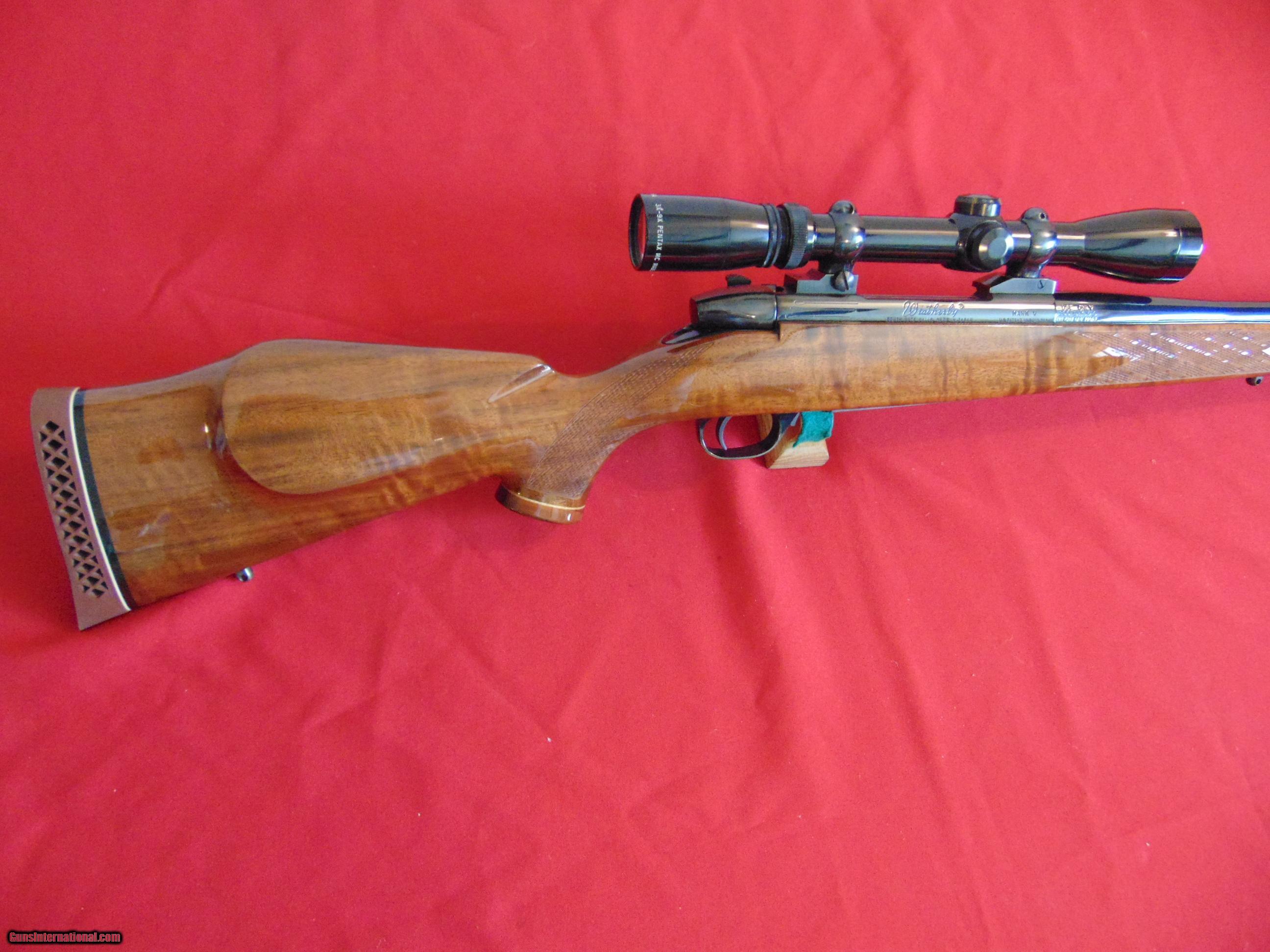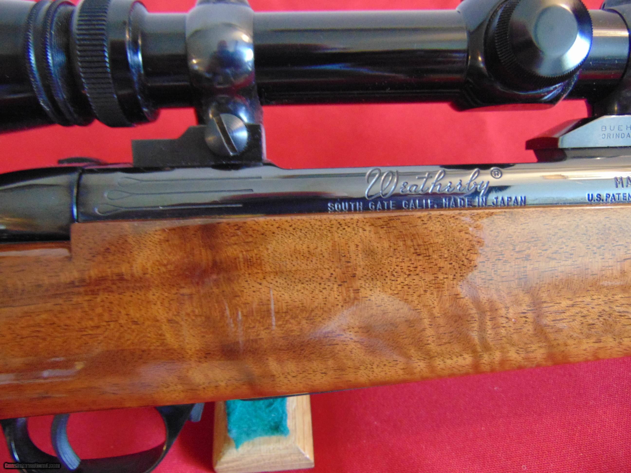Description: Beautiful Left Handed Weatherby Mark V Deluxe in 300 Weatherby Magnum. This gun is unfired except for Proofing. Still has the plastic on the bolt. 100% Original Condition except for slight rack marks on right hand of stock just below rear scope mount ( See Photo ). Appears gun was put too close to a right handed bolt gun and the bolt from the other gun made these marks. 300 Weatherby Magnum with a 26" Barrel. Strange story to this gun. As stated to me, brother purchased this gun for his brother who was going to Africa on a hunt and needed a good plains game gun. He had an inexpensive variable scope mounted on it, gave it to him as a gift and realized that the gun being a left hander would not work for his right handed brother. I took it in on trade in the past and just put it away for a later trade or sale. A real beautiful gun, made in Japan as they are today. FFL required to ship to. Thanks for Looking. SOLD |