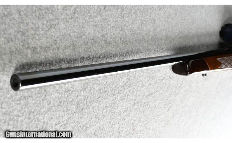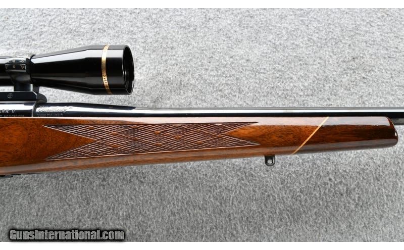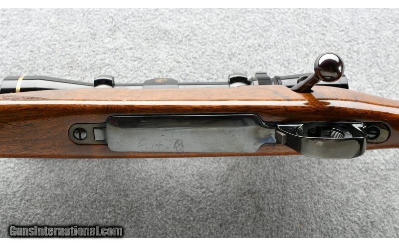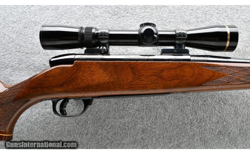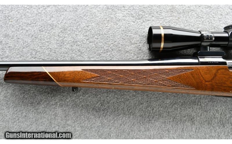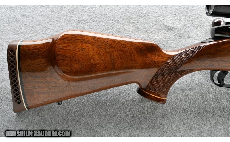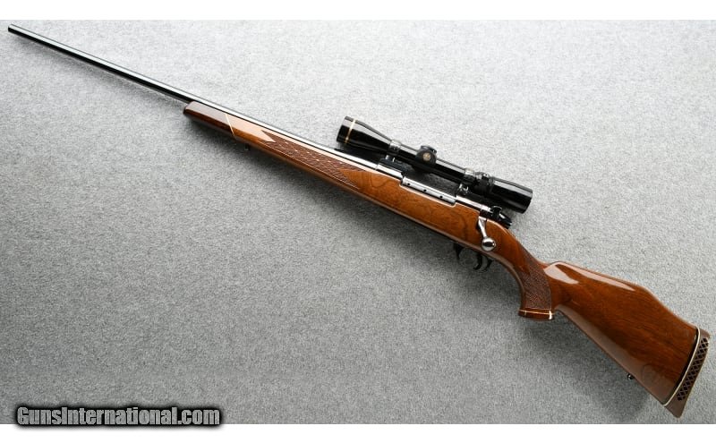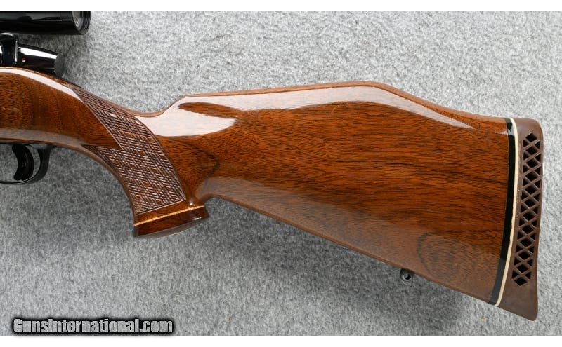 Description: The classic Weatherby with walnut stock, diamond point checkering and rosewood fore end tip and grip cap with maple spacers. Made in Japan. 7mm Weatherby Magnum SOLD Chambers: 7 mm Weatherby Magnum in a three round box magazine Left Hand bolt action rifle Metal Condition: "Very good, shows a few scratches on the floor plate and trigger guard Wood Condition: "Good, showing typical crazing of the finish Bore Condition: Bright and sharp Barrels: 24 Triggers: Adjustable with trigger shoe installed Stock Dimensions: 13 1/2" LOP Fore End: Checkered walnut with rosewood tip and maple spacer with sling stud Butt Pad: Weatherby vented pad by Pachmayr Weight: 8 lbs. 14 oz. Sights: "No sights, fitted with a Leupold VX III 2.5-8 Scope in Redfield base and rings Item Location: Grand Junction, CO |