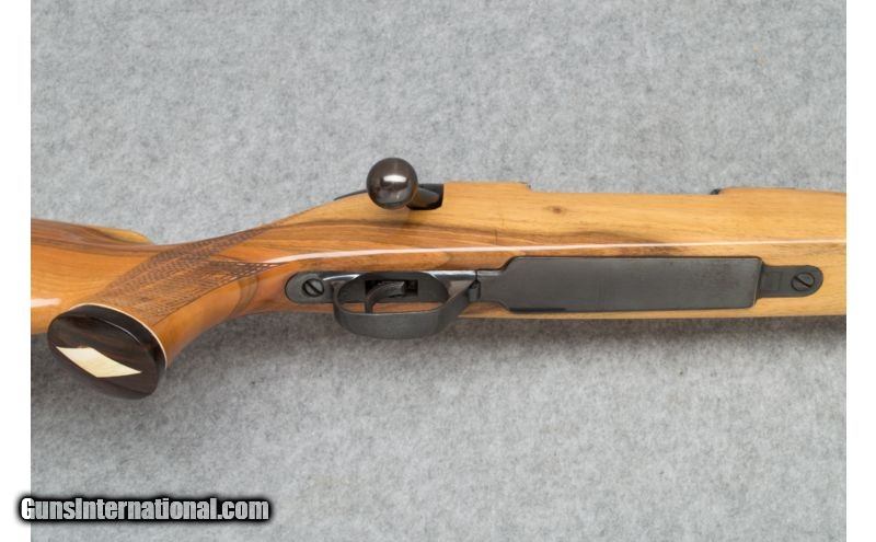Description: Used. SOLD Caliber Info: .270 WBY Mag. Metal Condition: Excellent Wood Condition: Very good; a few light handling marks Bore Condition: Clean and sharp Barrels: 24 Triggers: Grooved, blued steel Stock: Checkered pistol grip walnut; Monte Carlo comb and cheekpiece Stock Dimensions: LOP - 13 1/4 Fore End: Checkered walnut; rosewood end and grip caps Butt Pad: Brown rubber pad Weight: 7 lbs. 11 oz. Sights: No sights Extras: Weaver scope bases. Item Location: Sun Prairie, WI |