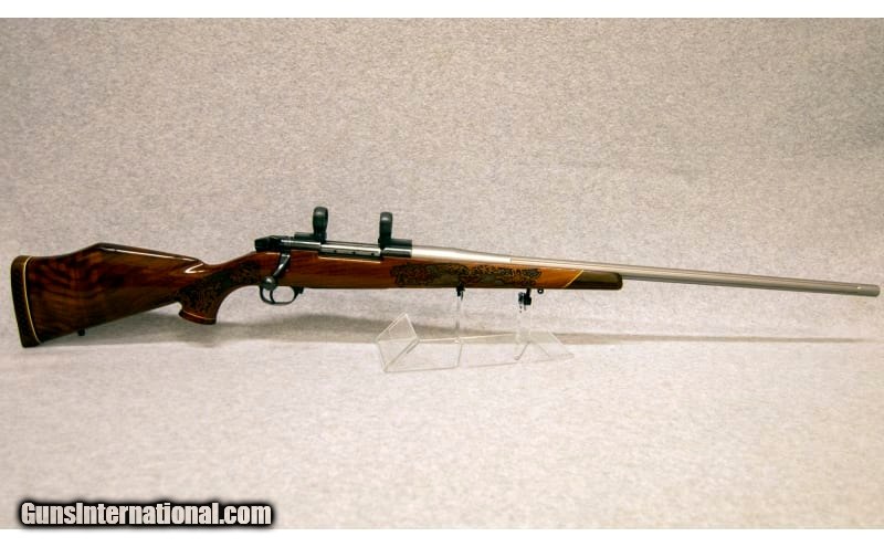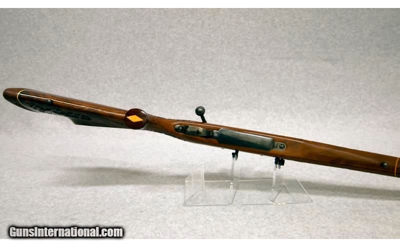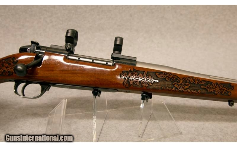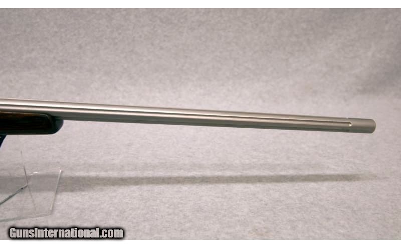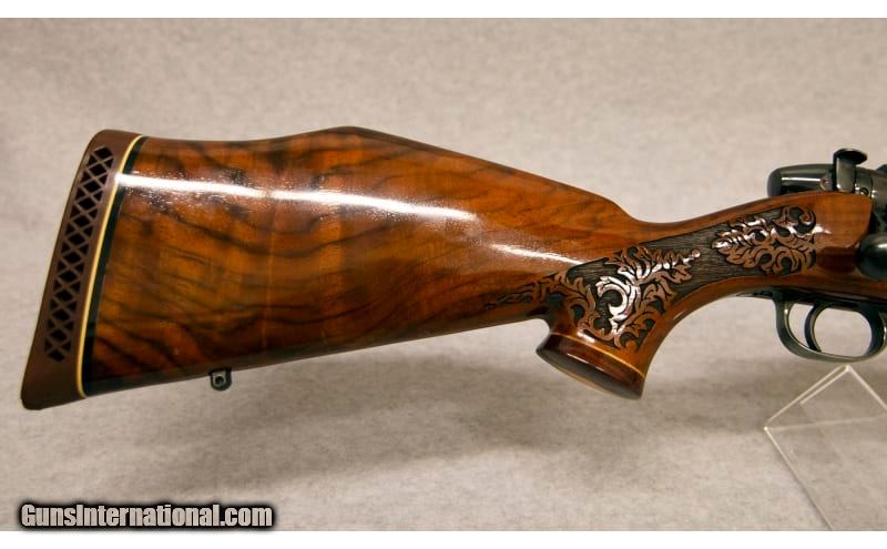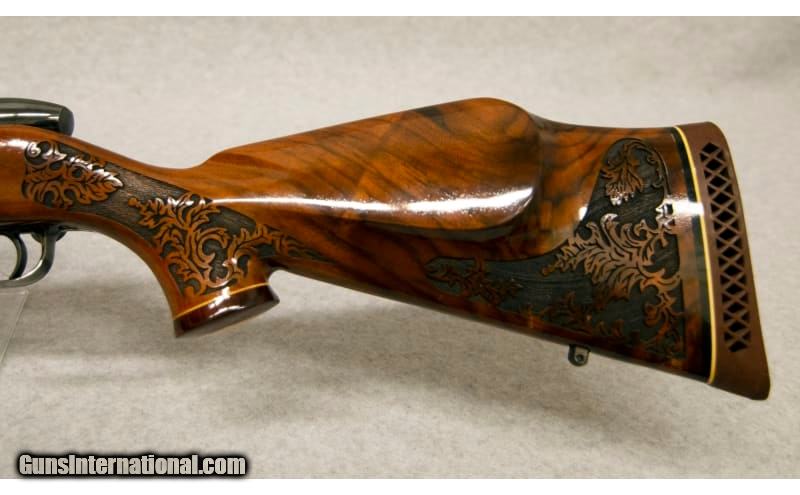 Description: Weatherby Mark V Lazermark, chambered in .300 Weatherby Magnum. Features include: 3 shot mag., 26 in. barrel, LXX trigger, raised comb Monte Carlo stock with laser carved oak leaf pattern, maplewood spacers and rosewood forend and grip cap, Pachmayr Decelerator pad, high lustre finish, 8 1/2 lbs. Bore is shiny and clean. There is one or 2 small scuff marks on the bottom of the stock between the pistol grip and butt pad. Comes equipped with scope rings .300 Weatherby Magnum SOLD Chambers: .300 Weatherby Magnum Metal Condition: Excellent Wood Condition: Excellent Bore Condition: Excellent Barrels: 26' Stock Dimensions: 13.5' Butt Pad: Rubber Sights: None Item Location: Fort Mill, SC |