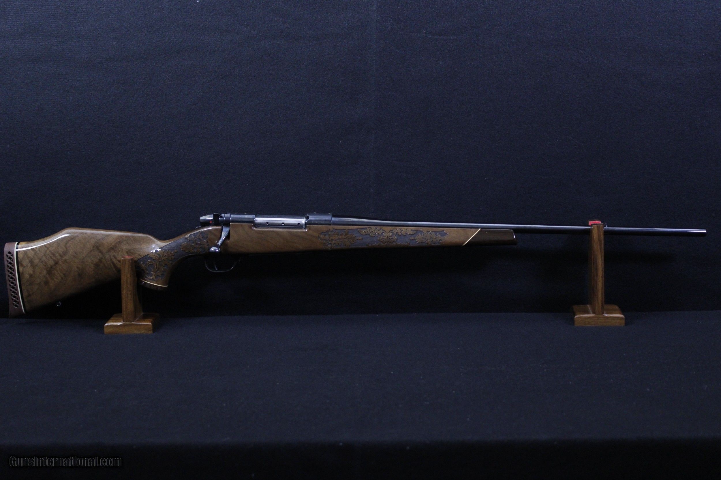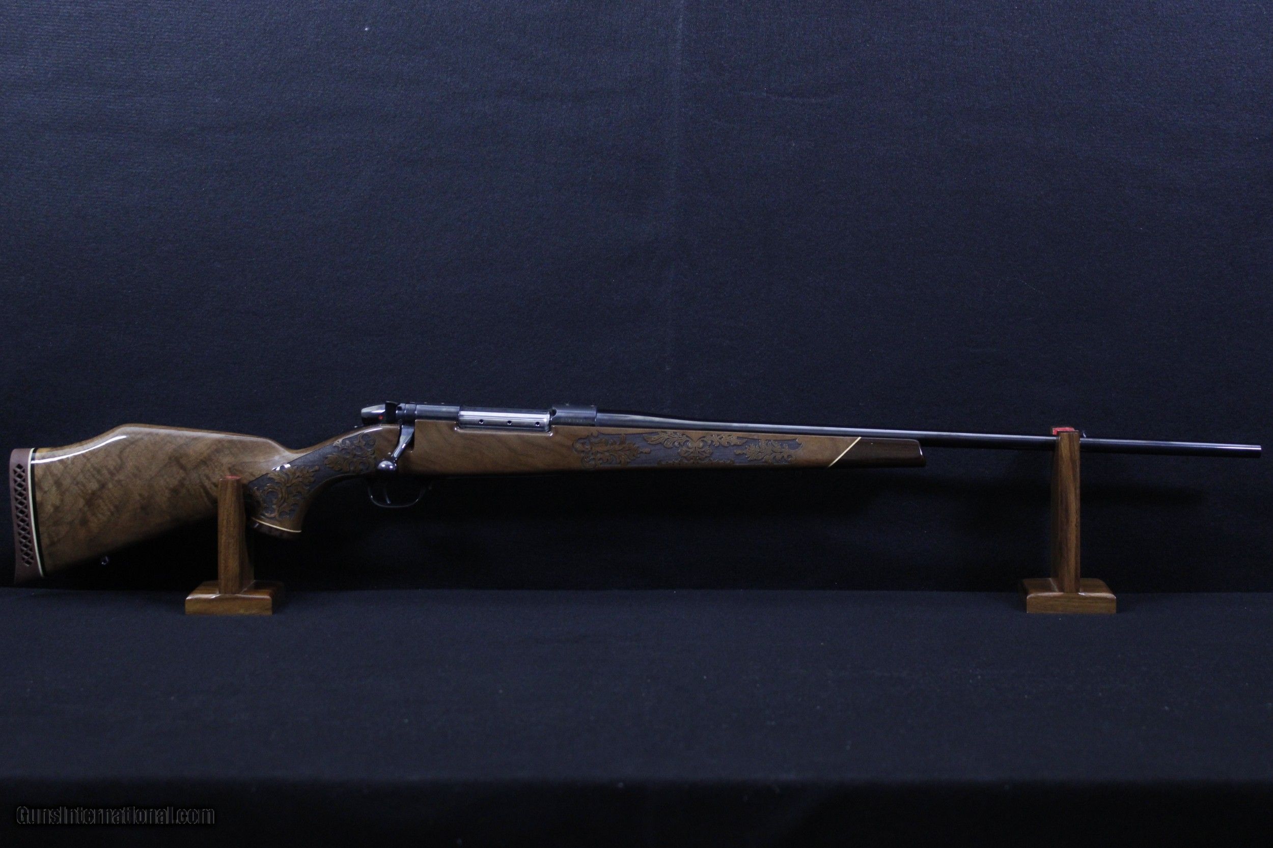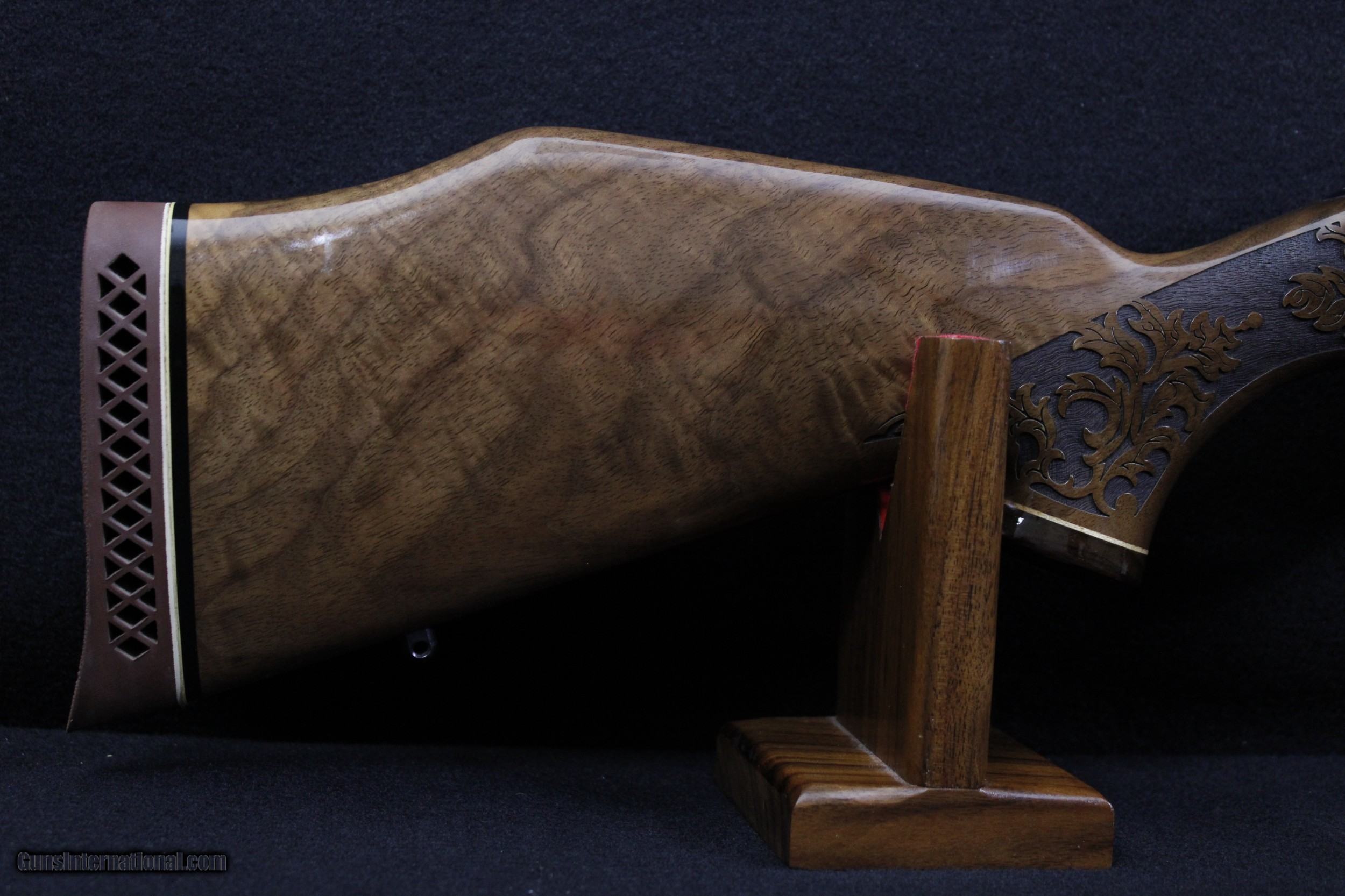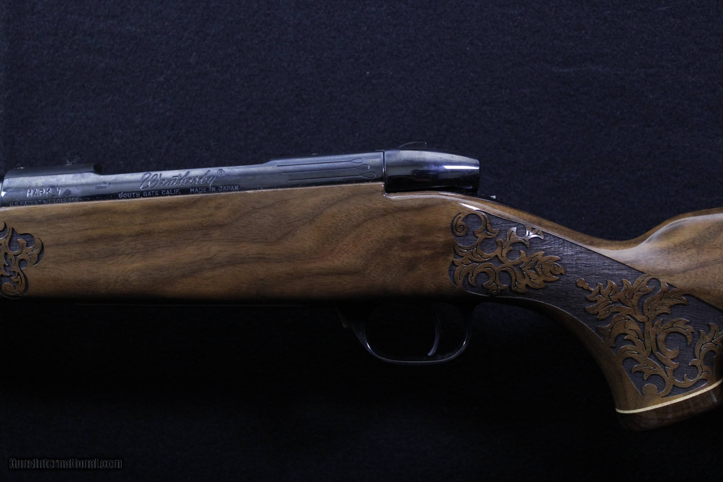Description: Looking for accuracy and beauty in your next rifle? The Weatherby Lazermark is the complete package. Combined with Weatherby technology the hand selected Claro walnut, Rosewood caps, classic blue steel and oak leaf engraving provide a sophisticated yet traditional look. The Lazermark also features a SUB-MOA accuracy guarantee, LXX trigger, fluted bolt body, cocking indicator and magnum 9-lug action. This rifle has all the bells and whistles, give us a call and make it yours today. NEW NO BOX. Dimensions are as follows; BBL. 24" WT. 8lb. 9oz. DIM. 13 1/4" L.O.P. SOLD |