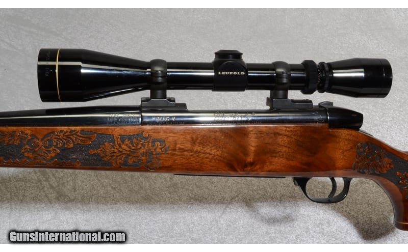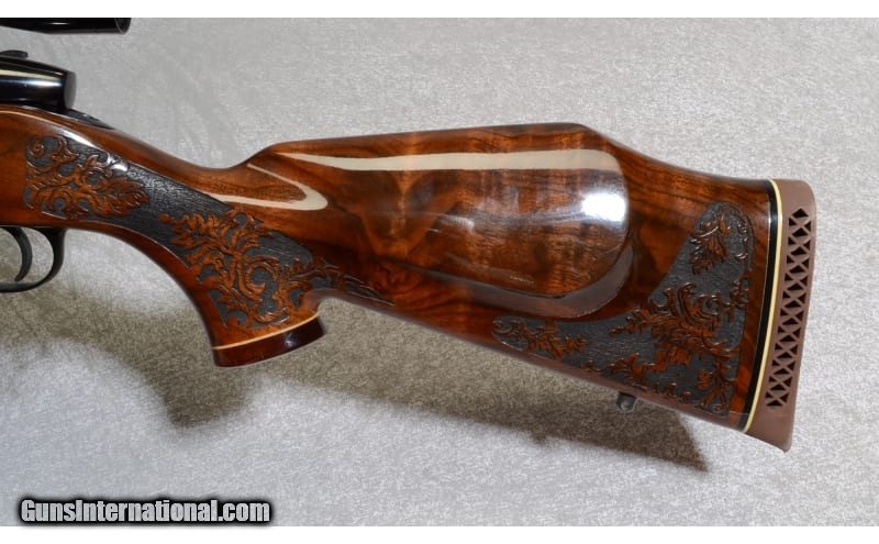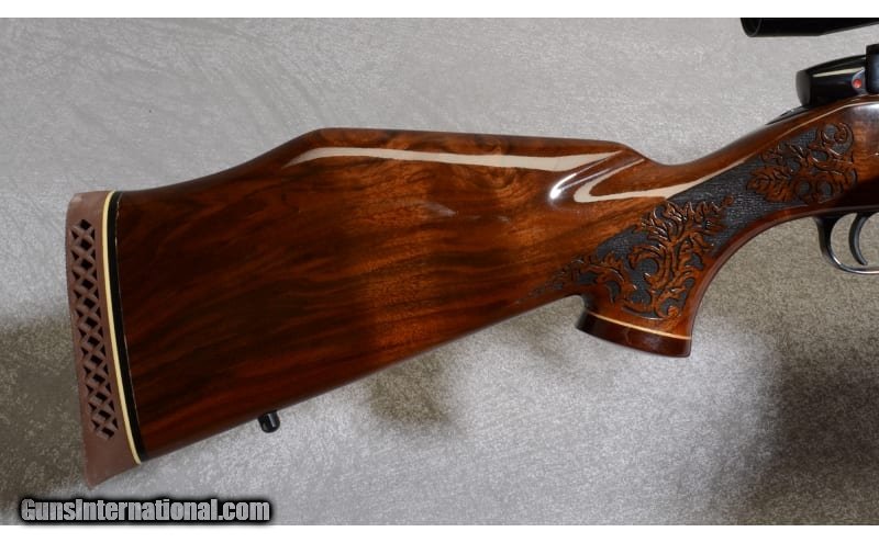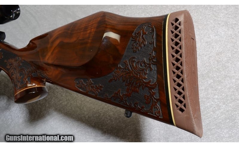 Description: Before composite stocks, brushed stainless steel barrels, and Cerakote finishes every Weatherby Mark V® that fell into the hands of lucky hunters was rich walnut and blue steel. This Weatherby pays homage to those days of traditional craftsmanship for hunters who still marvel at classic styling. Complete with Lazermark Custom Engraving, a rosewood forend and grip cap, maple spacers and a Weatherby recoil pad. Weatherby guarantees accuracy of less that .99" for a group of 3 shots at 100 yards. This gun would make a great addition to any collection. This gun was made in Japan and was imported to the United States by Weatherby 7mm Weatherby Magnum SOLD Metal Condition: Excellent Strong Deep Bluing with one tiny scratch on the muzzle of the barrel. Wood Condition: Fine Deep Featured Walnut with Rosewood Fore Stock and Grip Cap with Maple Spacers Bore Condition: Like new Shiny Bright Barrels: 26" Deep Blued High Polished Stock Dimensions: 13 5/8 Fore End: Fine Walnut with Strong Featuring.The Fore Cap and Grip Cap are Rosewood with Maple Spacer Butt Pad: Weatherby Recoil Pad Weight: 10 Lbs Sights: Leupold 4-12 x 40 Scope Item Location: Tulalip, WA |