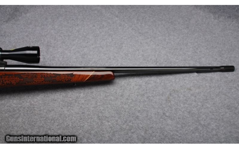 Description: This is a Weatherby Mark V Lazermark rifle in .378 Weatherby Magnum with a 26 inch barrel with a muzzle brake. The action is in Very Good to Excellent condition. The barrel shows some wear on the top, but has a shiny bore. The bottom metal shows some handling. The Lazermark stock is in Very Good condition with some handling evident. The rifle comes with a Weatherby Premier 3-9X40 scope in 2 piece Buehler mounts. The scope and mounts are included in the price odf the rifle and will not be removed, nor will the rifle be re-priced without them. SOLD Caliber Info: .378 Weatherby Magnum Metal Condition: Good with handling wear on the barrel Wood Condition: Good to Very Good with some handling marks Bore Condition: Bright and shiny. Barrels: 26" with Muzzle Brake Stock: Lazermark wood Stock Dimensions: LOP: 13 1/2 Butt Pad: Factory ventilated rubber pad Sights: Weatherby Premier 3-9X40 scope in 2 piece Buehler mounts Item Location: Reno, NV |