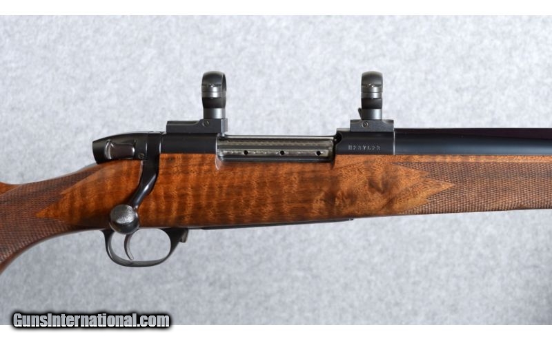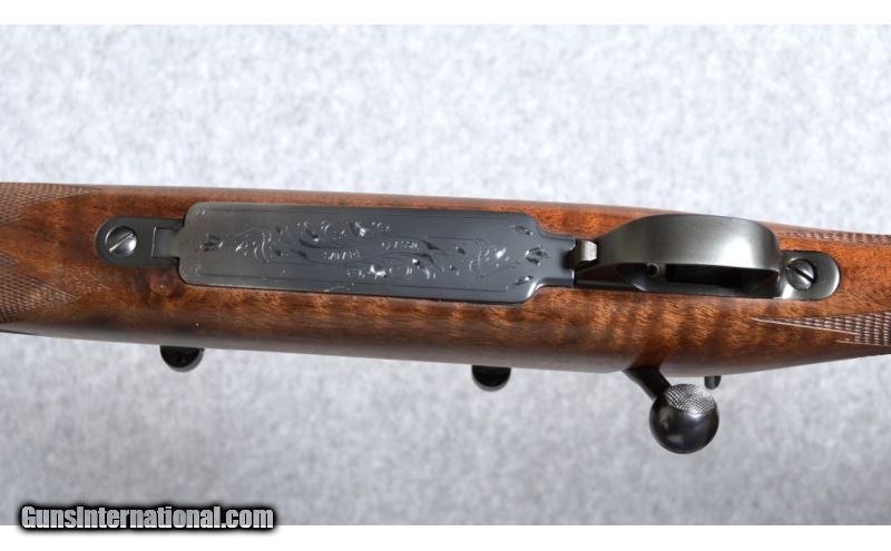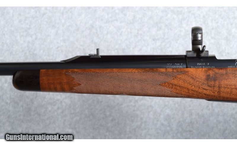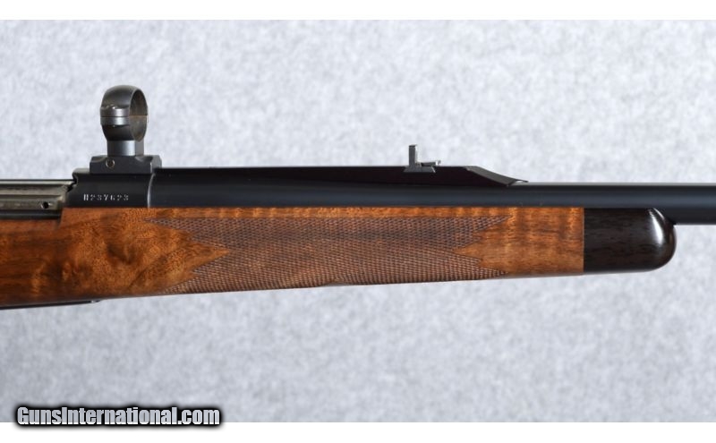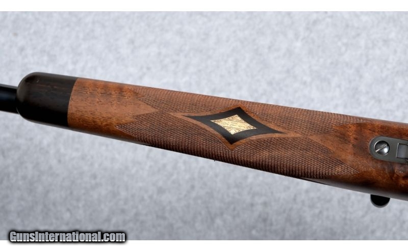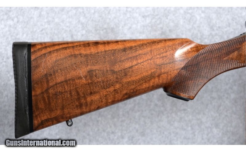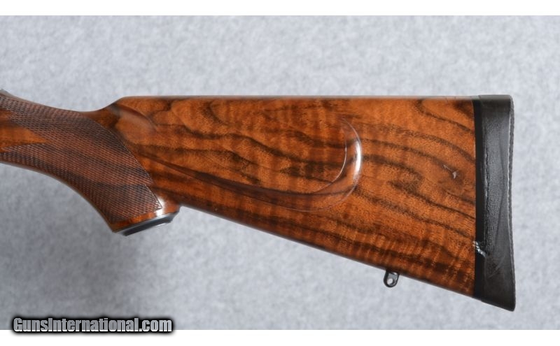 Description: Weatherby Mark V Safari Classic .375 H&H Magnum. This gorgeous and very rare rifle was manufactured in 1992, limited to only 140 units in the Safari Classic series. The rifle features low luster black finish metal components, which includes a 24" #3 contour barrel with a swivel mount-barrel band; quarter rib rear sight with two leafs, one folding, and a ramped, hooded, brass beaded blade front sight; the bolt body and magazine follower are engined tuned (jeweled), and the bolt knob is checkered on top and bottom; the floor plate is engraved with floral and scroll work and includes a banner marked "Safari Classic". The high grade American walnut stock features a satin oil finish; straight comb; shadow line cheek piece; classic-style rounded forend with an ebony cap; a steel grip cap; sling swivel stud and wrap-around pointed checkering. The forend has a gold inlayed Weatherby diamond initial plate with "L.U.D." engraved letters. Length of pull over a Pachmayr Old English recoil pad is 13 3/4" and the rifle weighs 8 3/4 Lbs.Condition: The rifle is in very good overall condition, but has some scratches in the wood and a nick in the barrel. The scratches are in the butt-stock, with five on each side, the most pronounced are the two on the right side. Also, the nick in the barrel is on top, halfway between the front sight and barrel band, and is about an 1/8" long. Also included is a "Weatherby Certificate Of Authenticity" and a pair of Leupold scope bases and quick detach rings. There are a total of 12 photographs on Cabela's gun library . SOLD Manufacturer: 1992 Caliber Info: .375 H&H Magnum Metal Condition: Very good. For more details see "Description" and view all photographs, 12 total. Wood Condition: Very good. For more details see "Description" and view all photographs, 12 total. Bore Condition: Excellent, lightly fired. Barrels: 24" barrel. Triggers: Weatherby. Stock: High grade American walnut. Stock Dimensions: 13 3/4" Lenght of pull. Fore End: Ebony. Butt Pad: Pachmayr Old English recoil pad. Weight: 8 3/4 Lbs. Sights: Quarter rib, two leafs, rear sight, and hooded front. Extras: Includes a Weatherby Certificate Of Authenticity. Item Location: Boise, ID |