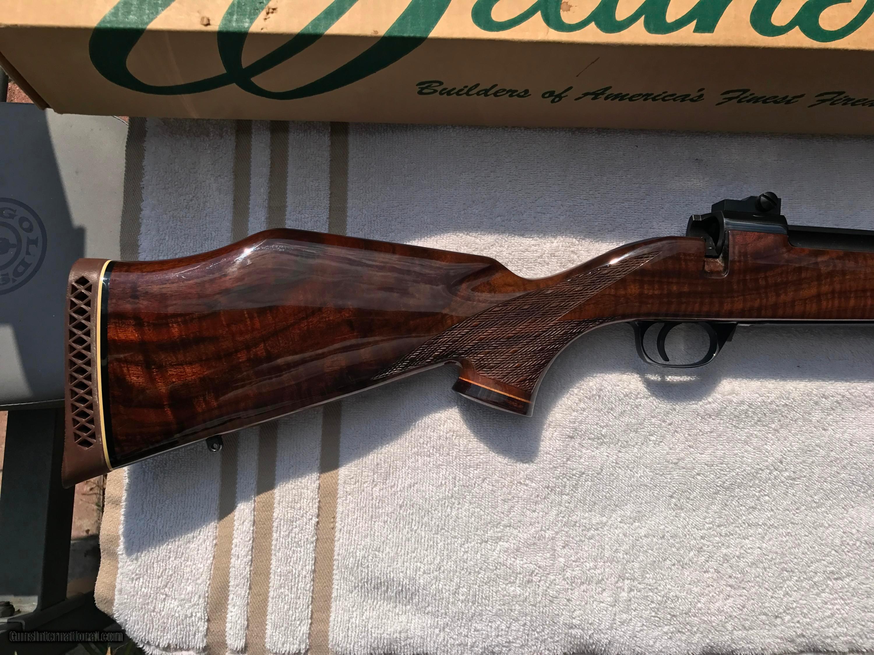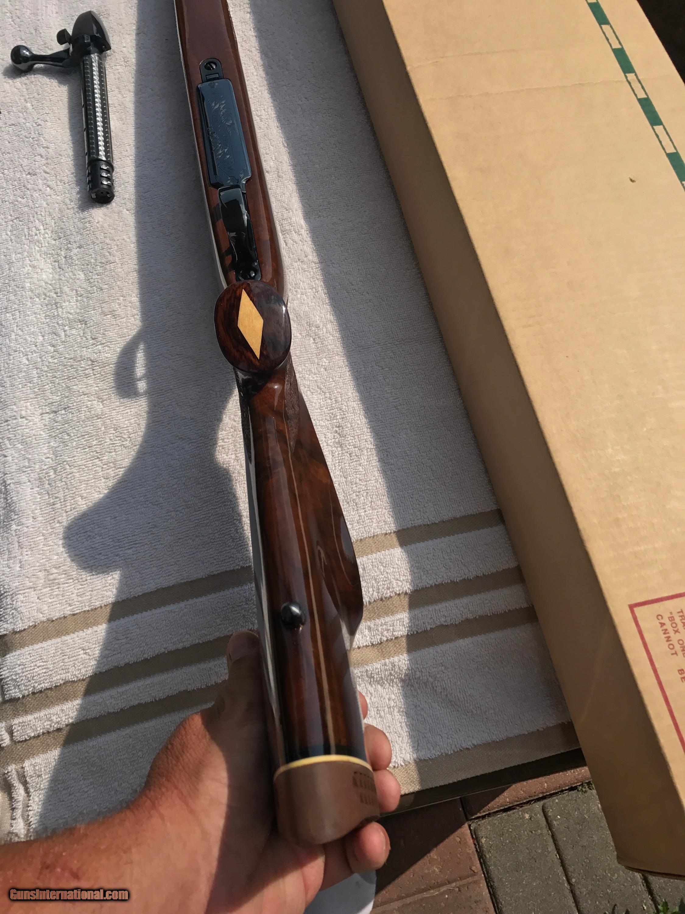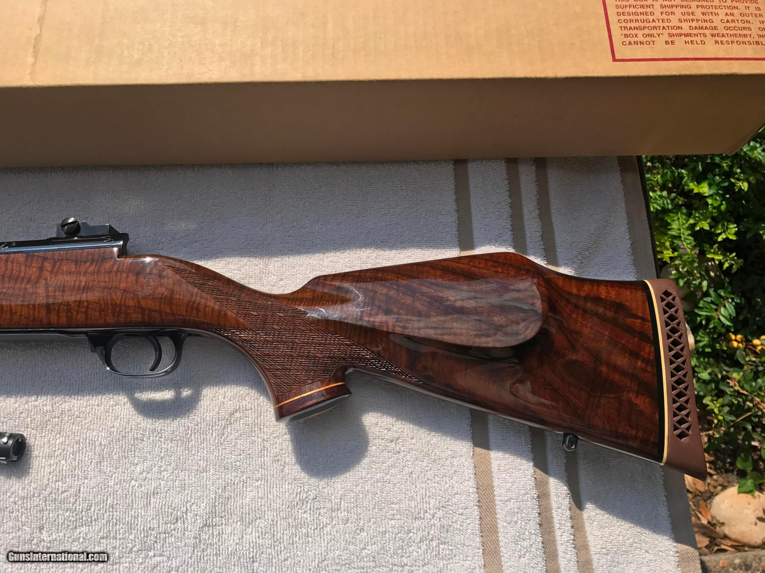 Description: Weatherby Mark V 240 Weatherby Magnum 26" #3 contour Ultramark, Quite possibly unfired, with matching serial numbered box. This rifle is one of the Japan made Ultramarks it is fully glass bedded from Weatherby and has a AA Walnut stock. This rifle was sold to me as unfired, it is mint I see no marks anywhere on it. It could quite possibly be a one of a kind with the #3 .640 muzzle diameter. This rifle has a lot of fiddleback in the wood that will not show up in the pictures, don't miss your opportunity to own a truly collectible Weatherby rifle. Insured shipping is $75. Thanks for looking and please take a look at my other listings. SOLD Manufacturer: Weatherby Model: Ultramark Caliber Info: 240 WBY Bore: New Condition: Mint Metal Condition: Mint Wood Condition: Mint Bore Condition: New Barrels: 26 |