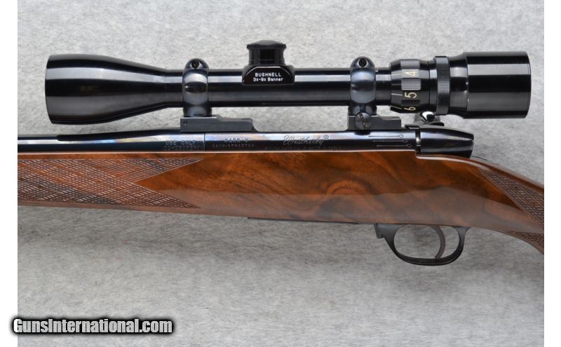 Description: This Weatherby Model Mark V Varmintmaster is a right hand bolt action rifle in .22-250 Rem. Cal. Only. It has a 24 inch barrel. The stock is a diamond checkered walnut pistol grip with a raised cheekpiece. It has a rosewood cap and forearm tip. It is outfitted with a Bushnell Banner 3x-9x Scope. No iron sights. This rifle is in excellent condition. SOLD Manufacturer: Made in Japan. Caliber Info: .22-250 Rem. Only. Chambers: Bolt Action 4+1 with a floorplate. Metal Condition: Excellent. Wood Condition: Excellent with a few minor handling marks. Bore Condition: Excellent. Barrels: 24 inch blued. Triggers: Grooved. Stock: Diamond checkered walnut pistol grip with a raised cheekpiece and rosewood cap. Stock Dimensions: LOP 13 3/8 inches. Fore End: Diamond checkered walnut with a rosewood tip. Butt Pad: Weatherby brown rubber recoil pad. Weight: 7 lbs. 6 oz. with Scope mounted. Sights: Bushnell Banner 3x-9x Scope. No iron sights. Extras: Sling swivel studs. Item Location: Richfield, WI |
