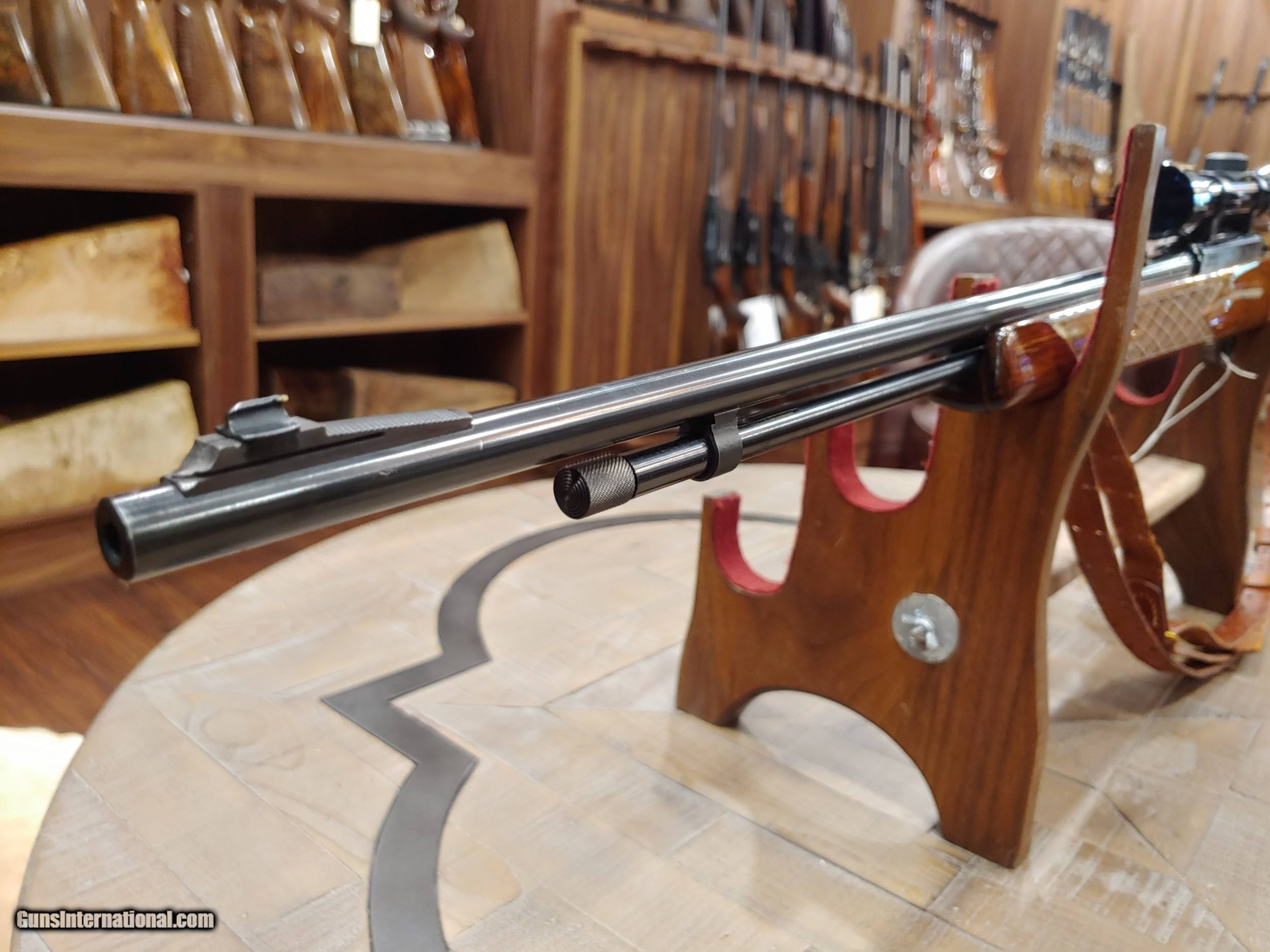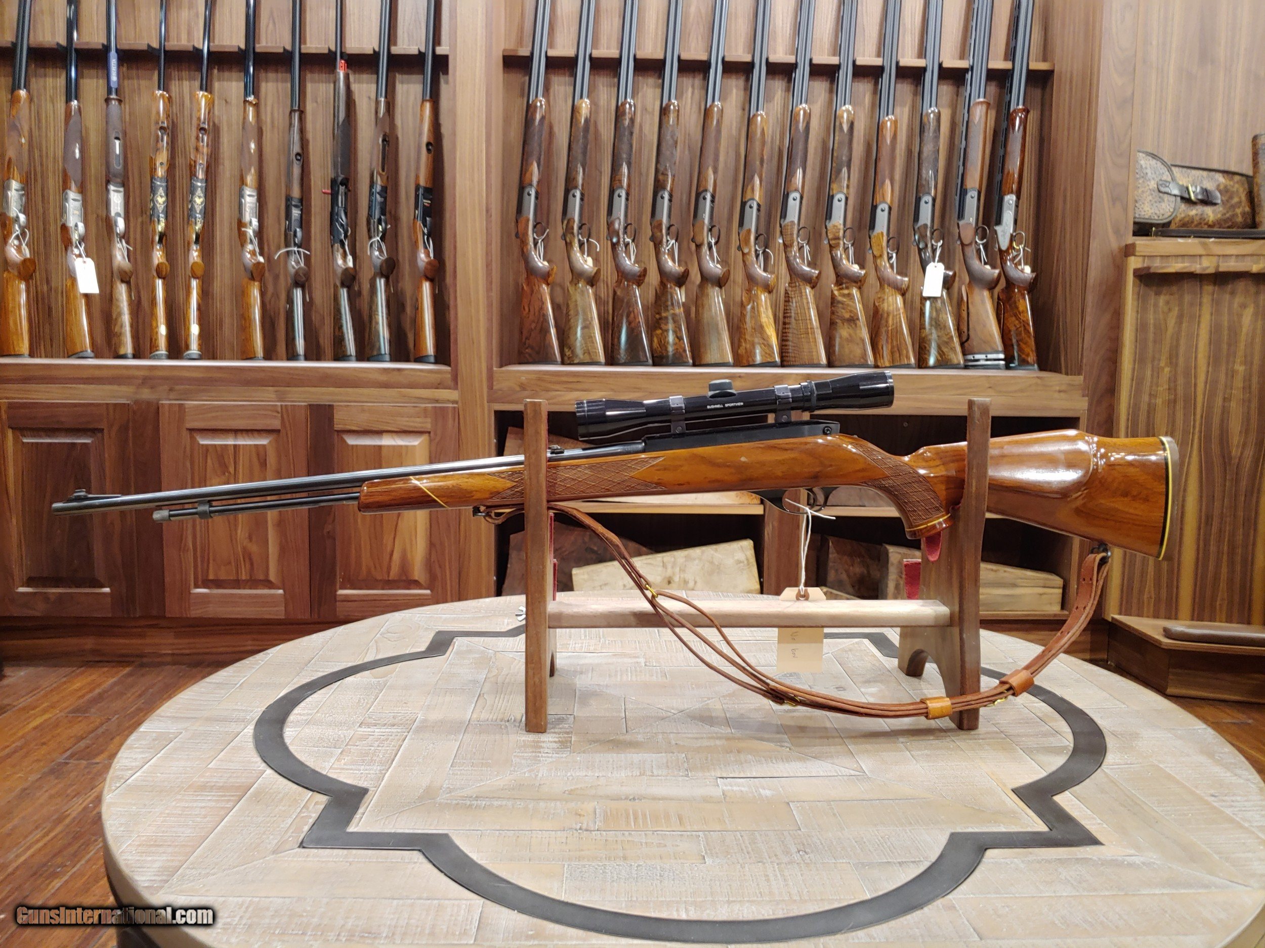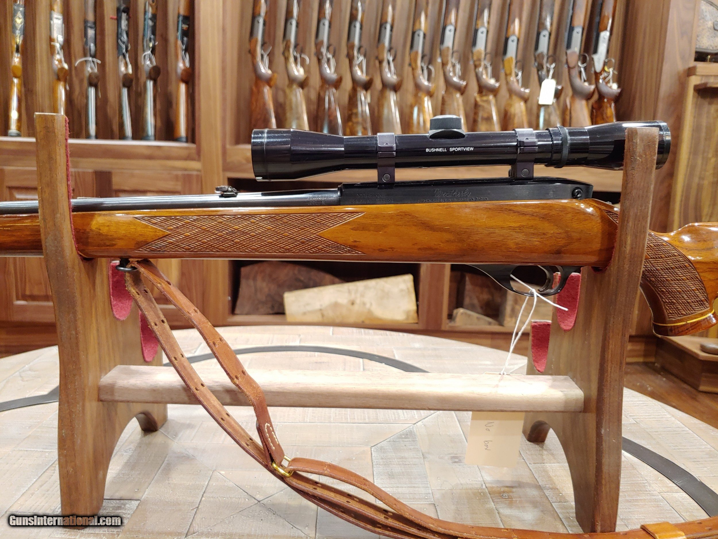 Description: This Weatherby Mark XXII is a 22.25" semi-automatic rifle using .22 Long Rifle rounds. It has an overall length of 42.5" and an LOP of 13.75". Featuring a glossy wood stock, checkered grip and forend and blued finish on the barrel this gun is in excellent condition. Comes with a Bushnell Sportview 4x32 Scope and a leather sling.