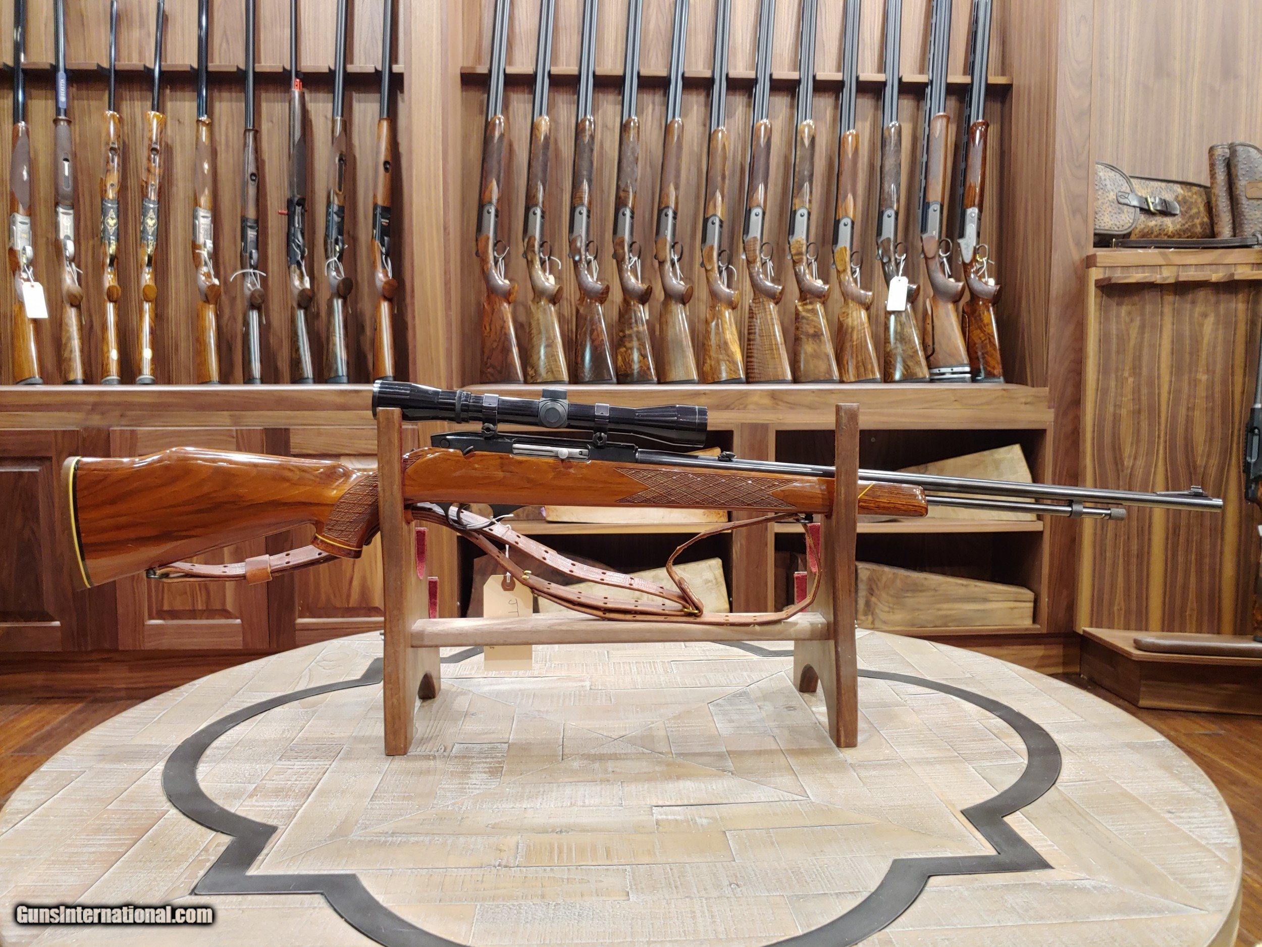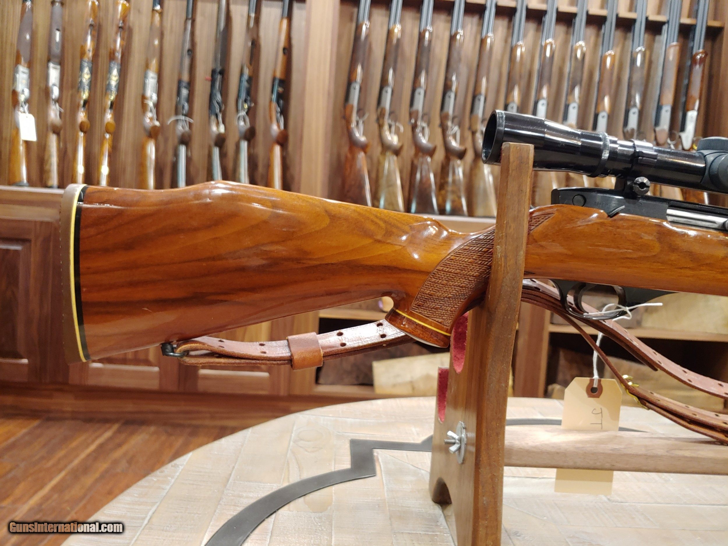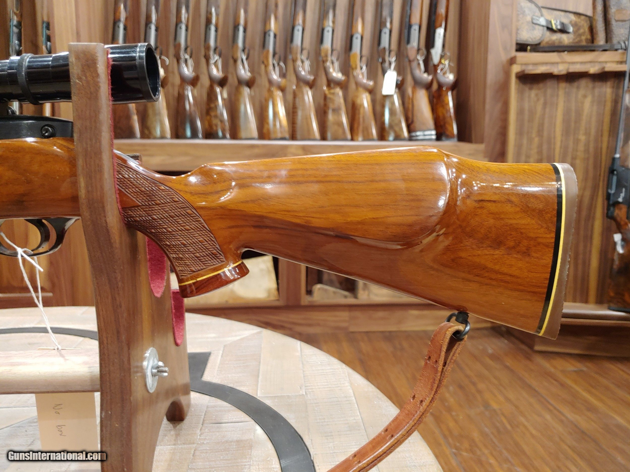 Description: This Weatherby Mark XXII is a 22.25" semi-automatic rifle using .22 Long Rifle rounds. It has an overall length of 42.5" and an LOP of 13.75". Featuring a glossy wood stock, checkered grip and forend and blued finish on the barrel this gun is in excellent condition. Comes with a Bushnell Sportview 4x32 Scope and a leather sling.