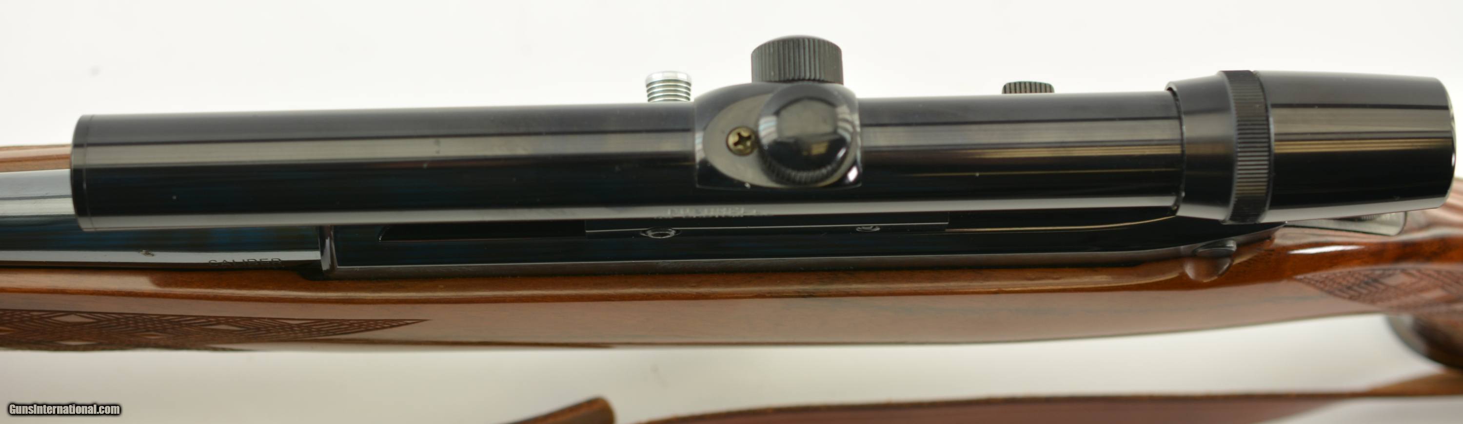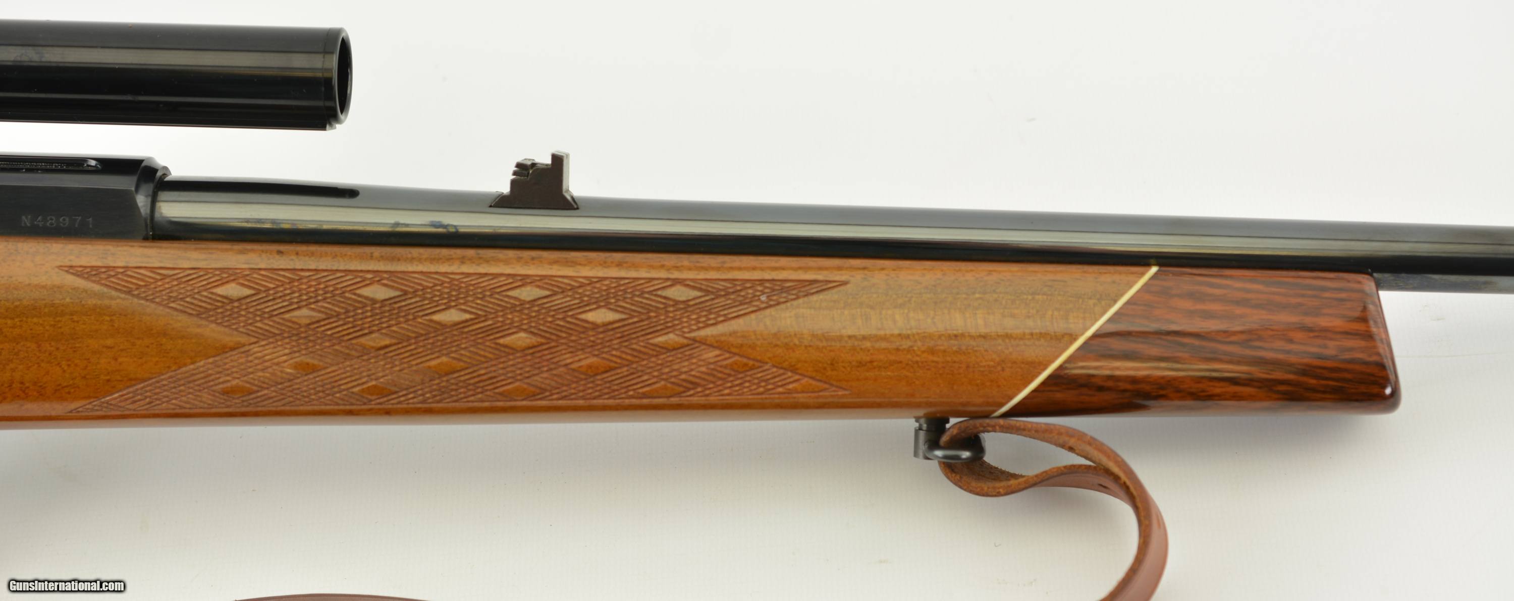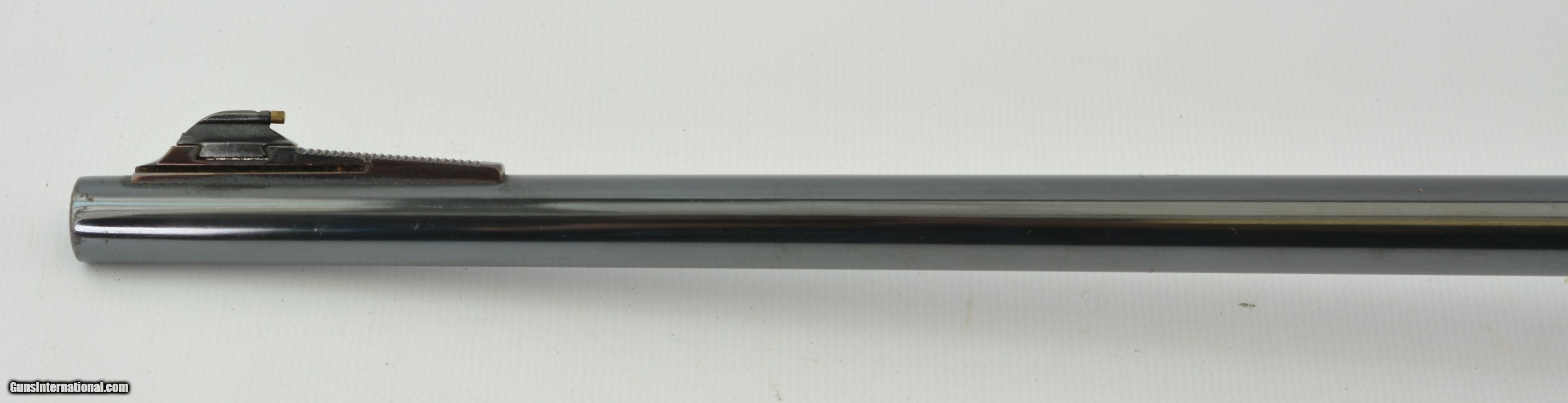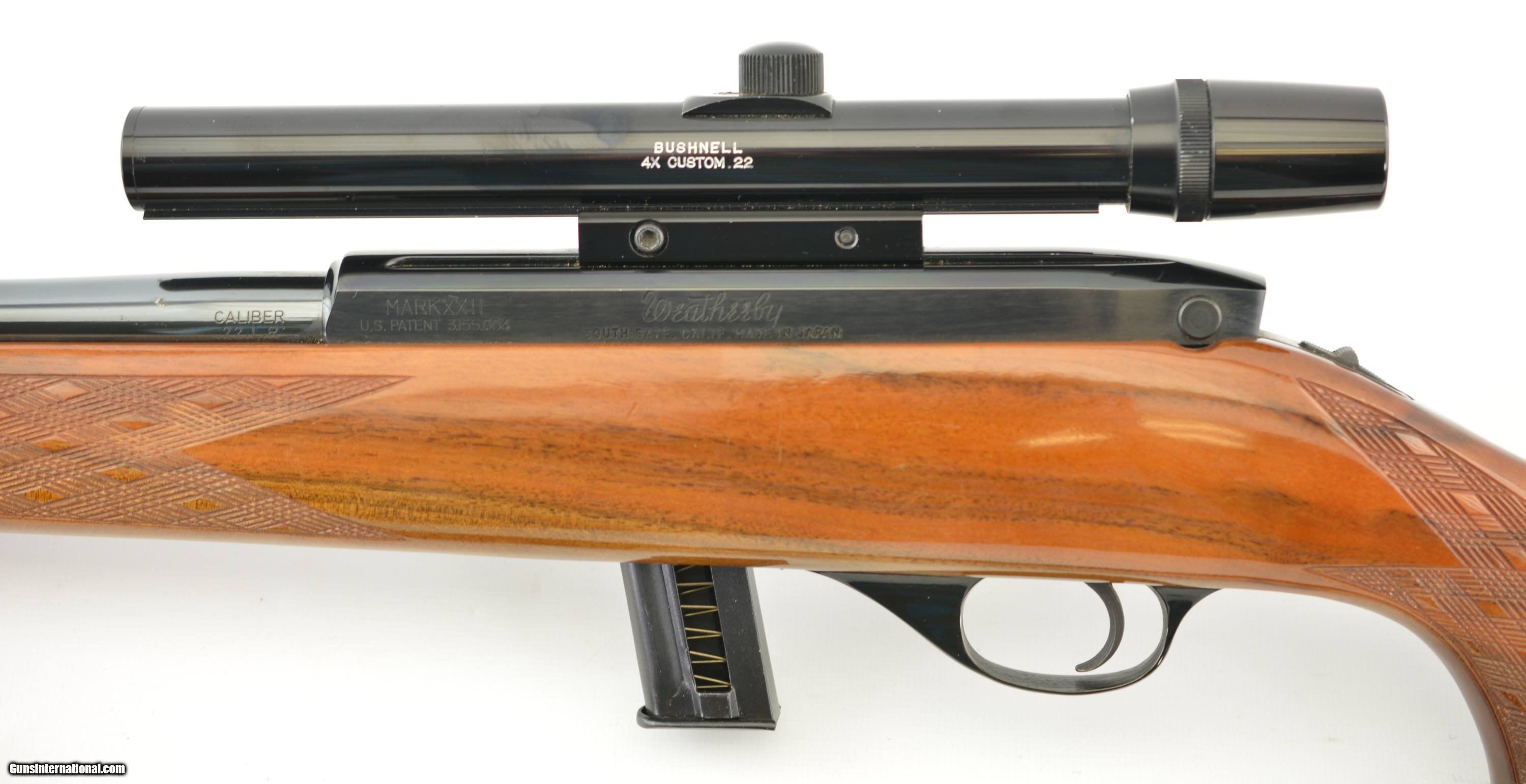 Description: Serial #N48971, .22 LR, 24" barrel with a bright, excellent bore. This is a Nikko Japan produced, Weatherby Mark XXII rifle that has the desirable high quality wood with and laser checkering, spacers between the stock and rosewood forend and grip cap along with the folding rear sight. This gun also sports a Bushnell 4X custom 22 scope and is equipped with the selector to go from single shot to semi-automatic. The rifle is in excellent condition with the barrel, frame and trigger guard retaining virtually all of the original high polish blue finish with some light use marks on the receiver and scattered along the barrel. The stock is in excellent condition with the original high gloss finish still shining with scattered light surface marks, scratches and several surface level cracks on the heel along the top and left edge also surface level scratches on the grip cap. The gun comes with one original 10 round magazine. A beautiful and collectible rifle ready for the woods and display cabinet. FFL SOLD Manufacturer: Weatherby Model: Mark XXII Caliber Info: .22 LR Gauge Info: .22 LR |