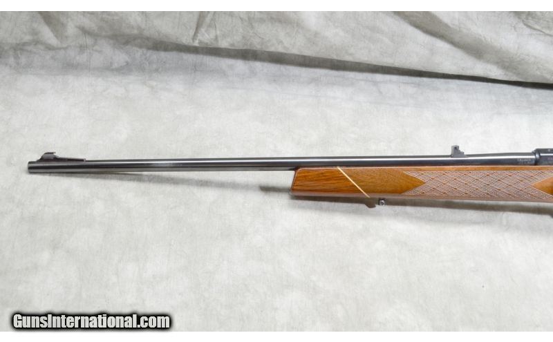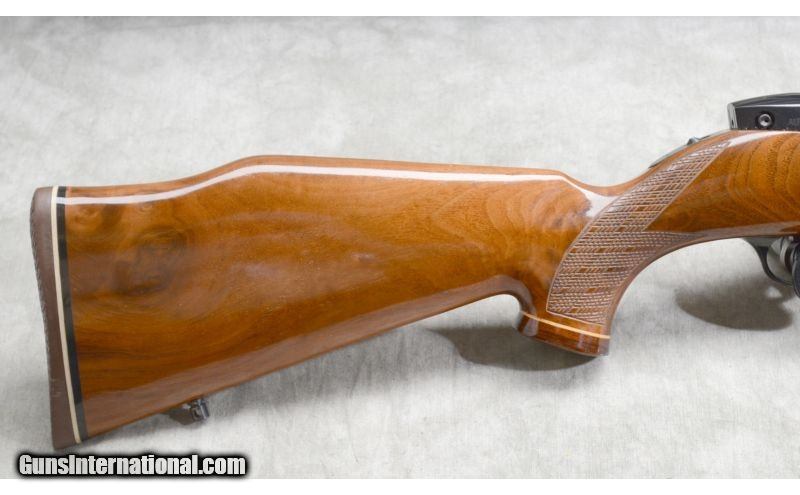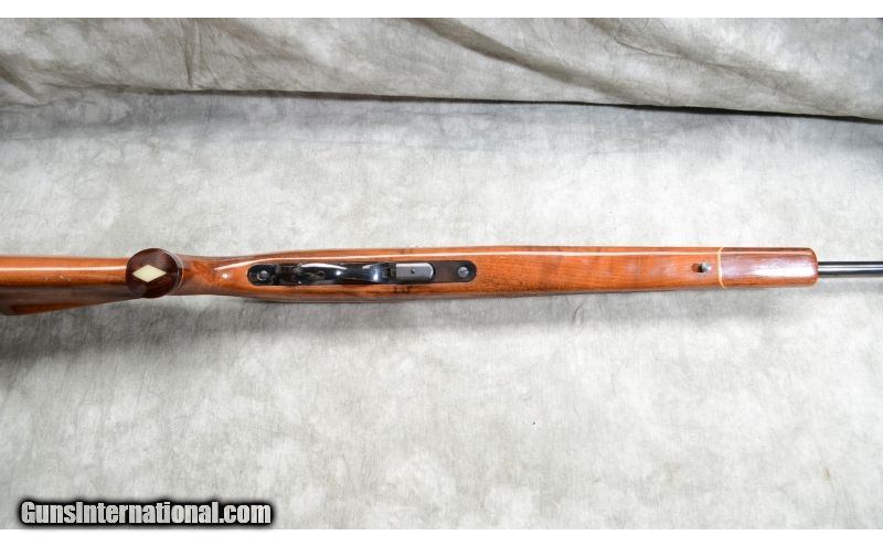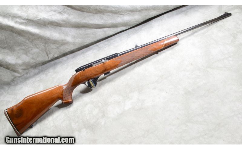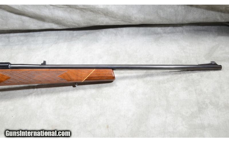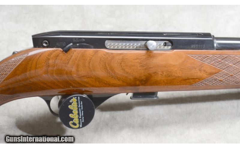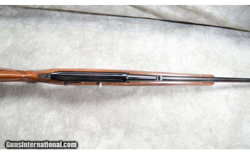 Description: This handsome .22 semi-automatic rifle features glossy high grade walnut with Monte Carlo comb and cheek piece, Rosewood caps on the tip and grip, and express rifle sights. SOLD Caliber Info: .22 long rifle. Chambers: Detachable 5 round magazine. Metal Condition: Very good to Excellent. Safety has made a mark on the receiver. Wood Condition: Very good. There are a number of scratches on the sharp edges primarily. Nothing severe. Bore Condition: Shiny and bright with good rifling. Barrels: 24 inch blue barrel with sights. Triggers: Factory trigger. Stock: Checkered walnut Monte Carlo pattern with slightly elevated rolled over comb and cheek piece. Stock Dimensions: 13 - 3/4 Inch LOP. Fore End: Triangular cross-section with tip cap. Butt Pad: Rubber pad. Weight: 5 lbs. - 13 oz. Sights: Gold bead and express rifle type folding leaf open sights. Grooved for your choice of optical sight. Extras: One magazine total. Item Location: Rogers,, MN |