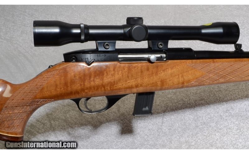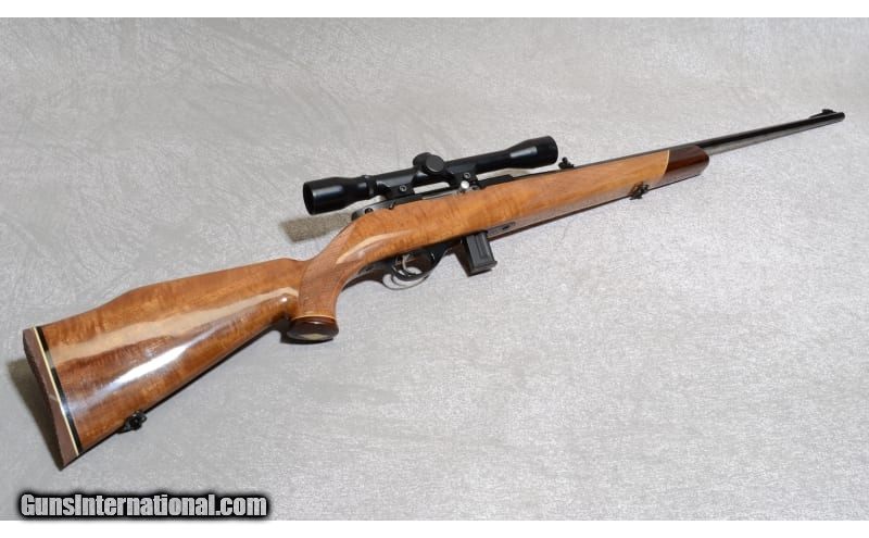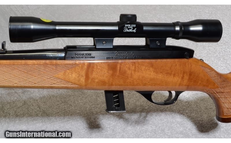 Description: Introduced at trades shows during the winter of 1961–62, the Mark XXII garnered several thousand orders. Unfortunately, manufacturing never caught up. Over the coming decades, manufacturing of the Mark XXII was variously contracted to KGT and Nikko in Japan (1967–80), then in the United States to Mossberg (1979–82), then back to Japan to Howa (1984–88).This gun was made in Japan. .22 Long Rifle SOLD Chambers: Semi Automatic Metal Condition: Excellent Deep Blue with High Polish Wood Condition: Excellent with Rosewood Fore Cap and Grip Cap Bore Condition: Excellent Unfired Barrels: 24 Stock Dimensions: 13 3/4" LOP Fore End: Fine Walnut with Diamond Skip Checkering. Butt Pad: Weatherby Recoil Pad Weight: 7 lbs. Sights: Weatherby Mark XXII 4x50 Scope and Fold Down Iron Sights Item Location: Tulalip, WA |