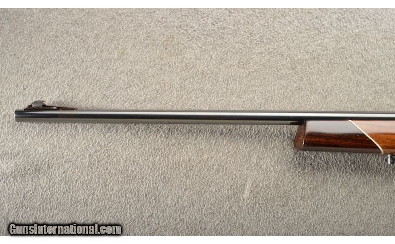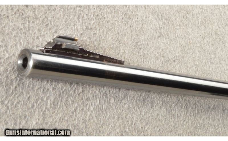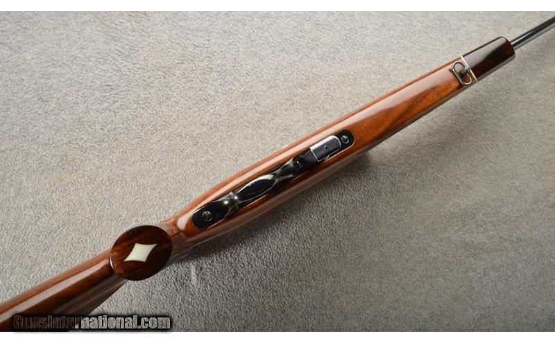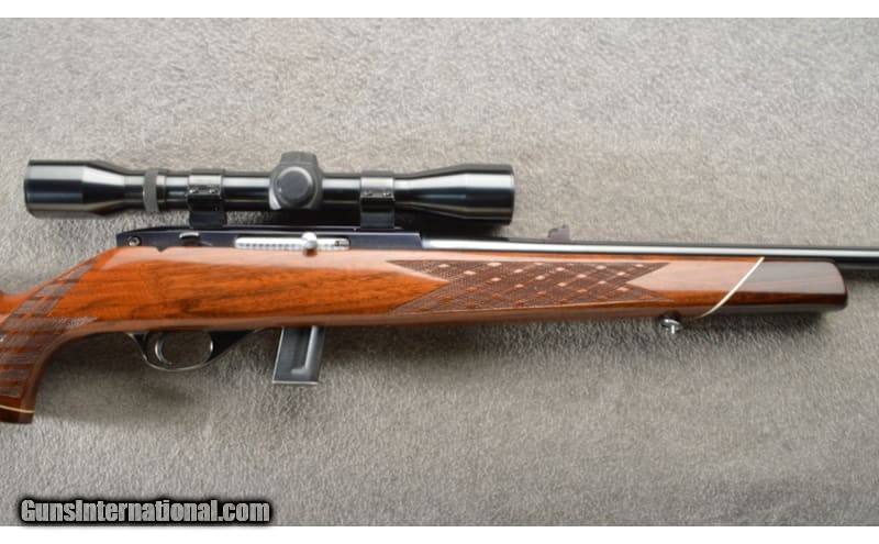 Description: This (Japan) Weatherby Mark XXII is a semi-auto and single shot rifle in 22 LR. Single shot was done by opening the action and loading a single round, then to closing the bolt is done by pushing the right side lever forward to SS (single shot). Semi-auto was done by pulling the right side lever back to the Auto position. The left side of the receiver is marked "MARK XXII / U.S. 3.155.004" and "Weatherby / SOUTH GATE, CALIF. MADE IN JAPAN". The right side of the receiver is marked "N50603". The left side of the barrel is marked "CALIBER / .22.L.R". The front sight is a brass-beaded blade dovetailed into a serrated ramped base. The front sight is grooved for a protective hood "missing". The rear sight is a U-notch with an additional two flip-up leaves for elevation adjustment "75, 100". The stock is high gloss one piece skipline checkered wood with a Monte Carlo comb, pistol grip and cheekpiece. There is a thin brown rubber Weatherby recoil pad with a white and black spacer. The pistol grip has a rosewood grip cap with white spacer and a white diamond piece inlet into its bottom. There is also a rosewood nose cap with a white spacer. There is a sling swivel in the bottom of the belly and on the forend. This rifle comes with 2 magazines that hold 10 rounds. Overall this rifle remains in great condition. .22 Long Rifle Chambers: 10+1 semi-auto and single shot. Metal Condition: About 99% remaining with minimal handling wear. Wood Condition: "The stock shows a few scattered light marks, nothing major. The stock rates about 97% remaining. Bore Condition: Bright bore with very strong rifling. Barrels: 24" barrel. Triggers: Single trigger. Stock Dimensions: LOP 13 5/8". Fore End: Checkered. Butt Pad: Rubber. Sights: Drift adjustable sights with Weaver scope and rings. Item Location: Owatonna, MN Price: $1,299.99 Contact Seller |