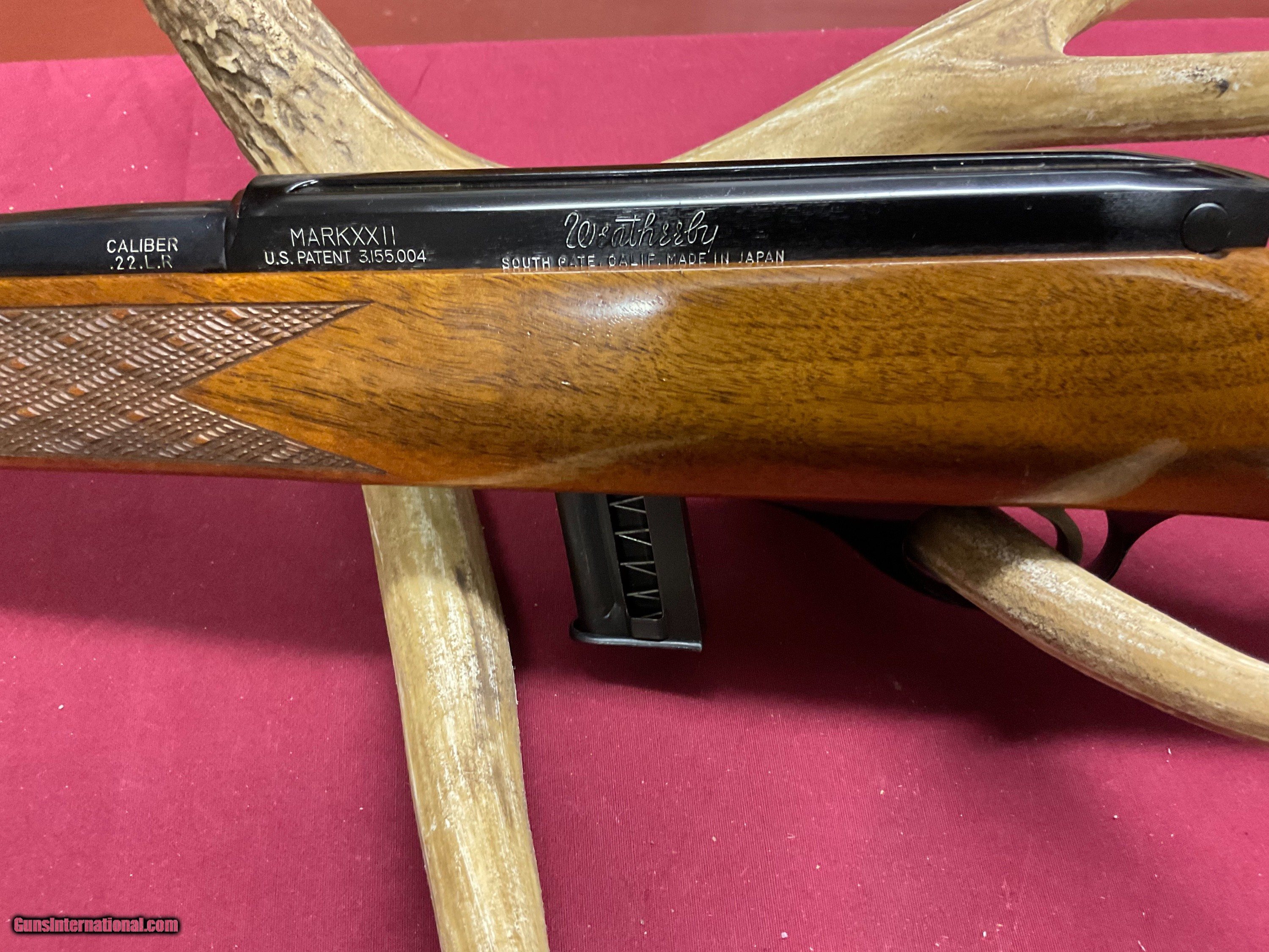 Description: You're looking at the rifle that raised the standard bar for semi auto rifles. From standpoint of ,( from the factory ), reliability, accuracy. workmanship, appearance, balance, versatility, no other gun comes close !! You can tell this the instant you shoulder this gun. For the past 70 years, many , published,comparison ratings by gun users,overwhelmingly rate the Weatherby as very best . This gun is no exception. Not new, but 98%er. Been fired but very little. The previous owner became ill and never did more than zero it. There are couple handling marks . Nothing into wood. It is semi auto OR single shot (just flip a switch). Great wood with great cut checkering. 'Clean inside and out. Shows no sign of wear or being in rain, etc. 24" barrel, clip fed. You can't go wrong with this Mark XXll. Thanjs, Ed SOLD Rifle Caliber: .22 Long Rifle Manufacturer: Weatherby Model: XXll Serial Number: N56753 Barrel Length: 24 Condition: Excellent Metal Condition: Excellent Wood Condition: Excellent Bore Condition: Excellent Manufacture Date: 1974’ish Engraving: Skip line cut checkering |