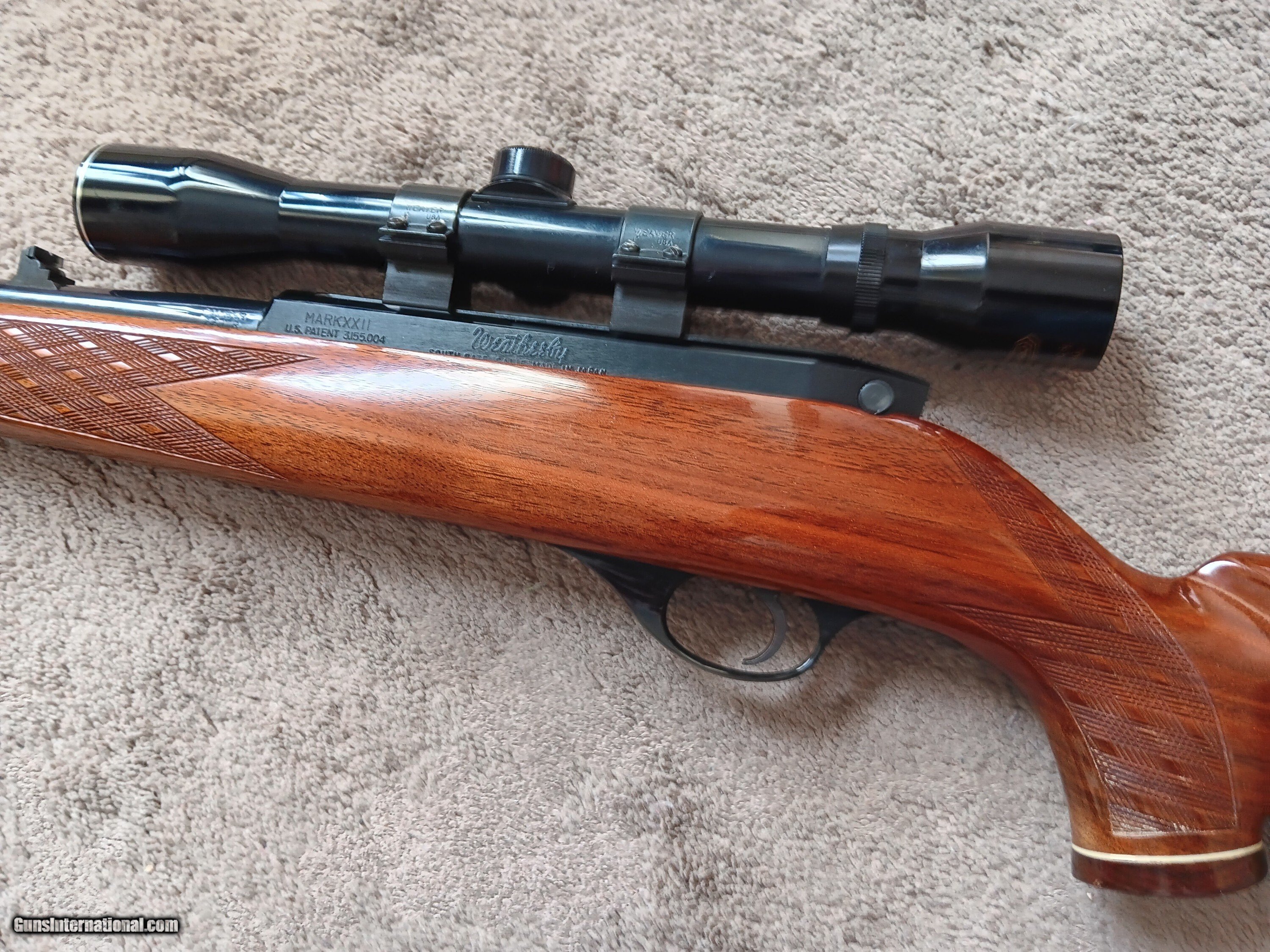 Description: Weatherby Mark XXll .22 lr tube fed. Has excellent, beautiful dark wood, Bianchi leather sling, and 4 x 32 scope. A real "Collectors Dream" $1250.00 plus $50.00 shipping to your FFL Dealer! Rifle Caliber: .22 Long Rifle Manufacturer: Weatherby Model: Mark XXII Barrel Length: 24 Condition: Excellent Price: $1,250.00 Contact Seller |