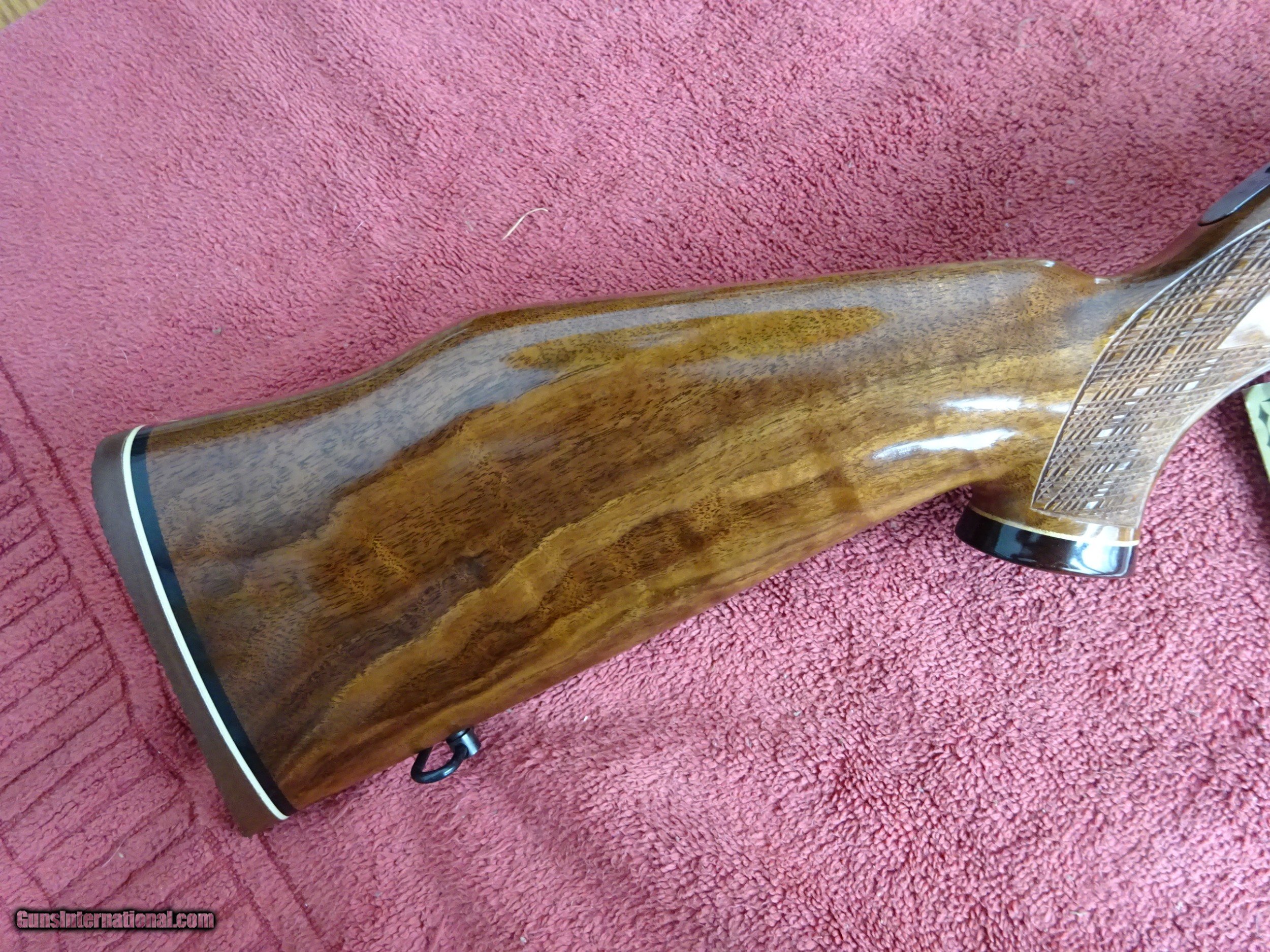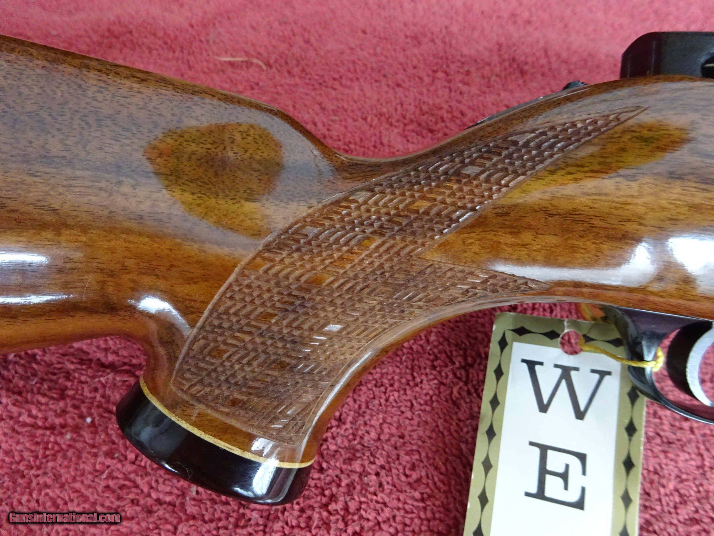 Description: WEATHERBY MARK XXII, 22 LONG RIFLE. SEMI-AUTO TUBULAR MAGAZINE, RAMP FRONT SIGHT, FULLY ADJUSTABLE REAR SIGHT. LEVER TO CONVERT TO SINGLE SHOT, TANG SAFETY. PISTOL GRIP MONTE CARLO STOCK, SKIP LINE CHECKERING, ROSEWOOD GRIP CAP AND FOREND CAP. FACTORY BUTT PAD AND SING SWIVELS, GORGEOUS HIGHLY FIGURED WOOD, VERY ATTRACTIVE GRAIN AND COLOR. THE RIFLE IS VIRTUALLY NEW IN THE ORIGINAL BOX, WITH NO WEAR OR HANDLING MARKS ANYWHERE ON THE GUN. THIS GUN IS FAR MORE ATTRACTIVE THAN THE TYPICAL MARK XXII. INCLUDES THE ORIGINAL HANG TAG. THE ORIGINAL BOX IS IN VERY GOOD CONDITION. MADE IN JAPAN, 1984 TO 1988. $1750.00 + $60.00 Insured shipping to an FFL address. Layaway is available. See all Pats gun listings on this site! We also have hundreds of pieces of ORIGINAL gun company advertising & memorabilia available for sale on our site SPORTINGCOLLECTIBLES. We have no reprints or reproductions. Email for more information. SOLD |