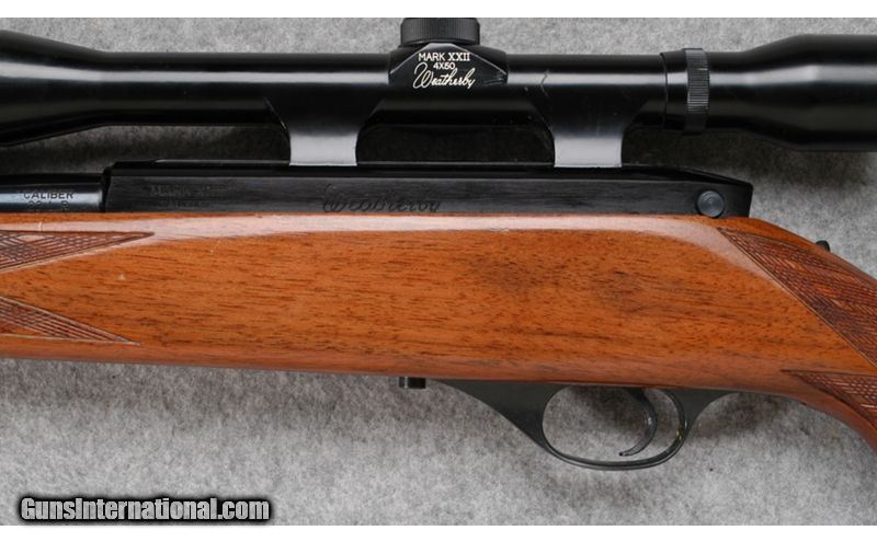 Description: .22 Long Rifle SOLD Chambers: Semi-auto repeater. Metal Condition: Very good. Wood Condition: Very good. Bore Condition: Very good. Barrels: 24"", blued. Triggers: Single. Stock Dimensions: 14" LOP. Butt Pad: Rubber pad. Weight: 7 Lbs. 2 Oz. Sights: Factory iron/Weatherby Mark XXII scope. Item Location: Dundee, MI |