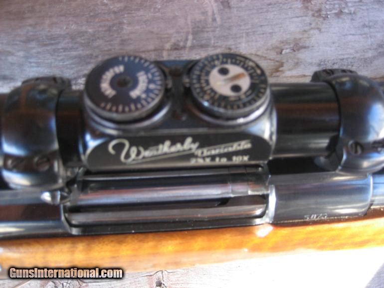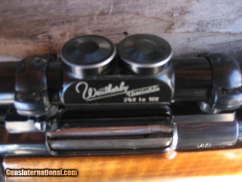 Older four digit 1952-1953 made before Roy invented the Mark 5 Action. The wood is in very good shape with scratches on the right side of the fore end tip and left rear side of the stock, all pictured. I would rate the stock at 95% condition with a 13 1/2 LOP. The metal is in excellent shape except for the floor plate and minor rubbing at the end of the barrel from taking it in and out of a case over the past 60 years. The barrel length is the more desirable 26 incher.Over all except for the floor plate in 98% rust free condition. The bore is as new checked with a Hawkeye Bore Scope. It comes with probably the original Weatherby 2 3/4x10 scope. The scope is clear with fine cross hairs. The scope tube looks like the scope slid forward at some time in its life and marked up the scope tube. The worst that I can say about this rifle is that the scope ring screw heads are messed up. Over all this is an original untouched collectible, shootable rifle that was carried a some shot very little, but the bore cleaned well cared for after shooting. Three day no shoot no messing with inspection period. If returned purchaser pays all shipping plus a 10% fee as I have described this rifle and scope in great detail with pictures. Shipping insured for $95.00 in a hard case.