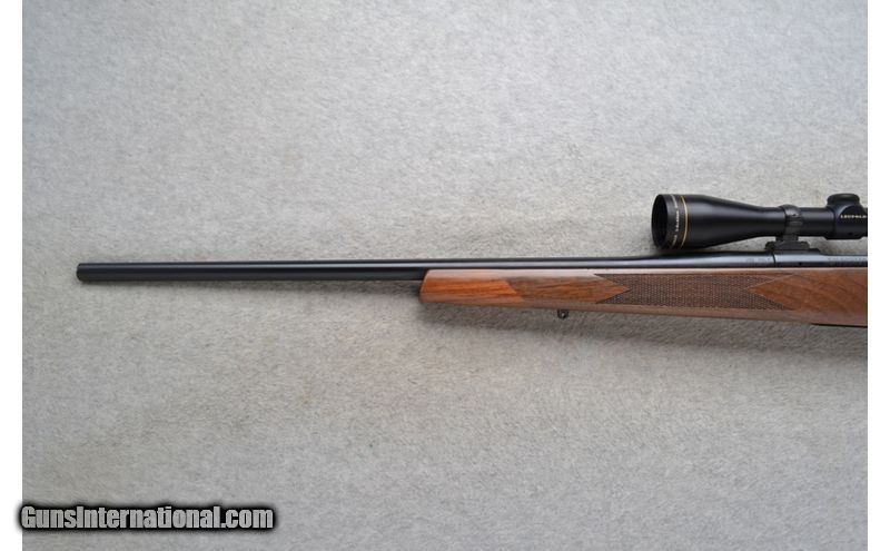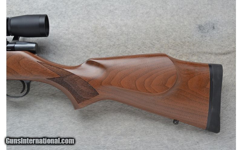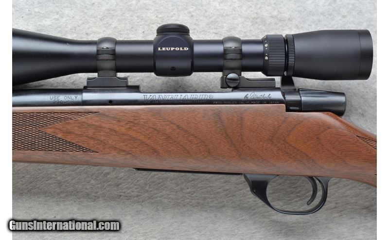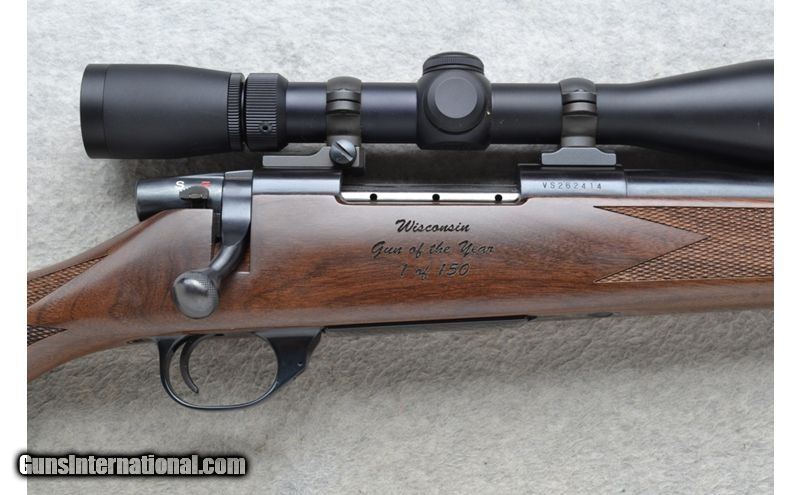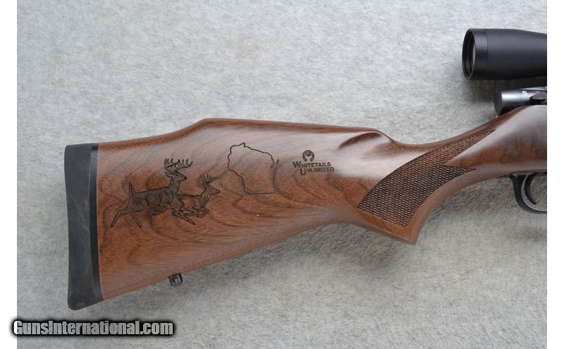 Description: This Weatherby Model Vanguard is a right hand bolt action rifle in .270 WSM Cal. Only. It is a Whitetails Unlimited 1 of 150 Wisconsin Gun of the Year Edition. It has a 24 inch barrel. It is outfitted with a Leupold 3-9x40mm Scope. The butt stock is a checkered grip walnut pistol grip with a raised cheek piece. The forearm is a checkered grip walnut with a rosewood tip. There are laser cut details on the right side butt stock and below the receiver. .270 WSM SOLD Chambers: Bolt Action hinged floor plate 4 round magazine. Metal Condition: Excellent. Wood Condition: Excellent. Bore Condition: Excellent. Barrels: 24 inches. Triggers: Grooved. Stock Dimensions: LOP 13 1/2 inches. Fore End: Checkered grip walnut with a rosewood tip. Butt Pad: Weatherby rubber recoil pad. Weight: 8 lb. 10 oz. Sights: Leupold Rifleman 3-9x40mm Shotgun/Muzzle Loader Scope. No iron sights. Item Location: Richfield, WI |