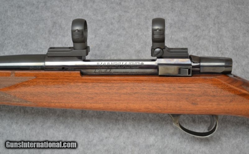 Description: Made in Japan SOLD Manufacturer: V05xxx Caliber Info: .30-06 Metal Condition: Very good with normal handling marks Wood Condition: Good with normal handling marks Bore Condition: Very good Barrels: 24 Stock: Checkered hardwood with exotic wood white diamond grips cap Stock Dimensions: LOP: 13 3/8 Fore End: Checkered hardwood with exotic wood forend tip Butt Pad: Weatherby brown rubber pad Weight: 8 lbs., 3 oz. Sights: Installed bases and rings over hooded front beaed and rear Williams adjustable notch Item Location: Christiana, DE |
