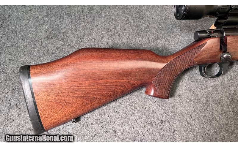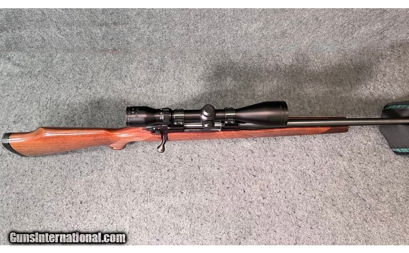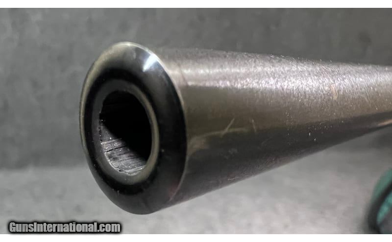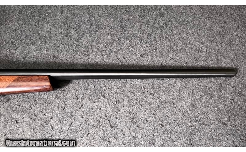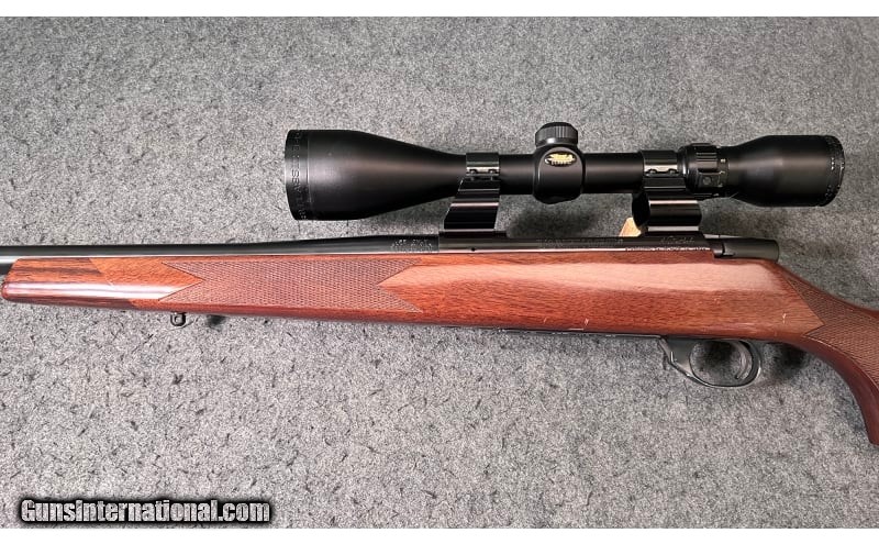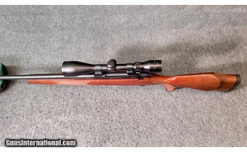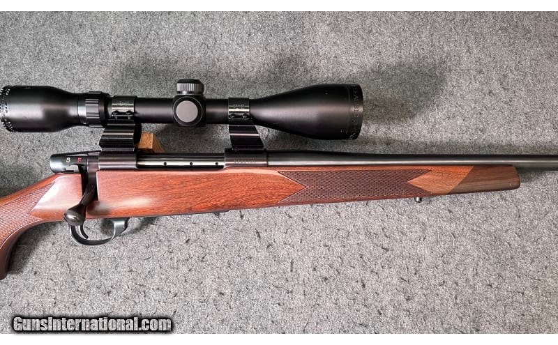 Description: This right-hand Mauser style bolt action rifle is a Weatherby Vanguard chambered in .300 Weatherby Magnum. It has a receiver mounted thumb safety lever, a curved grooved trigger, a Monte Carlo cheek rest stock, a hinged floor plate, a Rosewood tipped, diamond checkered fore arm, a diamond checkered pistol grip stock with a thick black rubber butt pad with black spacer, and a swept back, textured ring bolt handle. The bluing is in excellent condition with some slight thinning at the muzzle, and with some loss on the floor plate and trigger guard. The high gloss wood finish is in very good condition with a few light handling marks, but with no chips, cracks or scratches noticeable. The bore is bright and shiny with strong rifling intact. .300 Weatherby Magnum SOLD Metal Condition: "Bluing is in excellent condition with some slight thinning at the muzzle, and with some loss on the floor plate and trigger guard Wood Condition: "High gloss wood finish is in very good condition with a few light handling marks, but with no chips, cracks or scratches noticeable Bore Condition: Bore is bright and shiny with strong rifling Barrels: 24 inch barrel Triggers: Curved grooved trigger Stock Dimensions: "13⅝ inch LOP, overall length 44½ inches Fore End: "Rosewood tipped, diamond checkered fore arm Butt Pad: Thick black rubber butt pad with black spacer Weight: 9 lb 0 oz Sights: BSA Classic 3 - 12 X 50 riflescope Item Location: Wichita, KS |