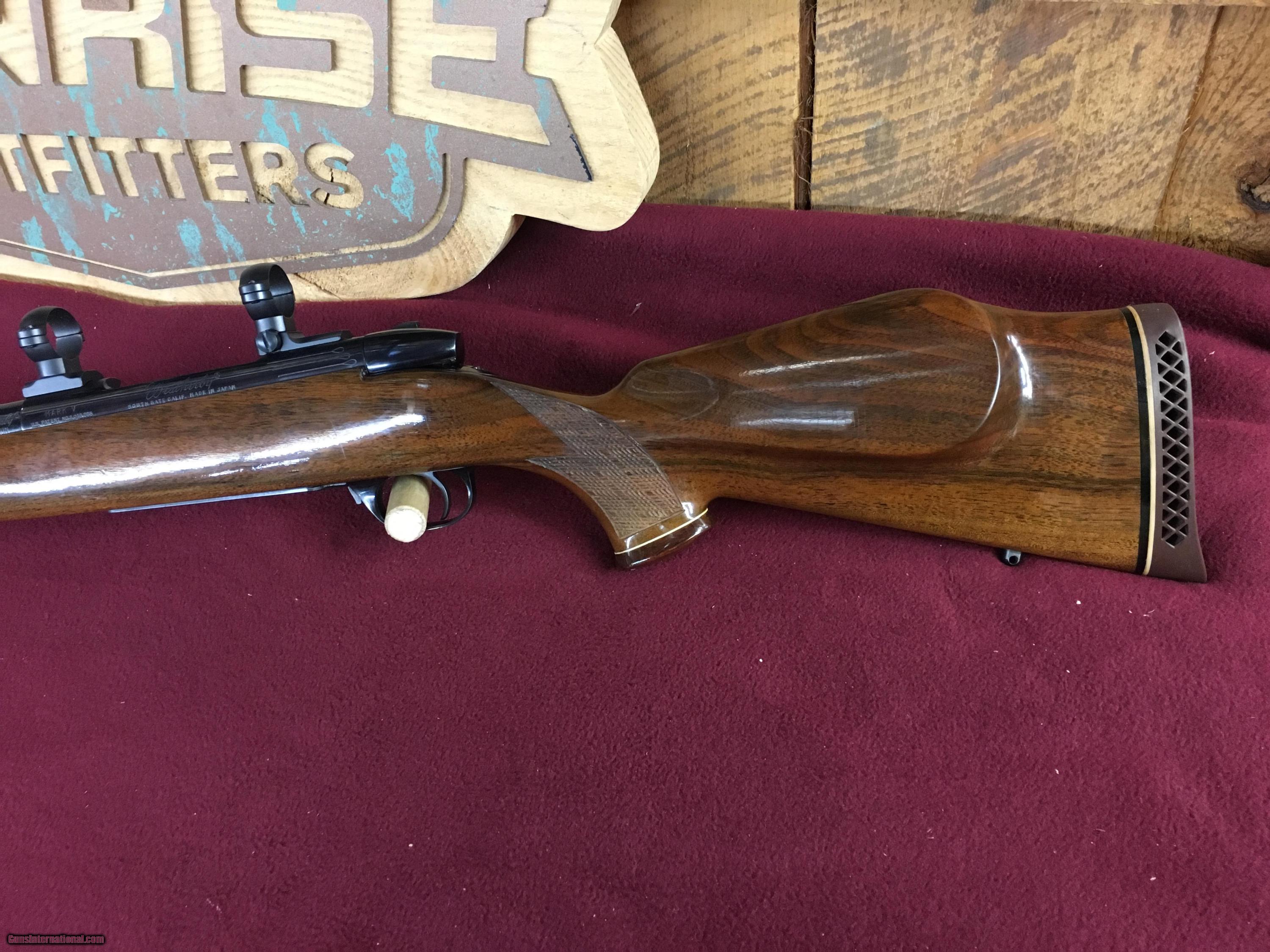 Description: Weatherby Mark V Deluxe. This is a really nice condition rifle to be 43 years old. The deep blue on the barrel and action are in about 99% plus. The only issue with any of the finish would be some light freckeling on the floor plate. The wood is excellent with no cracks or scratches.There are a couple of small minor dings from handling. This gun doesn't show much if any signs of use. Chambered in 300 Wby mag with 24 inch barrel. Also included are rings and bases. SOLD |
