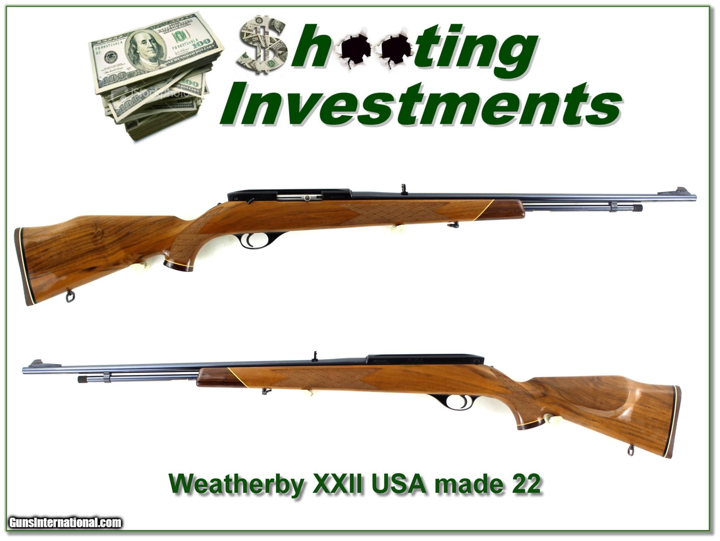 Description: Collectors, this is a rare chance to add a USA made Weatherby XXII to your collection. Only a few hundred of these were made in 1982 by Mossberg for Weatherby. This one is the Tube magazine model. It has beautiful honey colored wood and I don’t find a mark anywhere. No scope ever mounted and if fired, not more than a couple rounds. It is a true Shooting Investment! Shipping and insurance is $59. Please email me with any questions or larger pictures. (Consign your quality firearms with Shooting Investments for only 12%! Let me know if you have any you would like to sell!) 21-1696 Payment: Payment is by Money Order, Cashiers Check or Personal Check. I can now also accept Credit Cards (MasterCard, Visa, Discover & American Express) with a 3% convenience fee. Shipping: The shipping charge will be listed in each description. It is $39 for most firearms. Some heavy guns or those insured for over $2000 will be higher. Shipments to Alaska and Hawaii are higher because air shipment is required. Most firearms are shipped on Tuesday and Thursday and usually in 5 days of receipt of payment. We package all shipments carefully and insure them. Optics are shipped Priority Mail and most other non-firearm shipments are shipped First Class. Returns: Our return policy is simple. If for any reason you are not pleased with your purchase, you may return your item for a full refund of purchase price. Ammunition cannot be returned. It is important to us that you are happy. Guns cannot be fired or dissembled before returning them and they must be returned in the same condition as received. Notification of a return must occur with-in 3 days of receipt at your dealer. Shipping, convenience and dealer fees are not refundable and are the responsibility of the buyer. Lay-a-way: If needed, we offer a 60 day lay-a-way option on most firearms. It is 1/3 now, 1/3 in 30 days and 1/3 in 60 days. Lay-a-way firearm sales are final and if not completed the first payment cannot be returned. Consigning your firearms with Shooting Investments: We will help you get top dollar for your firearms. While most local guns shops charge 20% or more, our fee is only 12% with a minimum of $75. At your local gun shop it might take months to sell. Selling on-line provides instant access to thousands of interested buyers. You won’t find any other on-line dealer willing to sell your firearms for only 12% or listing every gun on 3 separate s. Selling through an House typically costs the seller 15% and the buyer an addition 15% (so 30%) and you have to wait several months to sell and longer to receive funds. If properly priced, we will sell your firearms in a few weeks. Send us an email or give us a call and we’ll explain how easy it is for you to get top dollar. Trading: Trading for use is really just buying your gun to re-sell. If you have a gun you want to trade, please email a picture and we will let you know what we can give or it. You will always get more if we sell it for you on consignment. Help for California Buyers: We are happy to ship to California. It is the buyer’s responsibility to make sure any item you buy is legal in your state. We are also happy to help with your purchase of a firearm from someone other than us. If you see a gun you would like to buy but the seller can’t or won’t ship to California they can ship to use and we’ll then ship it to your California dealer. The cost for this service is only $30 + shipping. Let us know if we can help! SOLD |