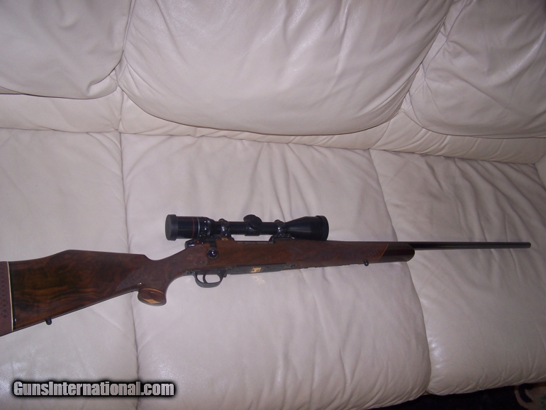 Description: This is a Custom made Weatherby Mark V .340 Magnum rifle with a Weatherby 3x9 Scope. It is one of 2 specifically made with the Food Lion, Inc. logo gold inlay. This rifle has never been fired but oiled and maintained in a fully air conditioned environment. The wood is a pristine walnut with extensive engraving. This rifle comes with the scope and case. Please ask any questions you might have. SOLD |