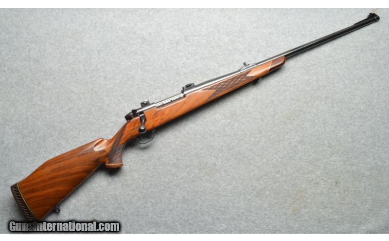 Description: SOLD Manufacturer: Modern manufacture. Caliber Info: .300 Weatherby Mag. Chambers: Bolt action, four round internal magazine with bottom drop unload. Metal Condition: Excellent. Wood Condition: Very good, a few very minor small dents and some of the gloss is faded to a satin finish. Bore Condition: Excellent. Barrels: 26 inch round blue barrel. Triggers: Single stage trigger with bolt mounted safety. Stock: Checkered pistol grip stock with Monte Carlo cheek piece and gloss finish. Stock Dimensions: 14 3/8 length of pull. Fore End: Checkered fore-end matches the stock and has a darker wood accent piece at the end. Butt Pad: Brown recoil absorbing butt pad. Weight: 9 pounds. Sights: Blade front sight with V notch rear sight. Scope bases are mounted on the receiver. Item Location: Berlin, MA |