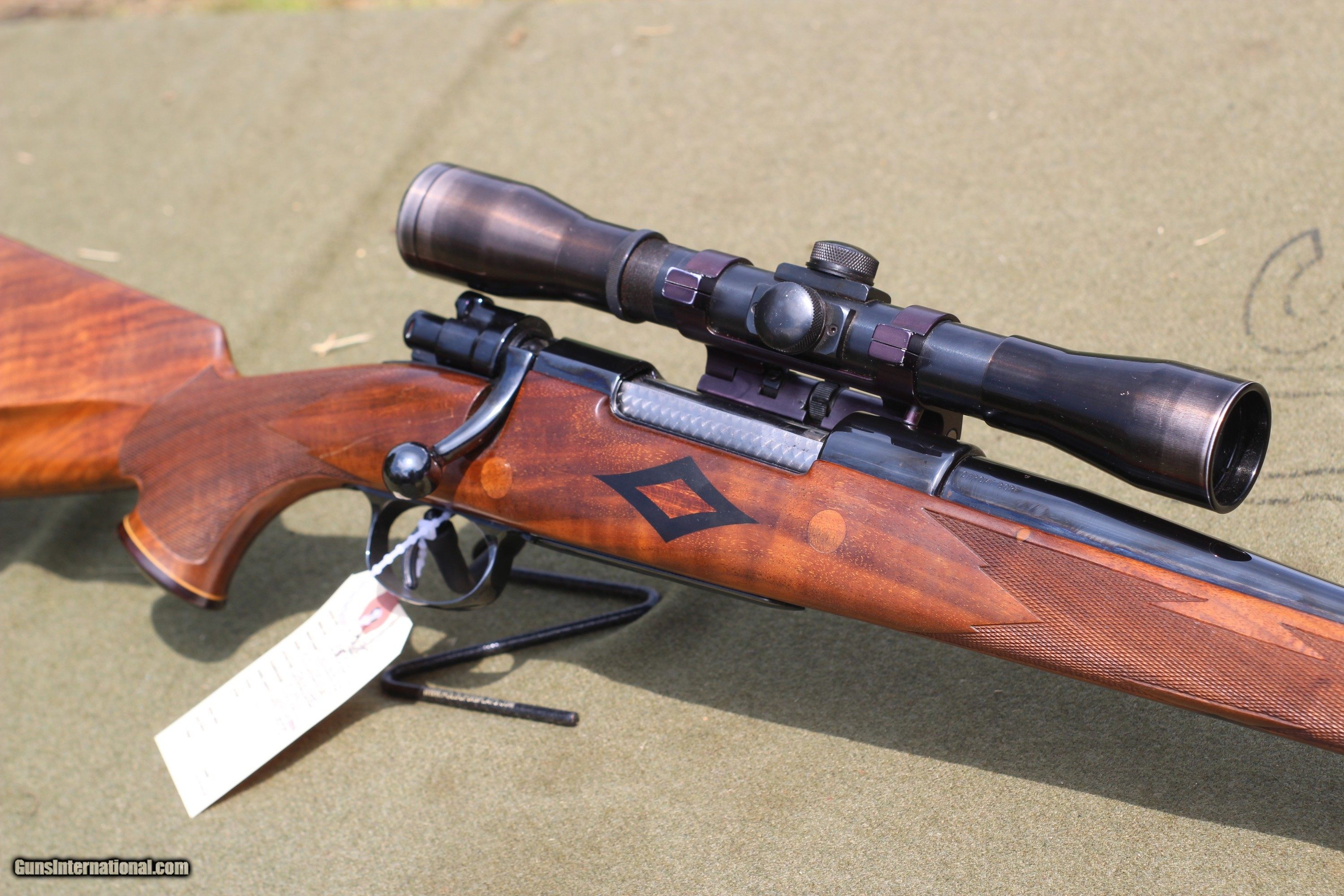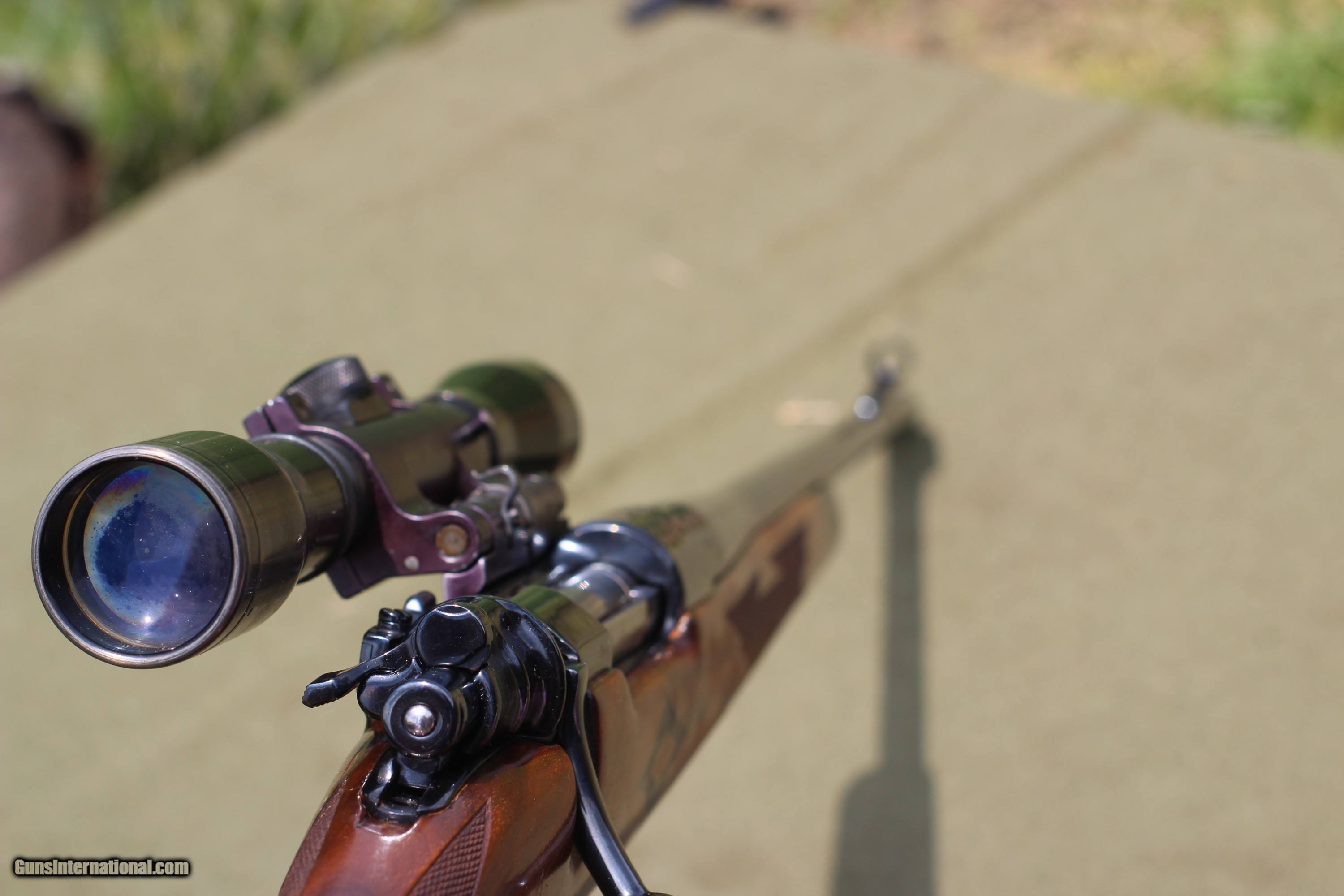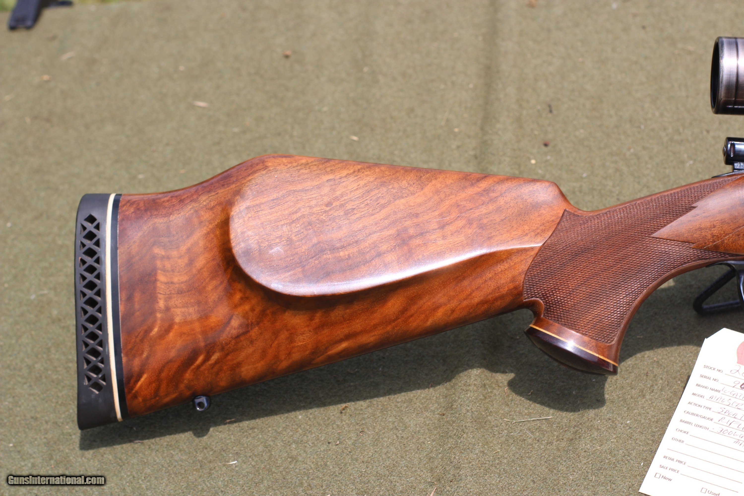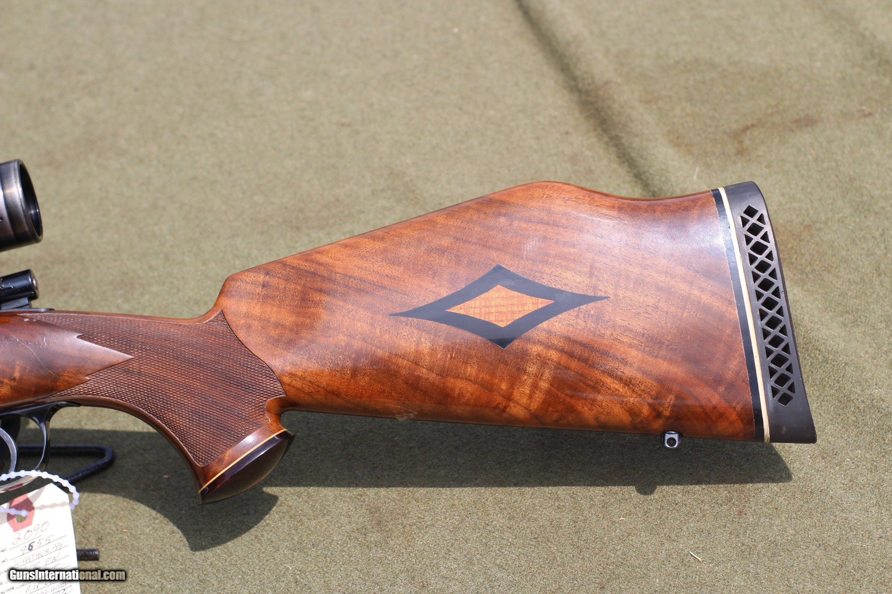 Description: Circa 1952 Serial #9655 23 1/2" barrel with excellent bore High polish bluing with muzzle brake Side mount Pachmyer scope system High grade Claro Walnut wood , with 5 pattern checkering and stock and forend inlays Collectable Weatherby Mauser $ 1995 + Shipping SOLD |