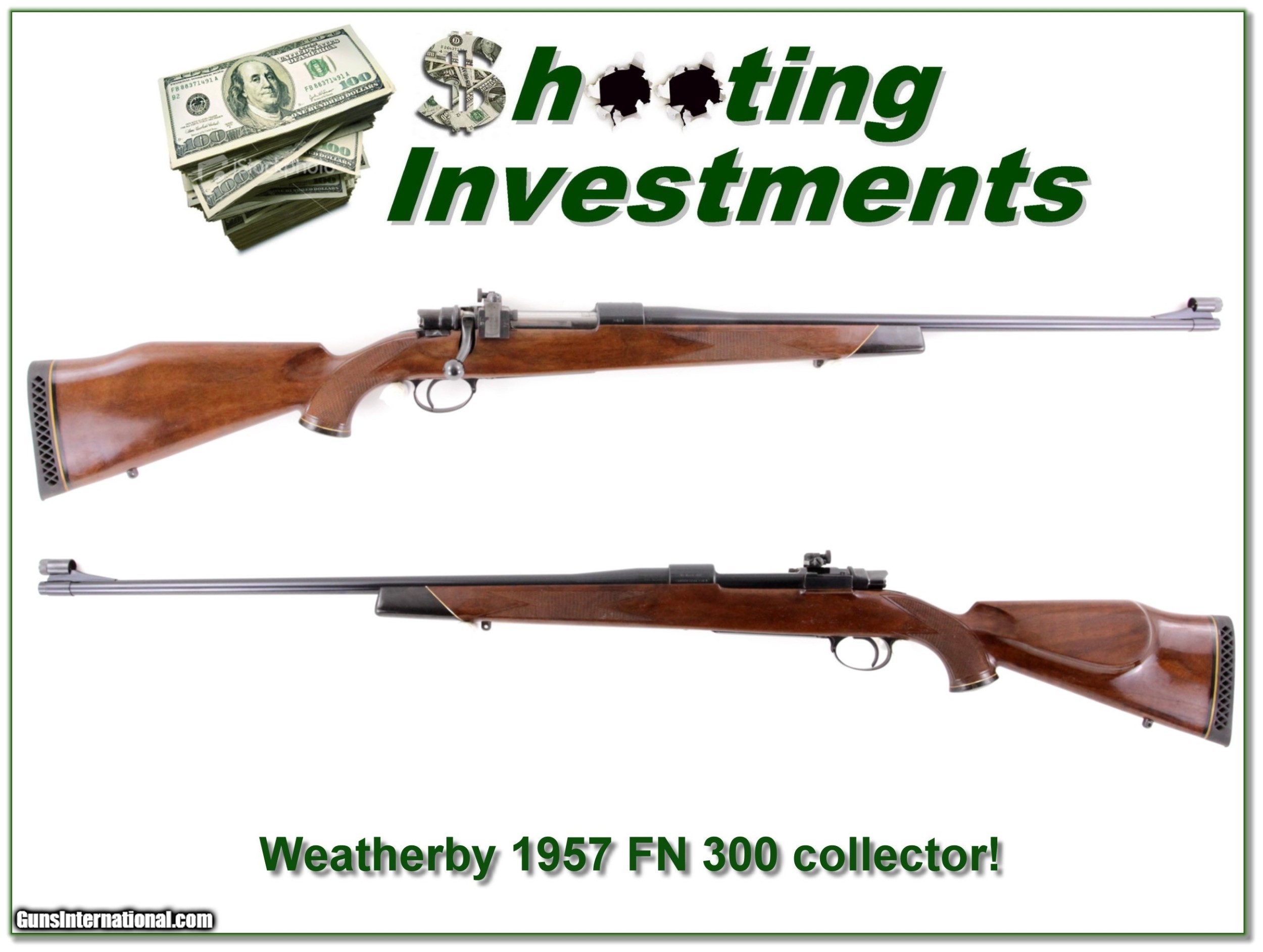 Description: Collectors, this is a 1957 made Weatherby FN in 300 Weatherby Magnum. It is the nicest one I have ever seen. Buy it before I decide it keep it! It may be unfired and it is all original. Not that the side peep mounts to the factory drilled receiver WITHOUT altering the wood! You will not find a nicer one! Shipping with insurance is $39. Please email me with any questions or larger pictures. (Consign your quality firearms with Shooting Investments for only 12%! Let me know if you have any you would like to sell!) 18-1255 Payment: Payment is by Money Order, Cashiers Check or Personal Check. I can now also accept Credit Cards (MasterCard, Visa, Discover & American Express) with a 3% convenience fee. PayPal can be used for some items but never for firearms. Shipping: The shipping charge will be listed in each description. It is $39 for most firearms. Some heavy guns or those insured for over $2000 will be higher. Shipments to Alaska and Hawaii are higher because air shipment is required. Most firearms are shipped on Tuesday and Thursday and usually in 5 days of receipt of payment. We package all shipments carefully and insure them. Optics are shipped Priority Mail and most other non-firearm shipments are shipped First Class. Returns: Our return policy is simple. If for any reason you are not pleased with your purchase, you may return your item for a full refund of purchase price. Ammunition cannot be returned. It is important to us that you are happy. Guns cannot be fired or dissembled before returning them and they must be returned in the same condition as received. Notification of a return must occur with-in 3 days of receipt at your dealer. Shipping, convenience and dealer fees are not refundable and are the responsibility of the buyer. Lay-a-way: If needed, we offer a 60 day lay-a-way option on most firearms. It is 1/3 now, 1/3 in 30 days and 1/3 in 60 days. Lay-a-way firearm sales are final and if not completed the first payment cannot be returned. Consigning your firearms with Shooting Investments: We will help you get top dollar for your firearms. While most local guns shops charge 20% or more, our fee is only 12% with a minimum of $75. At your local gun shop it might take months to sell. Selling on-line provides instant access to thousands of interested buyers. You won’t find any other on-line dealer willing to sell your firearms for only 12% or listing every gun on 3 separate s. Selling through an House typically costs the seller 15% and the buyer an addition 15% (so 30%) and you have to wait several months to sell and longer to receive funds. If properly priced, we will sell your firearms in a few weeks. Send us an email or give us a call and we’ll explain how easy it is for you to get top dollar. Trading: Trading for use is really just buying your gun to re-sell. If you have a gun you want to trade, please email a picture and we will let you know what we can give or it. You will always get more if we sell it for you on consignment. Help for California Buyers: We are happy to ship to California. It is the buyer’s responsibility to make sure any item you buy is legal in your state. We are also happy to help with your purchase of a firearm from someone other than us. If you see a gun you would like to buy but the seller can’t or won’t ship to California they can ship to use and we’ll then ship it to your California dealer. The cost for this service is only $30 + shipping. Let us know if we can help! SOLD |