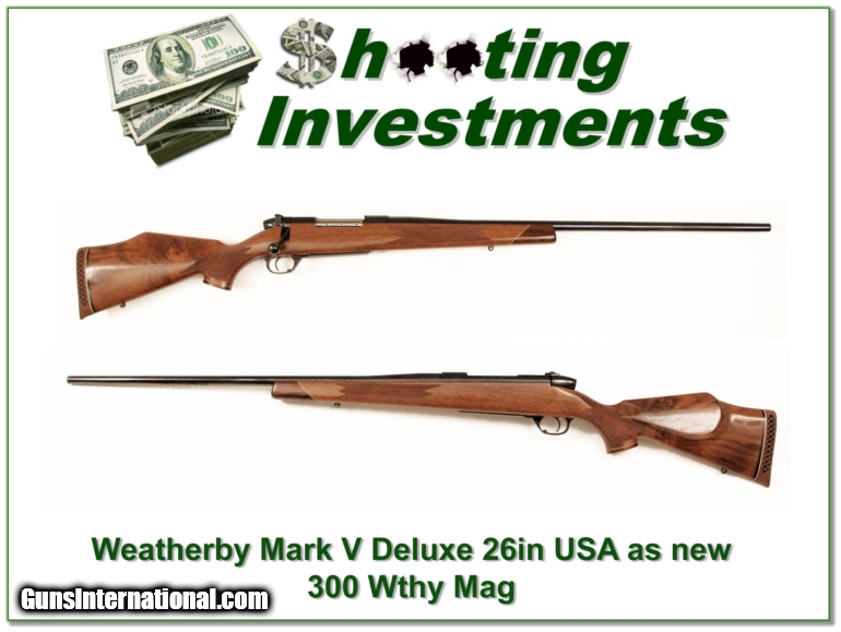 Description: This is a new condition Weatherby Mark V Deluxe in 7mm Wthy Mag. I see no marks anywhere! It has a 26in barrel. The list price of a new one is now $2400! How can you go wrong with one just as nice at half that? Shipping and insurance is $30 or $18 more if you want it shipped in a new Plano hard case. Please email me with any questions or larger pictures. (I now consign quality firearms only 10%! Let me know if you have any you would like to sell!) [15-0630] Payment: Payment is by Money Order, Cashiers Check or Personal Check. I can now also accept MasterCard and Visa with a 3% convenience fee. PayPal can be used for some items but never firearms. Please let us know if you would like to pay via PayPal. Shipping: The shipping charge will be listed in each description. It is $30 for most guns. Some heavy guns or those insured for over $2000 may be higher. Shipments to Alaska and Hawaii are higher because air shipment is required. Most firearms are shipped within 5 days of receipt of payment. We prefer shipping at the beginning of the week to avoid firearms in transit over weekends. We package all shipments carefully and insure them for the full purchase price, rounded up to the next $100. In the unlikely event that damage occurs, it is important that you save all packaging material for the claims process. Optics are shipped Priority Mail and most other non-firearm shipments are shipped First Class. Returns: Our return policy is simple. If for any reason you are not pleased with your purchase, you may return your item for a refund. The only exception is ammunition, it cannot be returned. It is important to us that you are happy. Guns cannot be fired or dissembled before returning them and must be returned in the same condition as received. Notification of a return must occur with-in 3 days of receipt at your dealer. Shipping, convenience and dealer fees are not refundable and are the responsibility of the buyer. Lay-a-way: If needed, we offer a 60 day lay-a-way option on most firearms. It is 1/3 now, 1/3 in 30 days and 1/3 in 60 days. Lay-a-way firearm sales are final. Consigning your firearms with Shooting Investments: We will help you get top dollar for your firearms. While most local guns shops charge 20% or more, our fee is only 10% with a minimum of $50. At your local gun shop it might take months to sell. Selling on-line provides instant access to thousands of interested buyers. You won’t find any other on-line dealer willing to sell your firearms for only 10% or listing every gun on 4 separate s. Selling through an House typically costs the seller 15% and the buyer an addition 15% (so 30%) and you have to wait several months to sell and longer to receive funds. If properly priced, we will sell your firearms in a week or two. Send us an email or give us a call and we’ll explain how easy it is for you to get top dollar. Trading: We collect guns and usually just trade for guns we want to add to our collections. We often sell guns for others wanting to purchase one of ours. We find this the most fair to both of us. Our Commission is only 10% and we hold the gun you want until yours sells. Please contact us if you want to sell one of yours to buy one of ours. Help for California Buyers: We are happy to ship to California. It is the buyer’s responsibility to make sure any item you buy is legal in your state. We are also happy to help with your purchase of a firearm from someone other than us. If you see a gun you would like to buy but the seller can’t or won’t ship to California we can help. You buy the gun and have it shipped to us. We’ll then ship it to your California dealer. The cost for this service is only $30 + shipping. Let me know if we can help! SOLD |