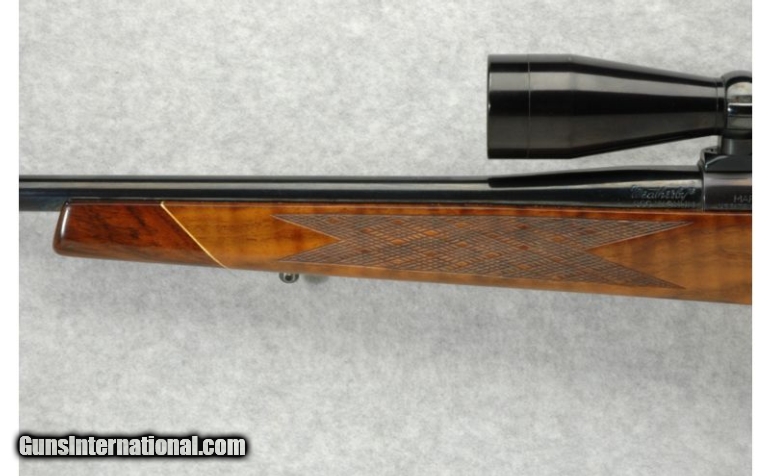 Description: Gold plated floorplate, trigger guard and bolt handle. Initials CDP is engraved on the floorplate. SOLD Manufacturer: Made in West Germany. Caliber Info: .300 Magnum Chambers: Hinged floorplate. Metal Condition: Very good. Wood Condition: Very good. Bore Condition: Very bright and shiny. Barrels: 24 inches. Stock: Checkered walnut pistol grip with a raised cheekpiece and rosewood cap. Fore End: Checkered walnut with a rosewood tip. Butt Pad: Weatherby rubber recoil pad. Weight: 8 lbs. 14 oz. Sights: Redfield 3x-9x 1" tube. No iron sights. Extras: Sling swivel studs. Item Location: Christiana, DE |