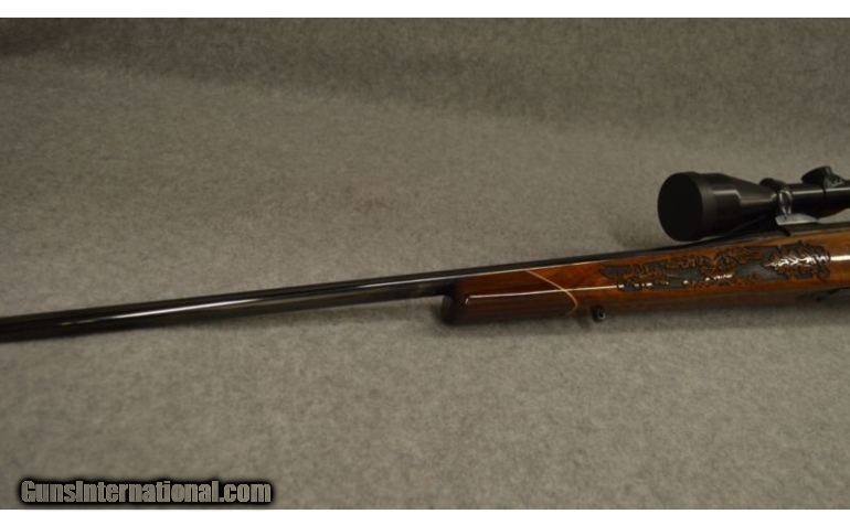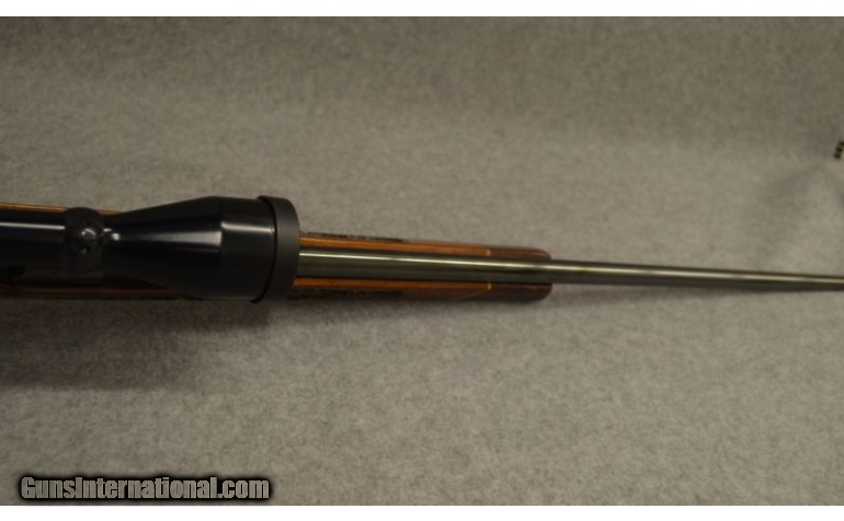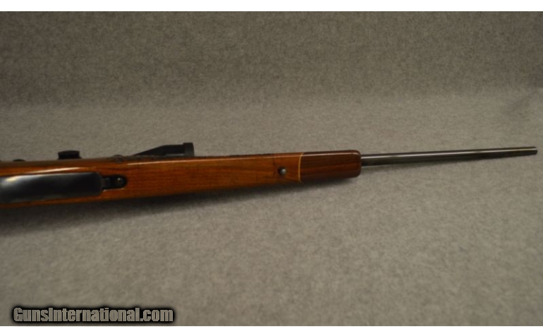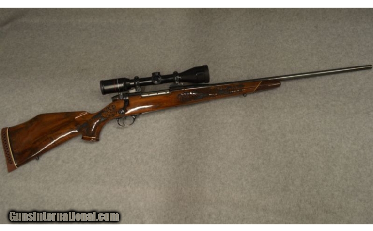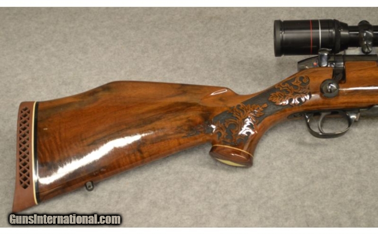 Description: Mark V action is free floated. Three rings of steel surrounding the case head. Fluted bolt with three gas ports. The stock and fore end bright and shiny and decorative lefaucheaux patter with some lite handling marks, all-so the blue barrel is bright and shiny. SOLD Caliber Info: .300 WBY MAG. Chambers: Bolt action right with 3 gas ports. Metal Condition: Bright and shiny like new. Wood Condition: Some lite handling marks other wise in good condition. Bore Condition: Bright and shiny. Barrels: 23 Inch blue. Triggers: Single. Stock: English pistol grip with decorative lefaucheaux patter and cheekpiece.. Stock Dimensions: 13 LOP 1 1/2 DAC 2 DAH. Fore End: Matching wood with decorative lefaucheaux patter. Butt Pad: Red rubber recoil pad with 2 spacer. Weight: 9 Lbs as pitcher-ed. Sights: Weatherby supreme 3 - 9 x 44 Item Location: Berlin, MA |
