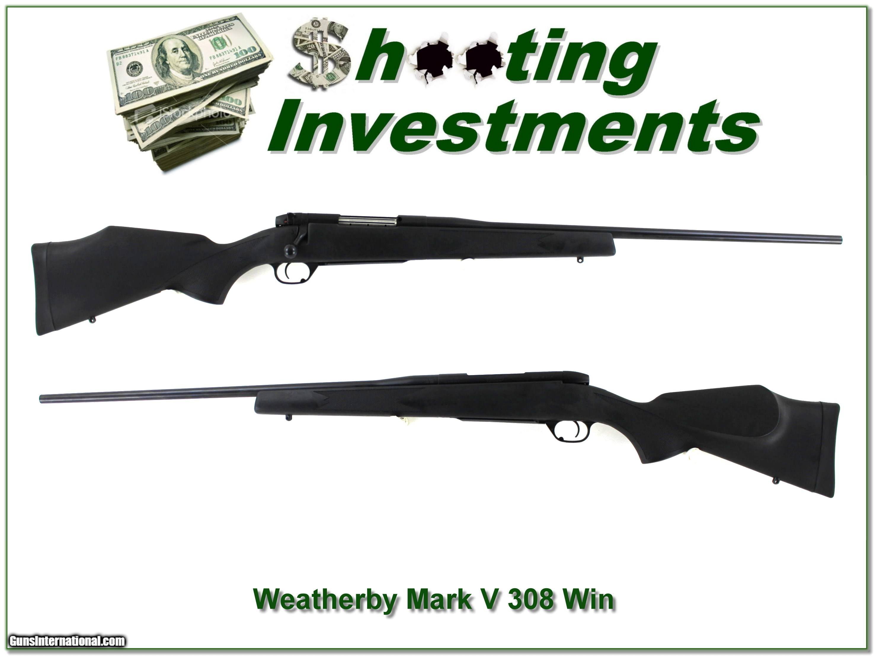 Description: Weatherby Mark V in .308 Win with 24" barrel and 6-lug action. Lightweight, accurate, and smooth-cycling—perfect for hunting or range use. Features a matte finish and black synthetic stock, crisp trigger, and Mark V action. Well-cared-for and in excellent condition, only test fired a few rounds. I am selling this one on consignment and as such lay-a-way can’t be used. It does of course have the standard 3-day inspection. Shipping and insurance is $49. Please email me with any questions or larger pictures. (Consign your quality firearms with Shooting Investments for only 12%! Let me know if you have any you would like to sell!) 25-0643 Payment: Payment is by Money Order, Cashier’s Check or Personal Check. I can now also accept Credit Cards (MasterCard, Visa, Discover & American Express) with a 3% convenience fee. Shipping: The shipping charge will be listed in each description. It is $49 for most firearms. Some heavy guns or those insured for over $2000 will be higher. Shipments to Alaska and Hawaii are higher because air shipment is required. Most firearms are shipped on Tuesday and Thursday and usually in 5 days of receipt of payment. We package all shipments carefully and insure them. Optics are shipped Priority Mail and most other non-firearm shipments are shipped First Class. Returns: Our return policy is simple. If for any reason you are not pleased with your purchase, you may return your item for a full refund of purchase price. Ammunition cannot be returned. It is important to us that you are happy. Guns cannot be fired or dissembled before returning them and they must be returned in the same condition as received. Notification of a return must occur within 3 days of receipt at your dealer. Shipping, convenience and dealer fees are not refundable and are the responsibility of the buyer. Lay-a-way: If needed, we offer a 60 day lay-a-way option on most firearms. It is 1/3 now, 1/3 in 30 days and 1/3 in 60 days. Lay-a-way firearm sales are final and cannot be returned. If a lay-a-way is not completed the first payment cannot be refunded. Consigning your firearms with Shooting Investments: We will help you get top dollar for your firearms. While most local guns shops charge 20% or more, our fee is only 12% with a minimum of $100. At your local gun shop it might take months to sell. Selling on-line provides instant access to thousands of interested buyers. You won’t find any other on-line dealer willing to sell your firearms for only 12% or listing every gun on 3 separate s. Selling through an House typically costs the seller 15% and the buyer an addition 15% (so 30%) and you have to wait several months to sell and longer to receive funds. If properly priced, we will sell your firearms within a few weeks. Send us an email or give us a call and we’ll explain how easy it is for you to get top dollar. Trading: Trading for us is really just buying your gun to re-sell. If you have a gun you want to trade, please email a picture and we will let you know what we can give for it. You will always get more if we sell it for you on consignment. SOLD |