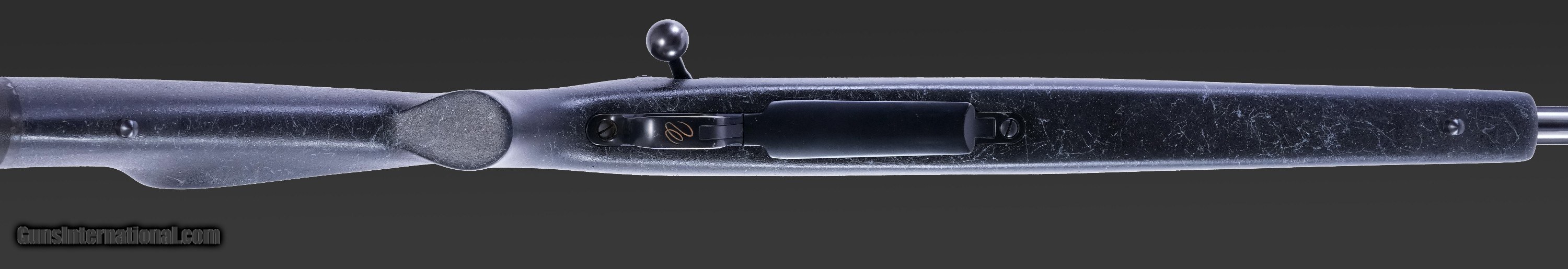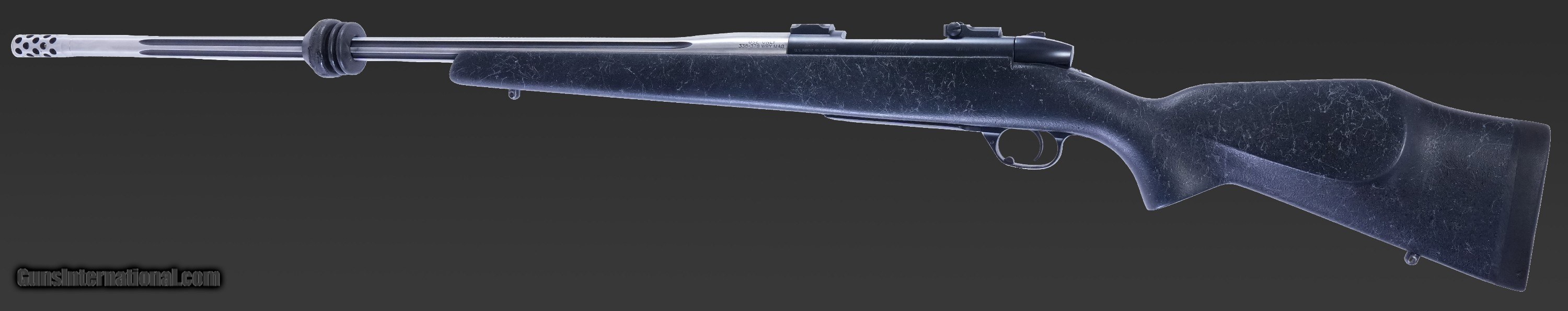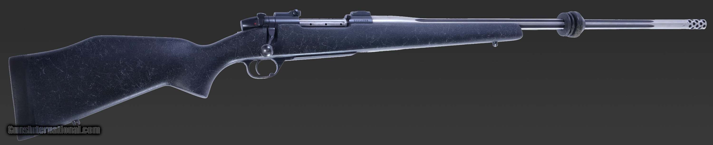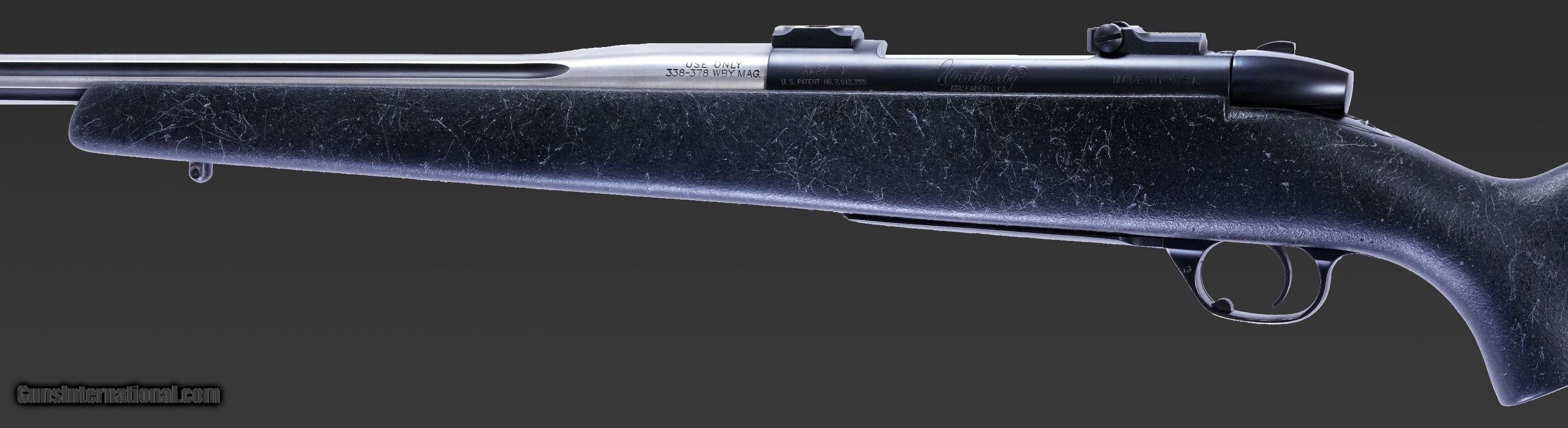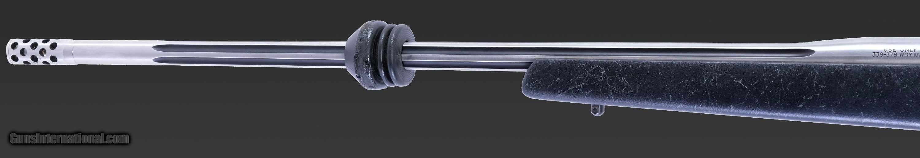 Description: Screw on muzzle break (stamped "338" on the top) at the end of the fluted barrel making the overall barrel length 28 inches. The action has a black oxide coating with a low luster bead blasted matte finish and is drilled and tapped for mounting scope blocks with filler screws in place. With a polished and fluted bolt and a smooth round knob bolt handle. Textured fiberglass stock with black and gray spiderfinish, raised cheekpiece, quick-release sling swivels, and a Pachmayr Decelerator recoil pad Excellent with 99% original finish and only minimal scattered light handling marks. The stock is outstanding. Mechanically excellent. SOLD Rifle Caliber: .338-378 Weatherby Magnum Manufacturer: WEATHERBY Model: MARK V Barrel Length: 28 Bore: EXCELLENT Condition: EXCELLENT Metal Condition: EXCELLENT Bore Condition: EXCELLENT Action: BOLT-ACTION Triggers: SINGLE Stock: BLACK COMPOSITE Finish: MATTE STAINLESS Sights: DRILLED AND TAPPED FOR OPTIC Item Location: Florida |