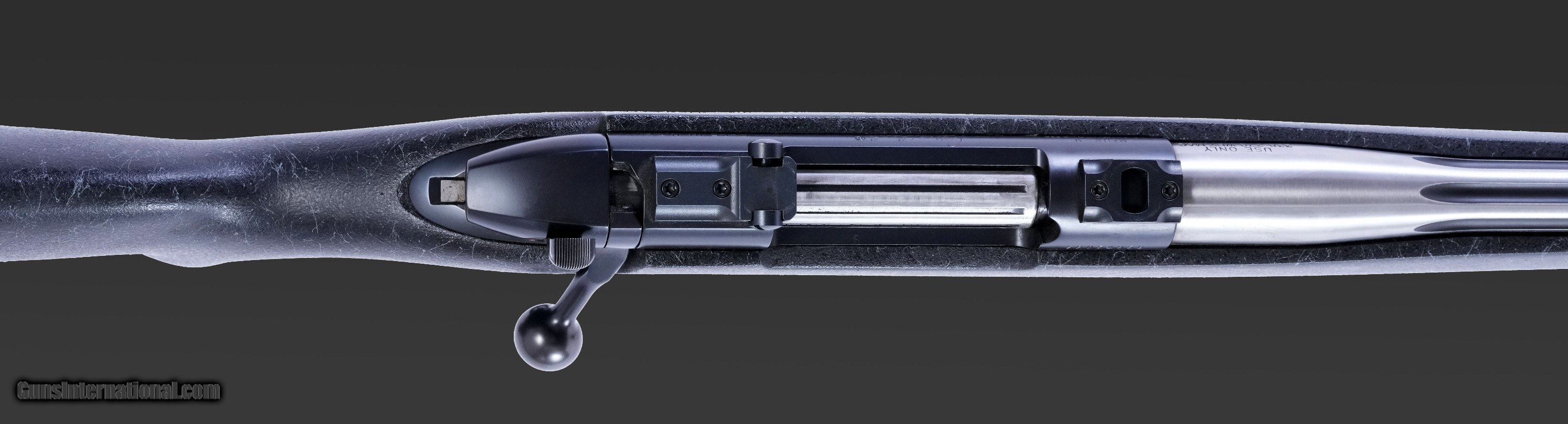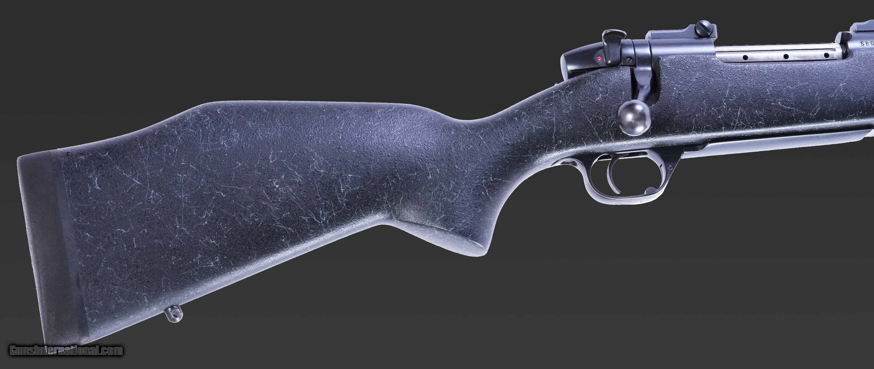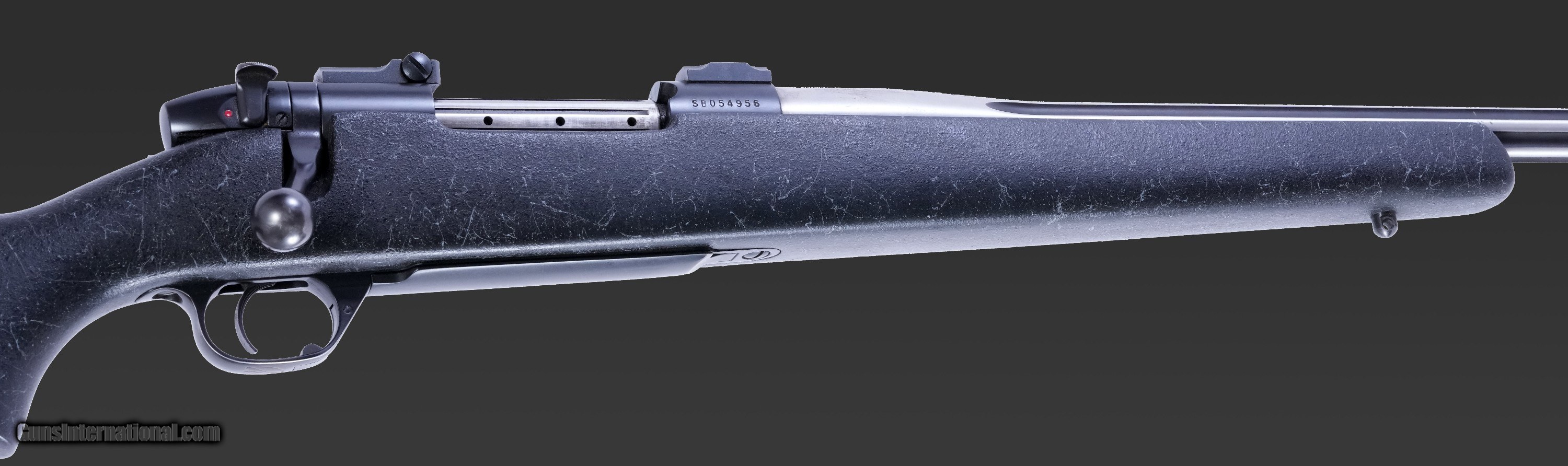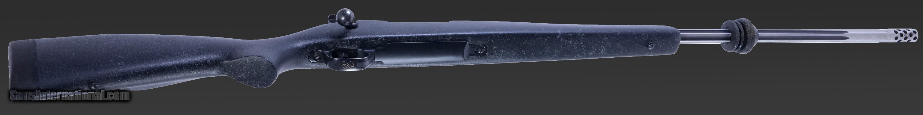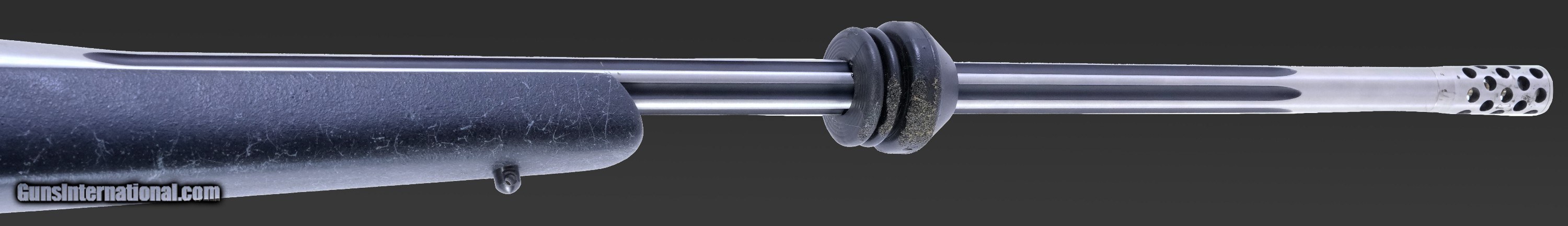 Description: Screw on muzzle break (stamped "338" on the top) at the end of the fluted barrel making the overall barrel length 28 inches. The action has a black oxide coating with a low luster bead blasted matte finish and is drilled and tapped for mounting scope blocks with filler screws in place. With a polished and fluted bolt and a smooth round knob bolt handle. Textured fiberglass stock with black and gray spiderfinish, raised cheekpiece, quick-release sling swivels, and a Pachmayr Decelerator recoil pad Excellent with 99% original finish and only minimal scattered light handling marks. The stock is outstanding. Mechanically excellent. SOLD Rifle Caliber: .338-378 Weatherby Magnum Manufacturer: WEATHERBY Model: MARK V Barrel Length: 28 Bore: EXCELLENT Condition: EXCELLENT Metal Condition: EXCELLENT Bore Condition: EXCELLENT Action: BOLT-ACTION Triggers: SINGLE Stock: BLACK COMPOSITE Finish: MATTE STAINLESS Sights: DRILLED AND TAPPED FOR OPTIC Item Location: Florida |