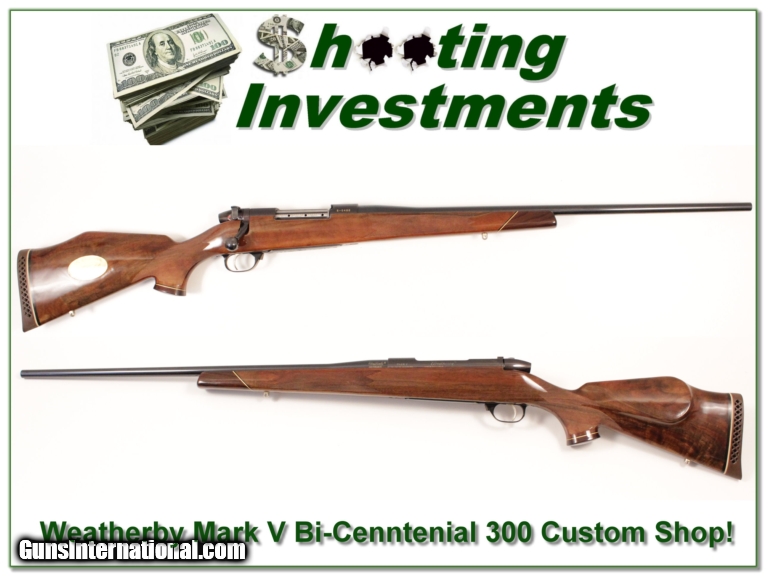 Description: This is a as new Weatherby Mark V Custom Shop made Bi-Centennial in 300 Wthy Mag. These were made in 1976. They were all Custom Shop guns with ultra-mark checkering. You can compare this beauty to the current Ultra-mark that now lists for $3400! And this one will only go up in value. It will make a nice addition to your collection or be a high end hunting gun. That makes it a true Shooting Investment. Shipping and insurance is $30 or $18 more if you want it shipped in a new Plano hard case. Please email me with any questions or larger pictures. (I now consign quality firearms only 10%! Let me know if you have any you would like to sell!) [14-0040] Terms & Conditions Payment: Payment is by Money Order, Cashiers Check or Personal Check. I can now also accept MasterCard and Visa with a 3% convenience fee. PayPal can be used for some items but never firearms. Please let us know if you would like to pay via PayPal. Shipping: The shipping charge will be listed in each description. It is $30 for most guns. Some heavy guns or those insured for over $2000 may be higher. Shipments to Alaska and Hawaii are higher because air shipment is required. Most firearms are shipped within 5 days of receipt of payment. We prefer shipping at the beginning of the week to avoid firearms in transit over weekends. We package all shipments carefully and insure them for the full purchase price, rounded up to the next $100. In the unlikely event that damage occurs, it is important that you save all packaging material for the claims process. Optics are shipped Priority Mail and most other non-firearm shipments are shipped First Class. Returns: Our return policy is simple. If for any reason you are not pleased with your purchase, you may return your item for a refund. The only exception is ammunition, it cannot be returned. It is important to us that you are happy. Guns cannot be fired or dissembled before returning them and must be returned in the same condition as received. Notification of a return must occur with-in 3 days of receipt at your dealer. Shipping, convenience and dealer fees are not refundable and are the responsibility of the buyer. Lay-a-way: If needed, we offer a 60 day lay-a-way option on most firearms. It is 1/3 now, 1/3 in 30 days and 1/3 in 60 days. Lay-a-way firearm sales are final. Consigning your firearms with Shooting Investments: We will help you get top dollar for your firearms. While most local guns shops charge 20% or more, our fee is only 10% with a minimum of $50. At your local gun shop it might take months to sell. Selling on-line provides instant access to thousands of interested buyers. You won’t find any other on-line dealer willing to sell your firearms for only 10% or listing every gun on 4 separate s. Selling through an House typically costs 15% and you have to wait several months to sell and longer to receive funds. If properly priced, we will sell your firearms in a week or two. Send us an email or give us a call and we’ll explain how easy it is for you to get top dollar. Trading: We collect guns and usually just trade for guns we want to add to our collections. We often sell guns for others wanting to purchase one of ours. We find this the most fair to both of us. Our Commission is only 10% and we hold the gun you want until yours sells. Please contact us if you want to sell one of yours to buy one of ours. Help for California Buyers: We are happy to ship to California. It is the buyer’s responsibility to make sure any item you buy is legal in your state. We are also happy to help with your purchase of a firearm from someone other than us. If you see a gun you would like to buy but the seller can’t or won’t ship to California we can help. You buy the gun and have it shipped to us. We’ll then ship it to your California dealer. The cost for this service is only $30 + shipping. Let me know if we can help! SOLD |