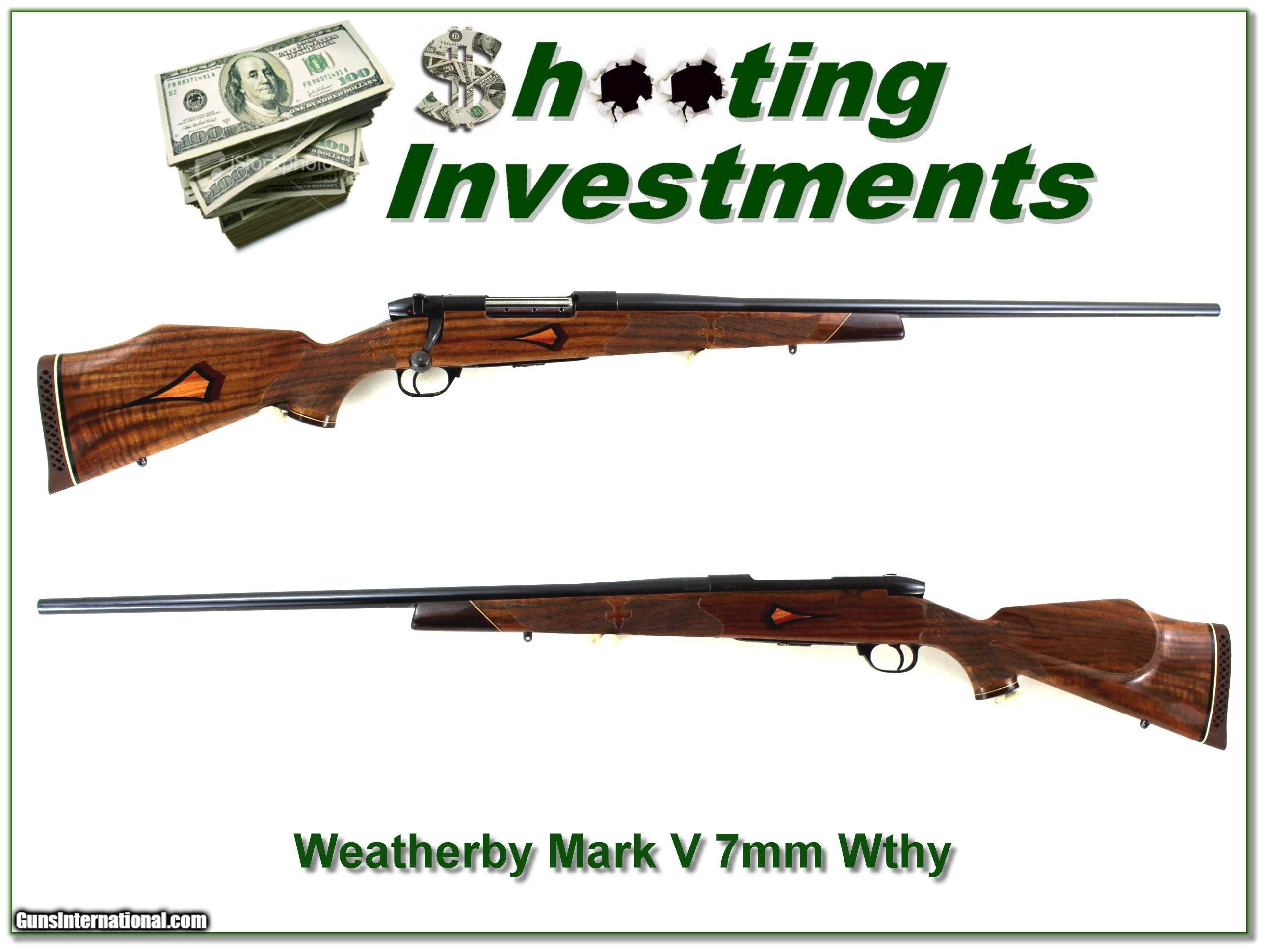Description: Collectors, this is a beautiful Weatherby Custom shop Mark V in 7mm Weatherby Magnum. It has a 26in barrel. The custom shop work was done in Sought Gate on the Japan made action. It has a Crown engraved floorplate with gold elk and a Crown hand made stock with extra fancy walnut with #6 inlays and initials JME (it’s owner) in a rare #6C gold inlay. It is a one-of-a-kind Mark V and will make prized addition to your collection! I am selling this one on consignment and as such lay-a-way can’t be used. It does of course have the standard 3-day inspection. Shipping and insurance is $99. Please email me with any questions or larger pictures. (Consign your quality firearms with Shooting Investments for only 12%! Let me know if you have any you would like to sell!) 22-0944 Payment: Payment is by Money Order, Cashier’s Check or Personal Check. I can now also accept Credit Cards (MasterCard, Visa, Discover & American Express) with a 3% convenience fee. Shipping: The shipping charge will be listed in each description. It is $49 for most firearms. Some heavy guns or those insured for over $2000 will be higher. Shipments to Alaska and Hawaii are higher because air shipment is required. Most firearms are shipped on Tuesday and Thursday and usually in 5 days of receipt of payment. We package all shipments carefully and insure them. Optics are shipped Priority Mail and most other non-firearm shipments are shipped First Class. Returns: Our return policy is simple. If for any reason you are not pleased with your purchase, you may return your item for a full refund of purchase price. Ammunition cannot be returned. It is important to us that you are happy. Guns cannot be fired or dissembled before returning them and they must be returned in the same condition as received. Notification of a return must occur within 3 days of receipt at your dealer. Shipping, convenience and dealer fees are not refundable and are the responsibility of the buyer. Lay-a-way: If needed, we offer a 60 day lay-a-way option on most firearms. It is 1/3 now, 1/3 in 30 days and 1/3 in 60 days. Lay-a-way firearm sales are final and cannot be returned. If a lay-a-way is not completed the first payment cannot be refunded. Consigning your firearms with Shooting Investments: We will help you get top dollar for your firearms. While most local guns shops charge 20% or more, our fee is only 12% with a minimum of $75. At your local gun shop it might take months to sell. Selling on-line provides instant access to thousands of interested buyers. You won’t find any other on-line dealer willing to sell your firearms for only 12% or listing every gun on 3 separate s. Selling through an House typically costs the seller 15% and the buyer an addition 15% (so 30%) and you have to wait several months to sell and longer to receive funds. If properly priced, we will sell your firearms within a few weeks. Send us an email or give us a call and we’ll explain how easy it is for you to get top dollar. Trading: Trading for us is really just buying your gun to re-sell. If you have a gun you want to trade, please email a picture and we will let you know what we can give for it. You will always get more if we sell it for you on consignment. SOLD |