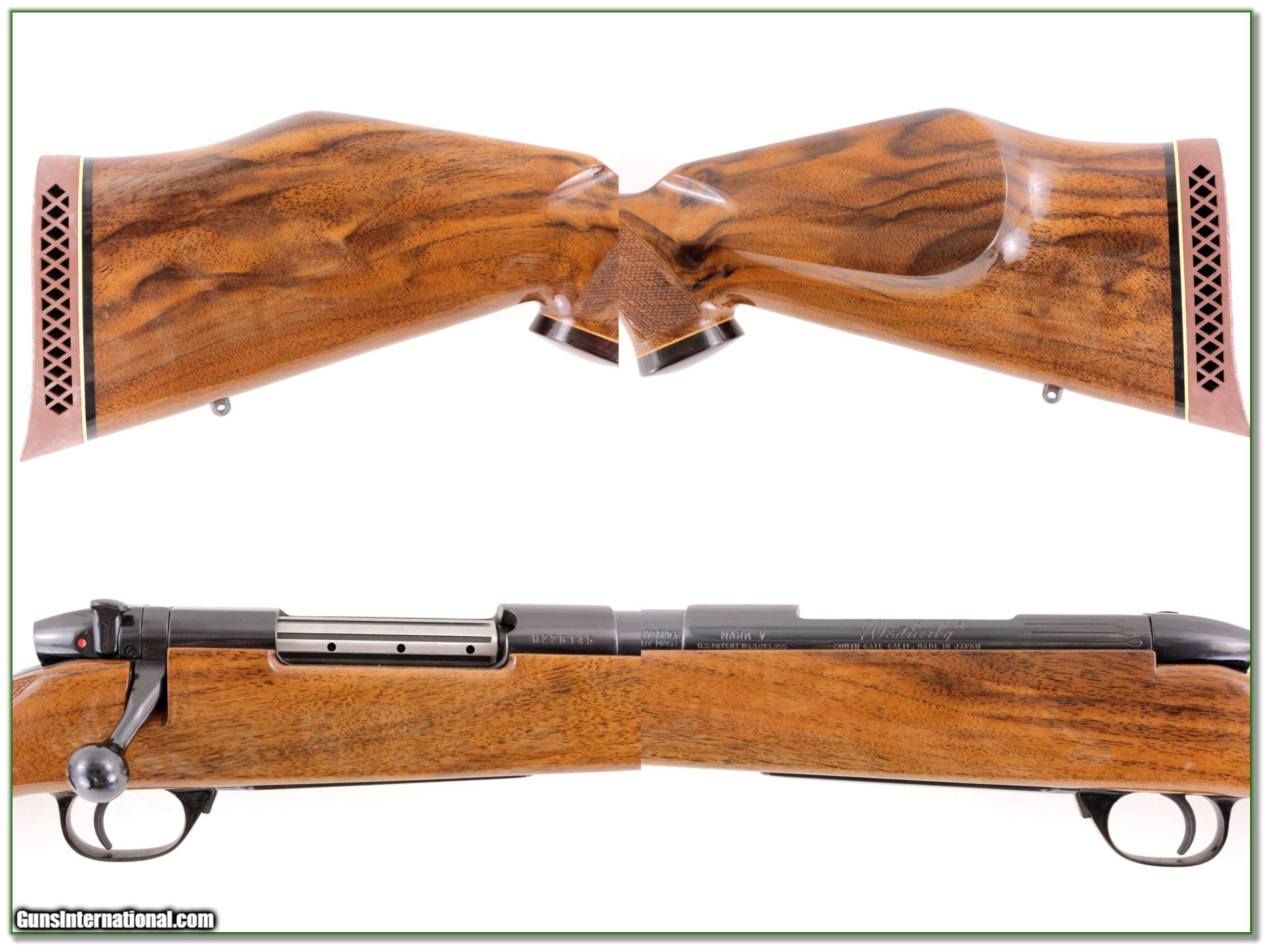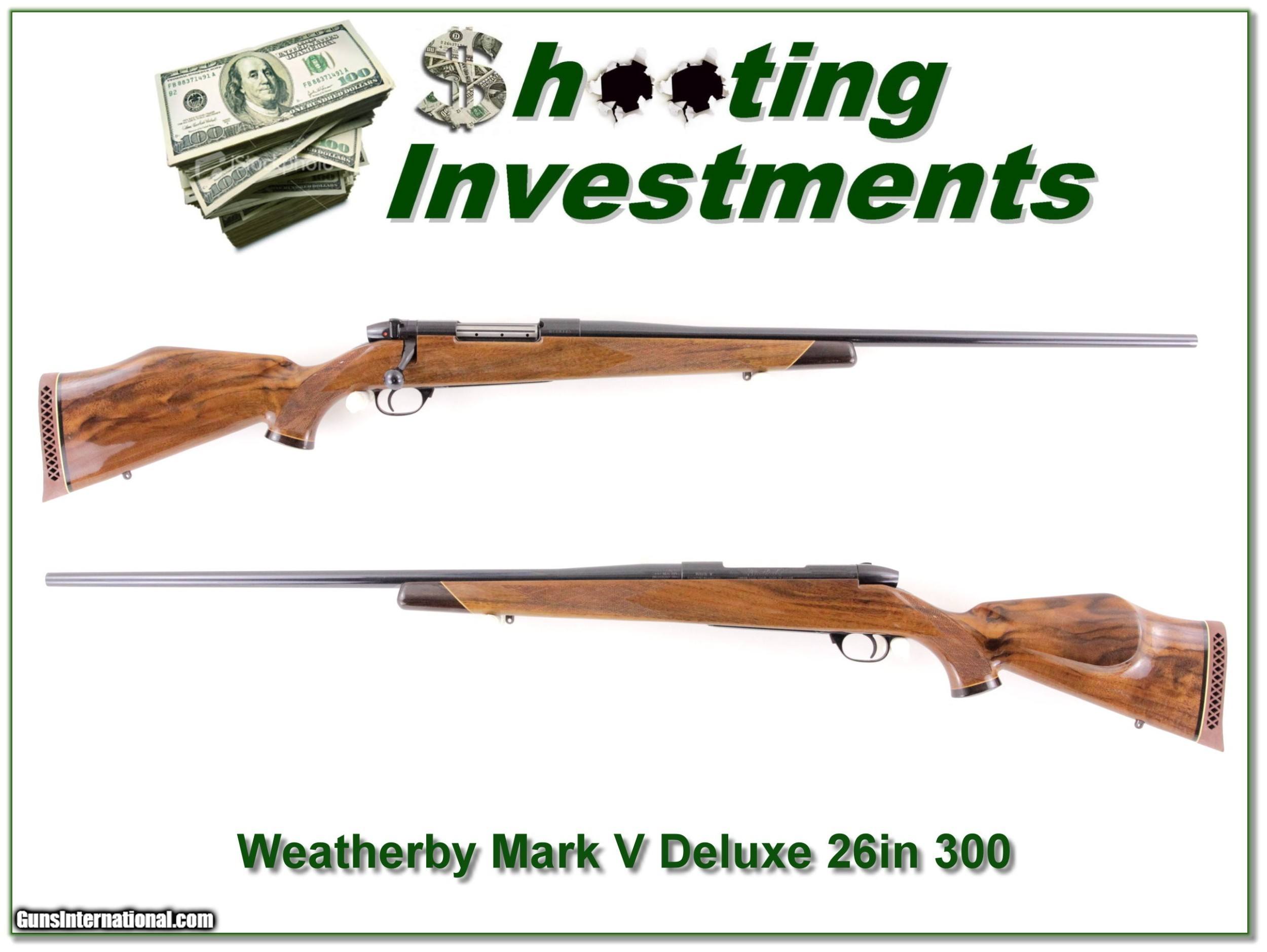 Description: This is a beautiful Weatherby Mark V Deluxe in 300 Weatherby Magnum. It is a harder to find Japan made 26in Mark V. Many collectors agree it’s the Japanese Mark Vs that are the heist quality of all! This one is about new. I see no marks on blue and if fired not more than a couple of rounds. I see just a few insignificant marks on the wood. It will make a high-end hunting gun or fine addition to your collection and more than HALF the current list price of a new one. Shipping with insurance is $39. Please email me with any questions or larger pictures. (Consign your quality firearms with Shooting Investments for only 12%! Let me know if you have any you would like to sell!) 19-1401 Payment: Payment is by Money Order, Cashiers Check or Personal Check. I can now also accept Credit Cards (MasterCard, Visa, Discover & American Express) with a 3% convenience fee. PayPal can be used for some items but never for firearms. Shipping: The shipping charge will be listed in each description. It is $39 for most firearms. Some heavy guns or those insured for over $2000 will be higher. Shipments to Alaska and Hawaii are higher because air shipment is required. Most firearms are shipped on Tuesday and Thursday and usually in 5 days of receipt of payment. We package all shipments carefully and insure them. Optics are shipped Priority Mail and most other non-firearm shipments are shipped First Class. Returns: Our return policy is simple. If for any reason you are not pleased with your purchase, you may return your item for a full refund of purchase price. Ammunition cannot be returned. It is important to us that you are happy. Guns cannot be fired or dissembled before returning them and they must be returned in the same condition as received. Notification of a return must occur with-in 3 days of receipt at your dealer. Shipping, convenience and dealer fees are not refundable and are the responsibility of the buyer. Lay-a-way: If needed, we offer a 60 day lay-a-way option on most firearms. It is 1/3 now, 1/3 in 30 days and 1/3 in 60 days. Lay-a-way firearm sales are final and if not completed the first payment cannot be returned. Consigning your firearms with Shooting Investments: We will help you get top dollar for your firearms. While most local guns shops charge 20% or more, our fee is only 12% with a minimum of $75. At your local gun shop it might take months to sell. Selling on-line provides instant access to thousands of interested buyers. You won’t find any other on-line dealer willing to sell your firearms for only 12% or listing every gun on 3 separate s. Selling through an House typically costs the seller 15% and the buyer an addition 15% (so 30%) and you have to wait several months to sell and longer to receive funds. If properly priced, we will sell your firearms in a few weeks. Send us an email or give us a call and we’ll explain how easy it is for you to get top dollar. Trading: Trading for use is really just buying your gun to re-sell. If you have a gun you want to trade, please email a picture and we will let you know what we can give or it. You will always get more if we sell it for you on consignment. Help for California Buyers: We are happy to ship to California. It is the buyer’s responsibility to make sure any item you buy is legal in your state. We are also happy to help with your purchase of a firearm from someone other than us. If you see a gun you would like to buy but the seller can’t or won’t ship to California they can ship to use and we’ll then ship it to your California dealer. The cost for this service is only $30 + shipping. Let us know if we can help! SOLD |