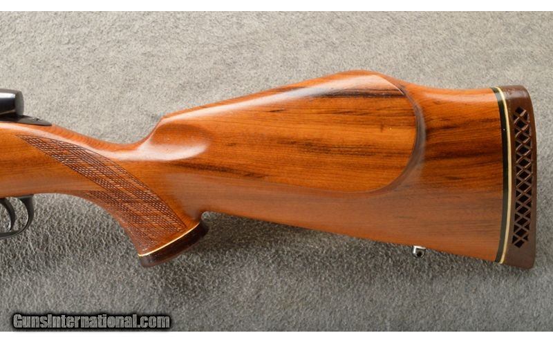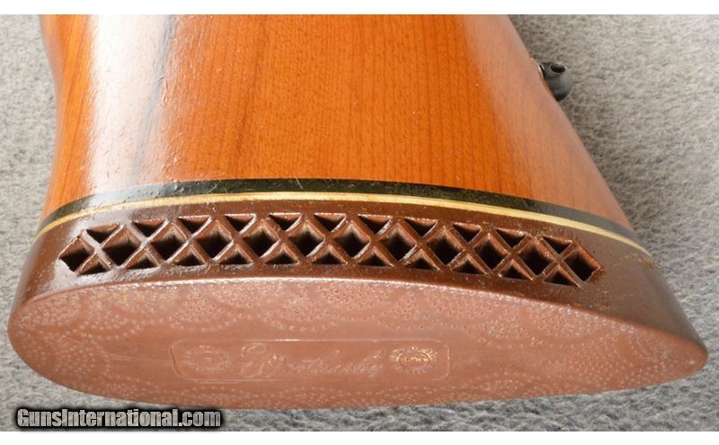 Description: This is a nice early West German Weatherby rifle. This nice rifle has a 24" gloss blue barrel, receiver, floor plate and trigger guard. The walnut stock has been refinished and looks very good. If you are in the market for a Weatherby Mark V rifle this is a good one at a great price. .300 Weatherby Magnum SOLD Chambers: Bolt action repeater 3+1. Metal Condition: Excellent with a couple of small marks you have to look for. Wood Condition: Excellent with a refinish. The Weatherby finish from this time had a lot of crazing (cracking). Bore Condition: Bright and shiny. Barrels: 24" Gloss blue. Triggers: Single blue. Stock Dimensions: 13 3/8" LOP. Fore End: Nice light color walnut with a Rose wood tip and a sling stud and French checkering. Butt Pad: "Matching walnut with a Monty Carlo cheek, sling stud, French checkered pistol grip, Rose wood grip cap and a brown Weatherby butt pad. Weight: 7 Lbs 15 Oz. Sights: Drilled and tapped for your scope bases. Item Location: Owatonna, MN |