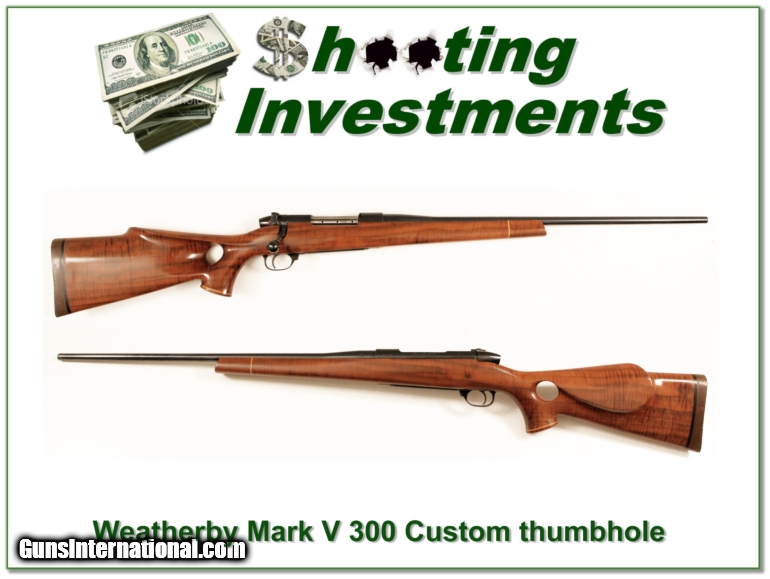 Description: This Weatherby Mark V has a beautiful custom thumbhole stock in the flat shooting and hard hitting 300 Wthy Mag. The gun is a Deluxe with high gloss in near new condition. Based on the sharp lugs I am sure never fired many rounds. The stock too is near new with no marks of note and the fiddle back is really nicer and more pronounced in person that my pictures show. This is a Japan made 24in gun. Shipping and insurance is $30 or $18 more if you want it shipped in a new Plano hard case. Please email me with any questions or larger pictures. (I now consign quality firearms only 10%! Let me know if you have any you would like to sell!) [15-0260] Payment: Payment is by Money Order, Cashiers Check or Personal Check. I can now also accept MasterCard and Visa with a 3% convenience fee. PayPal can be used for some items but never firearms. Please let us know if you would like to pay via PayPal. Shipping: The shipping charge will be listed in each description. It is $30 for most guns. Some heavy guns or those insured for over $2000 may be higher. Shipments to Alaska and Hawaii are higher because air shipment is required. Most firearms are shipped within 5 days of receipt of payment. We prefer shipping at the beginning of the week to avoid firearms in transit over weekends. We package all shipments carefully and insure them for the full purchase price, rounded up to the next $100. In the unlikely event that damage occurs, it is important that you save all packaging material for the claims process. Optics are shipped Priority Mail and most other non-firearm shipments are shipped First Class. Returns: Our return policy is simple. If for any reason you are not pleased with your purchase, you may return your item for a refund. The only exception is ammunition, it cannot be returned. It is important to us that you are happy. Guns cannot be fired or dissembled before returning them and must be returned in the same condition as received. Notification of a return must occur with-in 3 days of receipt at your dealer. Shipping, convenience and dealer fees are not refundable and are the responsibility of the buyer. Lay-a-way: If needed, we offer a 60 day lay-a-way option on most firearms. It is 1/3 now, 1/3 in 30 days and 1/3 in 60 days. Lay-a-way firearm sales are final. Consigning your firearms with Shooting Investments: We will help you get top dollar for your firearms. While most local guns shops charge 20% or more, our fee is only 10% with a minimum of $50. At your local gun shop it might take months to sell. Selling on-line provides instant access to thousands of interested buyers. You won’t find any other on-line dealer willing to sell your firearms for only 10% or listing every gun on 4 separate s. Selling through an House typically costs the seller 15% and the buyer an addition 15% (so 30%) and you have to wait several months to sell and longer to receive funds. If properly priced, we will sell your firearms in a week or two. Send us an email or give us a call and we’ll explain how easy it is for you to get top dollar. Trading: We collect guns and usually just trade for guns we want to add to our collections. We often sell guns for others wanting to purchase one of ours. We find this the most fair to both of us. Our Commission is only 10% and we hold the gun you want until yours sells. Please contact us if you want to sell one of yours to buy one of ours. Help for California Buyers: We are happy to ship to California. It is the buyer’s responsibility to make sure any item you buy is legal in your state. We are also happy to help with your purchase of a firearm from someone other than us. If you see a gun you would like to buy but the seller can’t or won’t ship to California we can help. You buy the gun and have it shipped to us. We’ll then ship it to your California dealer. The cost for this service is only $30 + shipping. Let me know if we can help! SOLD |