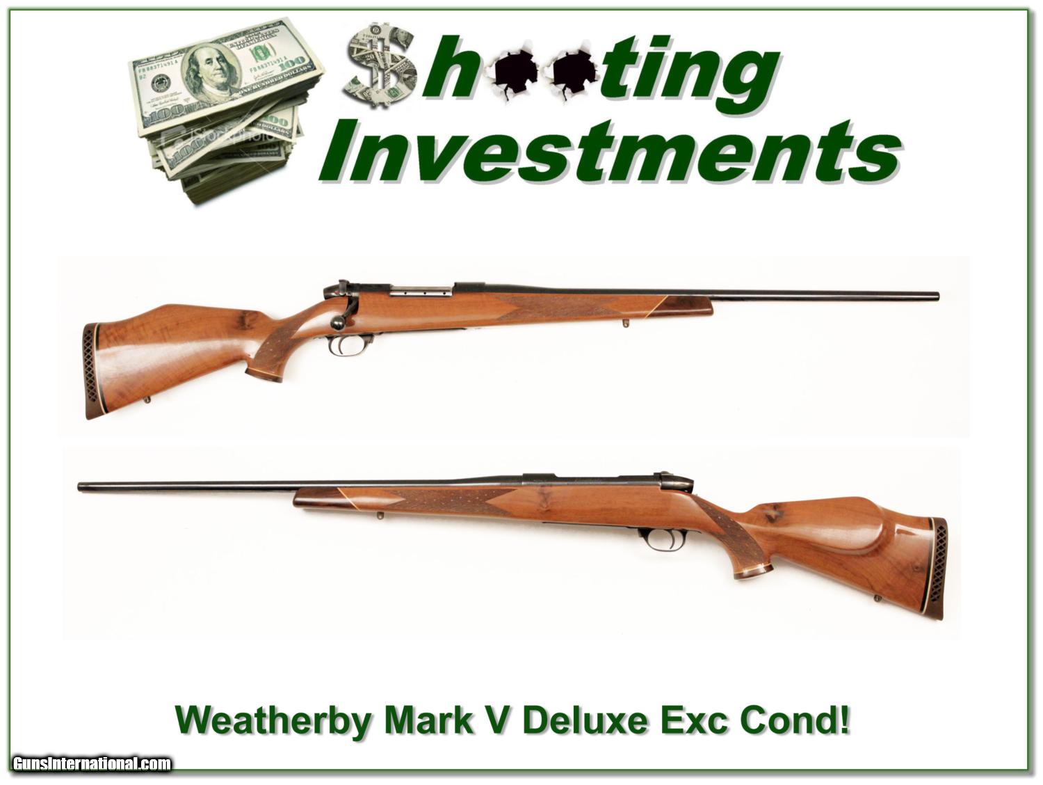 Description: Collectors and hunters, this an excellent condition Weatherby Mark V Deluxe in 300 Wthy Magnum. I am sure never fired more than a few rounds. This is a beautiful Japan made Mark V with lighter weight 24in barrel. With the current list price of a new Deluxe now at $2600 how can you go wrong here? Shipping and insurance is $30 or $18 more if you want it shipped in a new Plano hard case. Please email me with any questions or larger pictures. (I now consign quality firearms only 10%! Let me know if you have any you would like to sell!) [15-1463] Payment: Payment is by Money Order, Cashiers Check or Personal Check. I can now also accept MasterCard and Visa with a 3% convenience fee. PayPal can be used for some items but never firearms. Please let us know if you would like to pay via PayPal. Shipping: The shipping charge will be listed in each description. It is $30 for most guns. Some heavy guns or those insured for over $2000 may be higher. Shipments to Alaska and Hawaii are higher because air shipment is required. Most firearms are shipped within 5 days of receipt of payment. We prefer shipping at the beginning of the week to avoid firearms in transit over weekends. We package all shipments carefully and insure them for the full purchase price, rounded up to the next $100. In the unlikely event that damage occurs, it is important that you save all packaging material for the claims process. Optics are shipped Priority Mail and most other non-firearm shipments are shipped First Class. Returns: Our return policy is simple. If for any reason you are not pleased with your purchase, you may return your item for a refund. The only exception is ammunition, it cannot be returned. It is important to us that you are happy. Guns cannot be fired or dissembled before returning them and must be returned in the same condition as received. Notification of a return must occur with-in 3 days of receipt at your dealer. Shipping, convenience and dealer fees are not refundable and are the responsibility of the buyer. Lay-a-way: If needed, we offer a 60 day lay-a-way option on most firearms. It is 1/3 now, 1/3 in 30 days and 1/3 in 60 days. Lay-a-way firearm sales are final. Consigning your firearms with Shooting Investments: We will help you get top dollar for your firearms. While most local guns shops charge 20% or more, our fee is only 10% with a minimum of $50. At your local gun shop it might take months to sell. Selling on-line provides instant access to thousands of interested buyers. You won’t find any other on-line dealer willing to sell your firearms for only 10% or listing every gun on 4 separate s. Selling through an House typically costs the seller 15% and the buyer an addition 15% (so 30%) and you have to wait several months to sell and longer to receive funds. If properly priced, we will sell your firearms in a week or two. Send us an email or give us a call and we’ll explain how easy it is for you to get top dollar. Trading: We collect guns and usually just trade for guns we want to add to our collections. We often sell guns for others wanting to purchase one of ours. We find this the most fair to both of us. Our Commission is only 10% and we hold the gun you want until yours sells. Please contact us if you want to sell one of yours to buy one of ours. Help for California Buyers: We are happy to ship to California. It is the buyer’s responsibility to make sure any item you buy is legal in your state. We are also happy to help with your purchase of a firearm from someone other than us. If you see a gun you would like to buy but the seller can’t or won’t ship to California we can help. You buy the gun and have it shipped to us. We’ll then ship it to your California dealer. The cost for this service is only $30 + shipping. Let me know if we can help! SOLD |