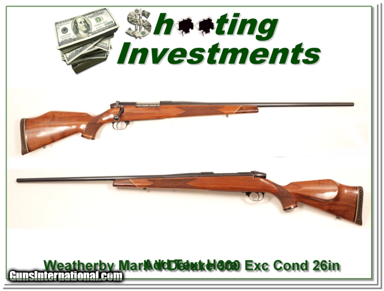 Description: This is an excellent condition Weatherby Mark v Deluxe in 300 Wthy mag. It has a 26 in barrel and only a couple insignificant handling marks. With the list price of a new one now $2400 this is a no-brainer. It is a Shooting Investment. Shipping and insurance is $30 or $18 more if you want it shipped in a new Plano hard case. Please email me with any questions or larger pictures. (I now consign quality firearms only 10%! Let me know if you have any you would like to sell!) [14-0410] Terms & Conditions Payment: Payment is by Money Order, Cashiers Check or Personal Check. I can now also accept MasterCard and Visa with a 3% convenience fee. PayPal can be used for some items but never firearms. Please let us know if you would like to pay via PayPal. Shipping: The shipping charge will be listed in each description. It is $30 for most guns. Some heavy guns or those insured for over $2000 may be higher. Shipments to Alaska and Hawaii are higher because air shipment is required. Most firearms are shipped within 5 days of receipt of payment. We prefer shipping at the beginning of the week to avoid firearms in transit over weekends. We package all shipments carefully and insure them for the full purchase price, rounded up to the next $100. In the unlikely event that damage occurs, it is important that you save all packaging material for the claims process. Optics are shipped Priority Mail and most other non-firearm shipments are shipped First Class. Returns: Our return policy is simple. If for any reason you are not pleased with your purchase, you may return your item for a refund. The only exception is ammunition, it cannot be returned. It is important to us that you are happy. Guns cannot be fired or dissembled before returning them and must be returned in the same condition as received. Notification of a return must occur with-in 3 days of receipt at your dealer. Shipping, convenience and dealer fees are not refundable and are the responsibility of the buyer. Lay-a-way: If needed, we offer a 60 day lay-a-way option on most firearms. It is 1/3 now, 1/3 in 30 days and 1/3 in 60 days. Lay-a-way firearm sales are final. Consigning your firearms with Shooting Investments: We will help you get top dollar for your firearms. While most local guns shops charge 20% or more, our fee is only 10% with a minimum of $50. At your local gun shop it might take months to sell. Selling on-line provides instant access to thousands of interested buyers. You won’t find any other on-line dealer willing to sell your firearms for only 10% or listing every gun on 4 separate s. Selling through an House typically costs 15% and you have to wait several months to sell and longer to receive funds. If properly priced, we will sell your firearms in a week or two. Send us an email or give us a call and we’ll explain how easy it is for you to get top dollar. Trading: We collect guns and usually just trade for guns we want to add to our collections. We often sell guns for others wanting to purchase one of ours. We find this the most fair to both of us. Our Commission is only 10% and we hold the gun you want until yours sells. Please contact us if you want to sell one of yours to buy one of ours. Help for California Buyers: We are happy to ship to California. It is the buyer’s responsibility to make sure any item you buy is legal in your state. We are also happy to help with your purchase of a firearm from someone other than us. If you see a gun you would like to buy but the seller can’t or won’t ship to California we can help. You buy the gun and have it shipped to us. We’ll then ship it to your California dealer. The cost for this service is only $30 + shipping. Let me know if we can help! SOLD |