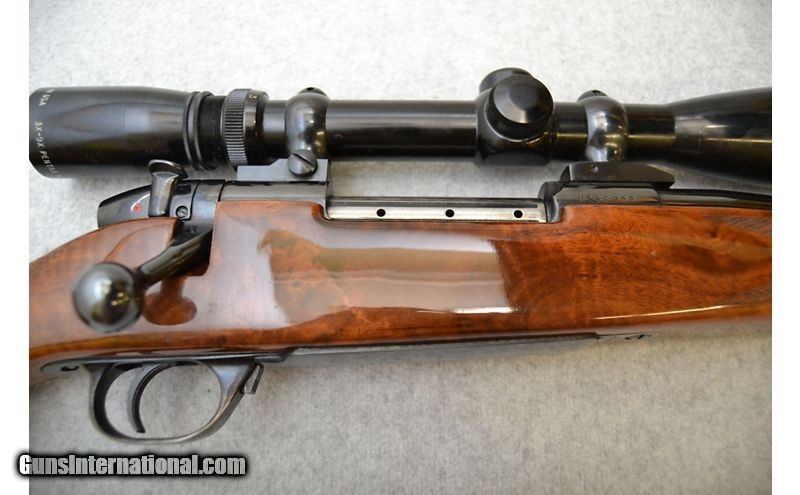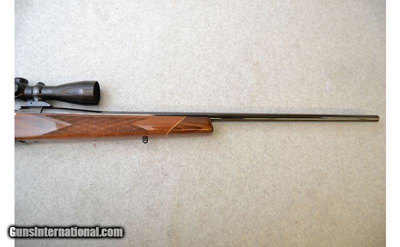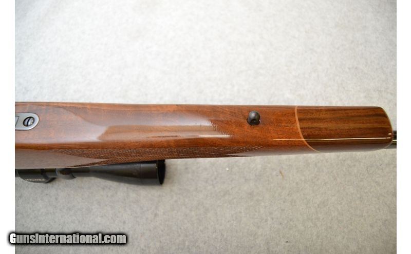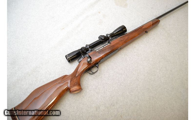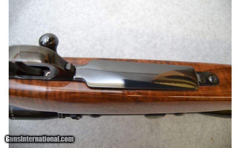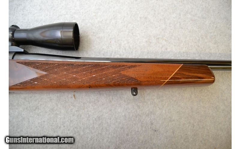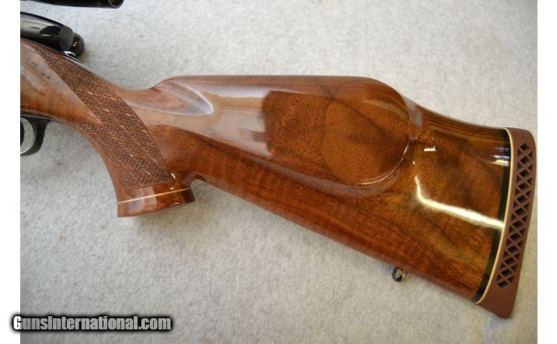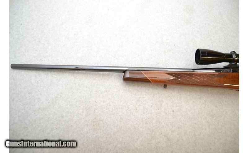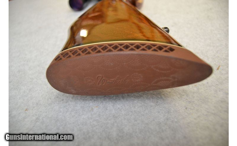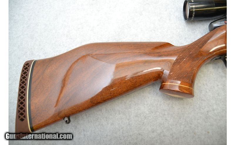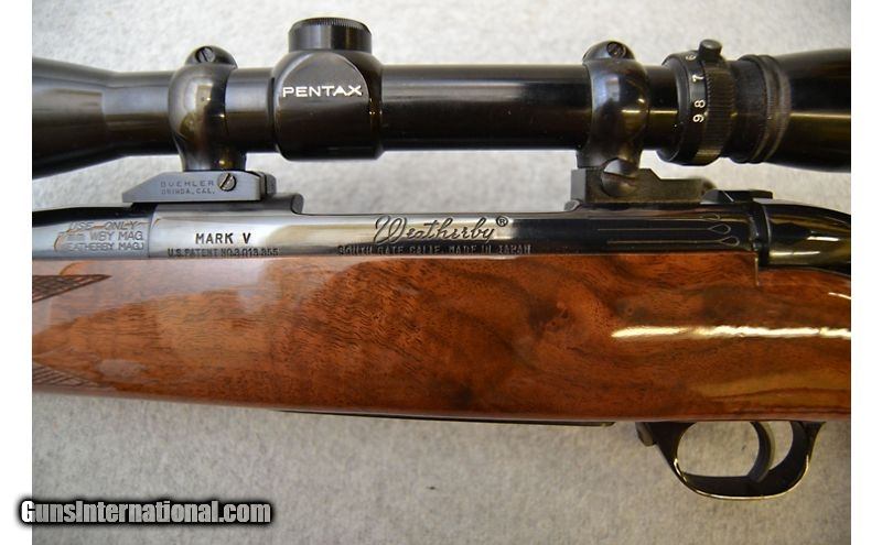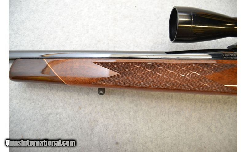 Description: Great shape overall. There are a few barely perceptible marks to the finish of the stock on the cheek rest and the right-hand side of the stock. The metal is in great shape with the exception of a mark near the muzzle (see pictures) and a few handling marks on the magazine floor plate. Some of the features of this fine rifle are high gloss finish on the metal and stock. Rosewood caps on the forearm and pistol grip cap; a diamond shaped wood insert accentuating the grip cap. The skip line checkering is as functional as it is aesthetically pleasing. 7mm Weatherby Magnum SOLD Chambers: Bolt-action fed from an internal magazine with a hinged floor plate. Metal Condition: Excellent. Wood Condition: Excellent. Bore Condition: Excellent with bright shine and sharp rifling. Barrels: 24" High gloss blued. Triggers: Wide blued metal with grooved surface. Stock Dimensions: High grade Claro walnut in Monte Carlo style with a 13½" LOP. Fore End: High grade Claro walnut with rosewood tip. Butt Pad: Ventilated brown rubber pad. Weight: 9.8 lbs Sights: No iron sights. Comes with a Pentax 3-9x scope. Chokes: N/A Item Location: Green Bay |