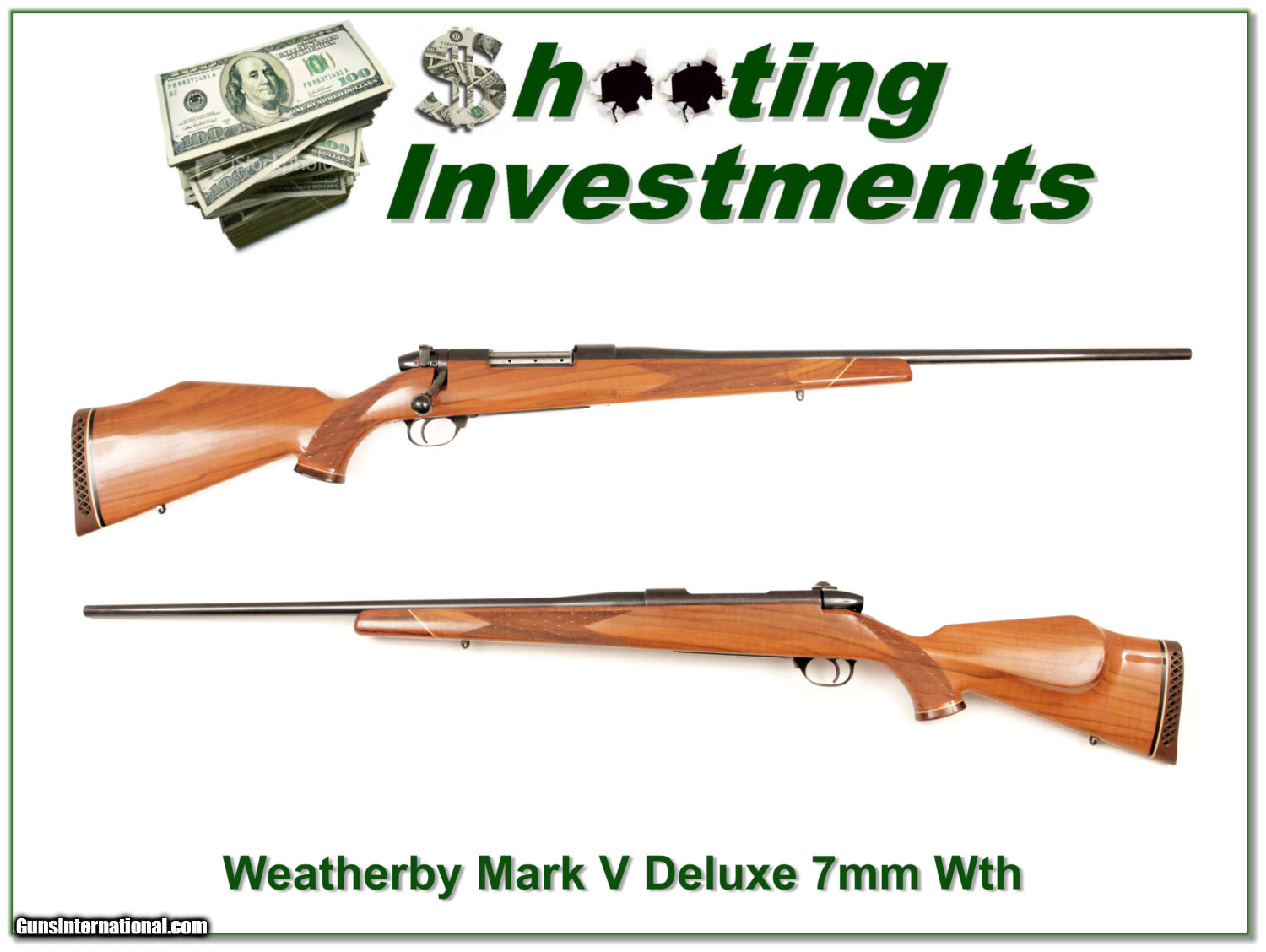 Description: Collector, shooters and hunters, this is a beautiful Weatherby Mark V Deluxe. It is chambered in 7mm Wthy magnum. It is in as near new condition with no marks I see. I am sure never fired more than a few rounds if that. It has the lighter weight 24in barrel making it best for most real world hunters! With the current list price for a new Mark V Deluxe now at $2600 this is a no-brainer! It is a Shooting Investment for sure! Shipping and insurance is $35 or $15 more if you want it shipped in a new Plano hard case. Please email me with any questions or larger pictures. (I now consign quality firearms only 10%! Let me know if you have any you would like to sell!) [16-0162] Payment: Payment is by Money Order, Cashiers Check or Personal Check. I can now also accept MasterCard and Visa with a 3% convenience fee. PayPal can be used for some items but never firearms. Please let us know if you would like to pay via PayPal. Shipping: The shipping charge will be listed in each description. It is $35 for most guns. Some heavy guns or those insured for over $2000 will be higher. Shipments to Alaska and Hawaii are higher because air shipment is required. Most firearms are shipped within 5 days of receipt of payment. We prefer shipping at the beginning of the week to avoid firearms in transit over weekends. We package all shipments carefully and insure them for the full purchase price, rounded up to the next $100. In the unlikely event that damage occurs, it is important that you save all packaging material for the claims process. Optics are shipped Priority Mail and most other non-firearm shipments are shipped First Class. Returns: Our return policy is simple. If for any reason you are not pleased with your purchase, you may return your item for a refund. The only exception is ammunition, it cannot be returned. It is important to us that you are happy. Guns cannot be fired or dissembled before returning them and must be returned in the same condition as received. Notification of a return must occur with-in 3 days of receipt at your dealer. Shipping, convenience and dealer fees are not refundable and are the responsibility of the buyer. Lay-a-way: If needed, we offer a 60 day lay-a-way option on most firearms. It is 1/3 now, 1/3 in 30 days and 1/3 in 60 days. Lay-a-way firearm sales are final. Consigning your firearms with Shooting Investments: We will help you get top dollar for your firearms. While most local guns shops charge 20% or more, our fee is only 10% with a minimum of $50. At your local gun shop it might take months to sell. Selling on-line provides instant access to thousands of interested buyers. You won’t find any other on-line dealer willing to sell your firearms for only 10% or listing every gun on 4 separate s. Selling through an House typically costs the seller 15% and the buyer an addition 15% (so 30%) and you have to wait several months to sell and longer to receive funds. If properly priced, we will sell your firearms in a week or two. Send us an email or give us a call and we’ll explain how easy it is for you to get top dollar. Trading: We collect guns and usually just trade for guns we want to add to our collections. We often sell guns for others wanting to purchase one of ours. We find this the most fair to both of us. Our Commission is only 10% and we hold the gun you want until yours sells. Please contact us if you want to sell one of yours to buy one of ours. Help for California Buyers: We are happy to ship to California. It is the buyer’s responsibility to make sure any item you buy is legal in your state. We are also happy to help with your purchase of a firearm from someone other than us. If you see a gun you would like to buy but the seller can’t or won’t ship to California we can help. You buy the gun and have it shipped to us. We’ll then ship it to your California dealer. The cost for this service is only $30 + shipping. Let me know if we can help! SOLD |