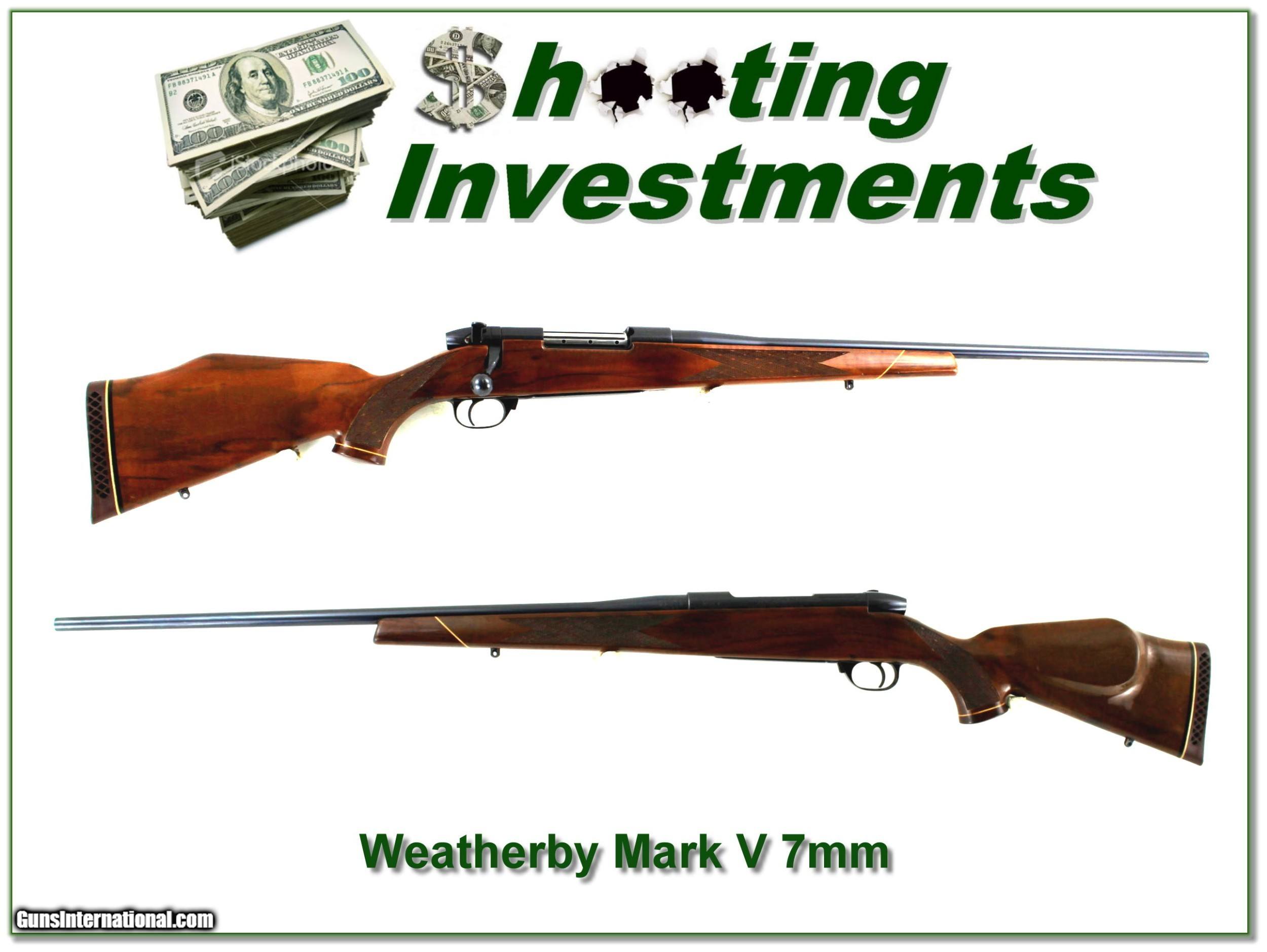 Description: This is a Weatherby Mark V Deluxe in 7mm Weatherby magnum. It has beautiful wood figure. The barrel is the harder to find 24in Lightweight, making this one perfect for most real-world hunters. I just a few light marks on the metal and from the razor-sharp lugs we know not many rounds fired. The wood has a few minor marks. It will make a classic big game long-range hunting gun at about half the cost of a new one. That makes it a real Shooting Investment! Shipping and insurance is $49. Please email me with any questions or larger pictures. (Consign your quality firearms with Shooting Investments for only 12%! Let me know if you have any you would like to sell!) 22-1155 Payment: Payment is by Money Order, Cashiers Check or Personal Check. I can now also accept Credit Cards (MasterCard, Visa, Discover & American Express) with a 3% convenience fee. Shipping: The shipping charge will be listed in each description. It is $49 for most long guns. Some heavy guns, over 48in boxes or those insured for over $2000 will be higher. Shipments to Alaska and Hawaii are higher because air shipment is required. Most firearms are shipped on Tuesday and Thursday and usually in 5 days of receipt of payment. We package all shipments carefully and insure them. Optics are shipped Priority Mail and most other non-firearm shipments are shipped First Class. Returns: Our return policy is simple. If for any reason you are not pleased with your purchase, you may return your item for a full refund of purchase price. Ammunition cannot be returned. It is important to us that you are happy. Guns cannot be fired or dissembled before returning them and they must be returned in the same condition as received. Notification of a return must occur with-in 3 days of receipt at your dealer. Shipping, convenience and dealer fees are not refundable and are the responsibility of the buyer. Lay-a-way: If needed, we offer a 60 day lay-a-way option on most firearms. It is 1/3 now, 1/3 in 30 days and 1/3 in 60 days. Lay-a-way firearm sales are final and if not completed the first payment cannot be returned. Consigning your firearms with Shooting Investments: We will help you get top dollar for your firearms. While most local guns shops charge 20% or more, our fee is only 12% with a minimum of $75. At your local gun shop it might take months to sell. Selling on-line provides instant access to thousands of interested buyers. You won’t find any other on-line dealer willing to sell your firearms for only 12% or listing every gun on 3 separate s. Selling through an House typically costs the seller 15% and the buyer an addition 15% (so 30%) and you have to wait several months to sell and longer to receive funds. If properly priced, we will sell your firearms in a few weeks. Send us an email or give us a call and we’ll explain how easy it is for you to get top dollar. Trading: Trading for use is really just buying your gun to re-sell. If you have a gun you want to trade, please email a picture and we will let you know what we can give or it. You will always get more if we sell it for you on consignment. Help for California Buyers: We are happy to ship to California. It is the buyer’s responsibility to make sure any item you buy is legal in your state. We are also happy to help with your purchase of a firearm from someone other than us. If you see a gun you would like to buy but the seller can’t or won’t ship to California they can ship to use and we’ll then ship it to your California dealer. The cost for this service is only $30 + shipping. Let us know if we can help! SOLD |