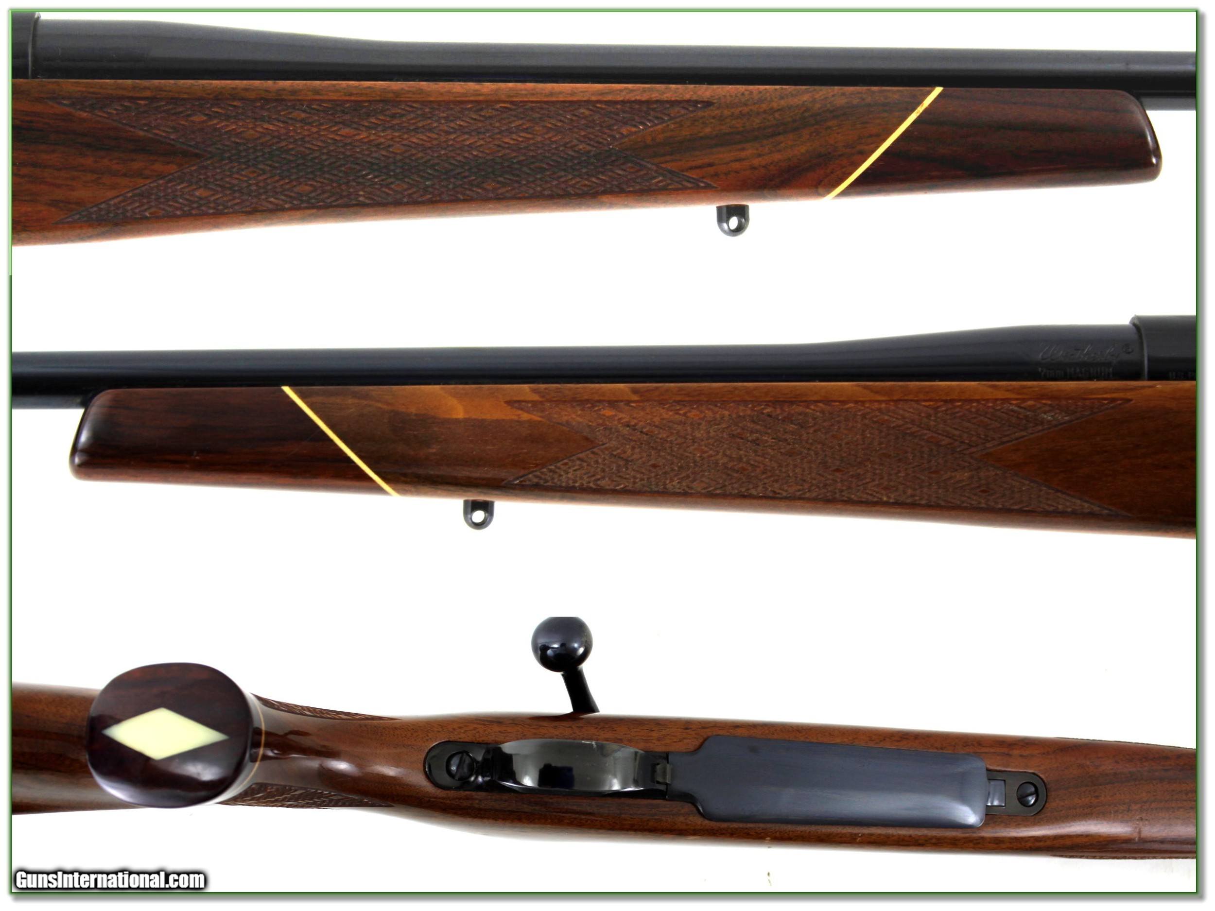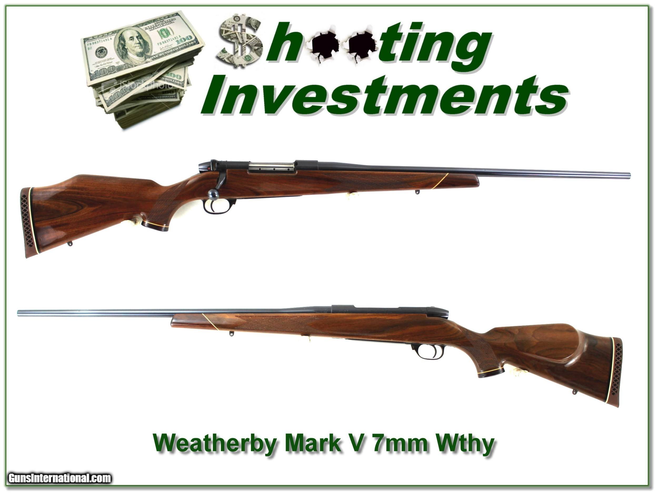 Description: This is an excellent condition Weatherby Mark V Deluxe in 7mm Weatherby Magnum. It has MUCH nicer wood grain than most. The metal is excellent and from the razor-sharp lugs I’m sure only a few rounds fired. The barrel is the lighter weight 24in so this one is perfect for most hunters. I only find a couple minor marks on the wood. Shipping and insurance is $49. Please email me with any questions or larger pictures. (Consign your quality firearms with Shooting Investments for only 12%! Let me know if you have any you would like to sell!) 22-0600 Payment: Payment is by Money Order, Cashiers Check or Personal Check. I can now also accept Credit Cards (MasterCard, Visa, Discover & American Express) with a 3% convenience fee. Shipping: The shipping charge will be listed in each description. It is $49 for most long guns. Some heavy guns, over 48in boxes or those insured for over $2000 will be higher. Shipments to Alaska and Hawaii are higher because air shipment is required. Most firearms are shipped on Tuesday and Thursday and usually in 5 days of receipt of payment. We package all shipments carefully and insure them. Optics are shipped Priority Mail and most other non-firearm shipments are shipped First Class. Returns: Our return policy is simple. If for any reason you are not pleased with your purchase, you may return your item for a full refund of purchase price. Ammunition cannot be returned. It is important to us that you are happy. Guns cannot be fired or dissembled before returning them and they must be returned in the same condition as received. Notification of a return must occur with-in 3 days of receipt at your dealer. Shipping, convenience and dealer fees are not refundable and are the responsibility of the buyer. Lay-a-way: If needed, we offer a 60 day lay-a-way option on most firearms. It is 1/3 now, 1/3 in 30 days and 1/3 in 60 days. Lay-a-way firearm sales are final and if not completed the first payment cannot be returned. Consigning your firearms with Shooting Investments: We will help you get top dollar for your firearms. While most local guns shops charge 20% or more, our fee is only 12% with a minimum of $75. At your local gun shop it might take months to sell. Selling on-line provides instant access to thousands of interested buyers. You won’t find any other on-line dealer willing to sell your firearms for only 12% or listing every gun on 3 separate s. Selling through an House typically costs the seller 15% and the buyer an addition 15% (so 30%) and you have to wait several months to sell and longer to receive funds. If properly priced, we will sell your firearms in a few weeks. Send us an email or give us a call and we’ll explain how easy it is for you to get top dollar. Trading: Trading for use is really just buying your gun to re-sell. If you have a gun you want to trade, please email a picture and we will let you know what we can give or it. You will always get more if we sell it for you on consignment. Help for California Buyers: We are happy to ship to California. It is the buyer’s responsibility to make sure any item you buy is legal in your state. We are also happy to help with your purchase of a firearm from someone other than us. If you see a gun you would like to buy but the seller can’t or won’t ship to California they can ship to use and we’ll then ship it to your California dealer. The cost for this service is only $30 + shipping. Let us know if we can help! SOLD |