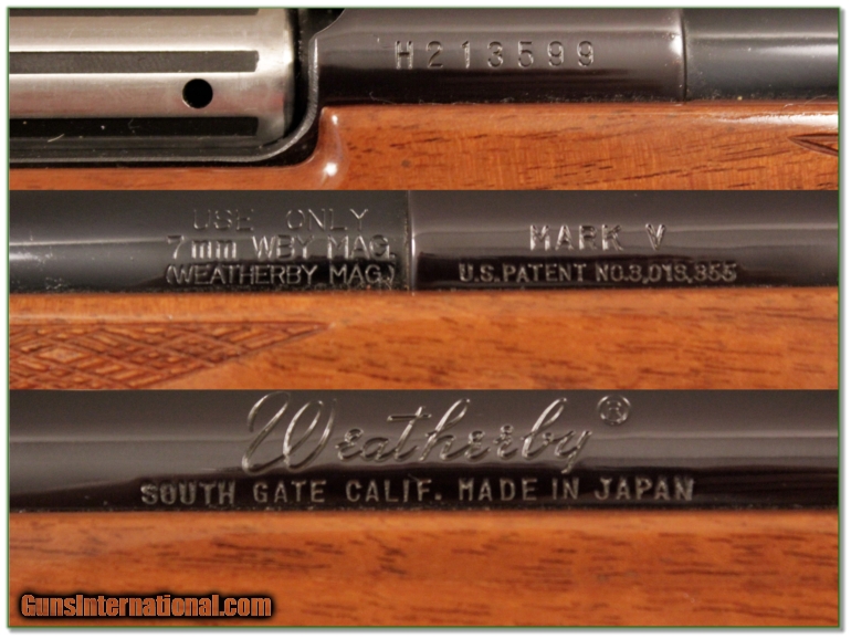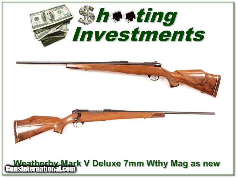 Description: This is a Weatherby Mark V Deluxe in 7mm Wthy Mag. It is in as new condition and I am sure never fired more than a few rounds after leaving the factory. It is a no longer made lighter weight 24in Japan made Deluxe. These 24in guns are to me the better choice for most hunters. They are much easier to carry and the insignificant decrease in velocity over the longer 26in barrel is more than made up in less fatigue and steadier aim when it counts. Considering the current list price of $2400 for a new one you can’t go wrong here. It will make a nice addition to your collection or be an impressive hunting gun. I am selling this one on consignment and as such lay-a-way can’t be used. It does of course have the standard 3 day inspection. Shipping and insurance is $30 or $18 more if you want it shipped in a new Plano hard case. Please email me with any questions or larger pictures. (I now consign quality firearms only 10%! Let me know if you have any you would like to sell!) [14-0805] Terms & Conditions Payment: Payment is by Money Order, Cashiers Check or Personal Check. I can now also accept MasterCard and Visa with a 3% convenience fee. PayPal can be used for some items but never firearms. Please let us know if you would like to pay via PayPal. Shipping: The shipping charge will be listed in each description. It is $30 for most guns. Some heavy guns or those insured for over $2000 may be higher. Shipments to Alaska and Hawaii are higher because air shipment is required. Most firearms are shipped within 5 days of receipt of payment. We prefer shipping at the beginning of the week to avoid firearms in transit over weekends. We package all shipments carefully and insure them for the full purchase price, rounded up to the next $100. In the unlikely event that damage occurs, it is important that you save all packaging material for the claims process. Optics are shipped Priority Mail and most other non-firearm shipments are shipped First Class. Returns: Our return policy is simple. If for any reason you are not pleased with your purchase, you may return your item for a refund. The only exception is ammunition, it cannot be returned. It is important to us that you are happy. Guns cannot be fired or dissembled before returning them and must be returned in the same condition as received. Notification of a return must occur with-in 3 days of receipt at your dealer. Shipping, convenience and dealer fees are not refundable and are the responsibility of the buyer. Lay-a-way: If needed, we offer a 60 day lay-a-way option on most firearms. It is 1/3 now, 1/3 in 30 days and 1/3 in 60 days. Lay-a-way firearm sales are final. Consigning your firearms with Shooting Investments: We will help you get top dollar for your firearms. While most local guns shops charge 20% or more, our fee is only 10% with a minimum of $50. At your local gun shop it might take months to sell. Selling on-line provides instant access to thousands of interested buyers. You won’t find any other on-line dealer willing to sell your firearms for only 10% or listing every gun on 4 separate s. Selling through an House typically costs 15% and you have to wait several months to sell and longer to receive funds. If properly priced, we will sell your firearms in a week or two. Send us an email or give us a call and we’ll explain how easy it is for you to get top dollar. Trading: We collect guns and usually just trade for guns we want to add to our collections. We often sell guns for others wanting to purchase one of ours. We find this the most fair to both of us. Our Commission is only 10% and we hold the gun you want until yours sells. Please contact us if you want to sell one of yours to buy one of ours. Help for California Buyers: We are happy to ship to California. It is the buyer’s responsibility to make sure any item you buy is legal in your state. We are also happy to help with your purchase of a firearm from someone other than us. If you see a gun you would like to buy but the seller can’t or won’t ship to California we can help. You buy the gun and have it shipped to us. We’ll then ship it to your California dealer. The cost for this service is only $30 + shipping. Let me know if we can help! SOLD |