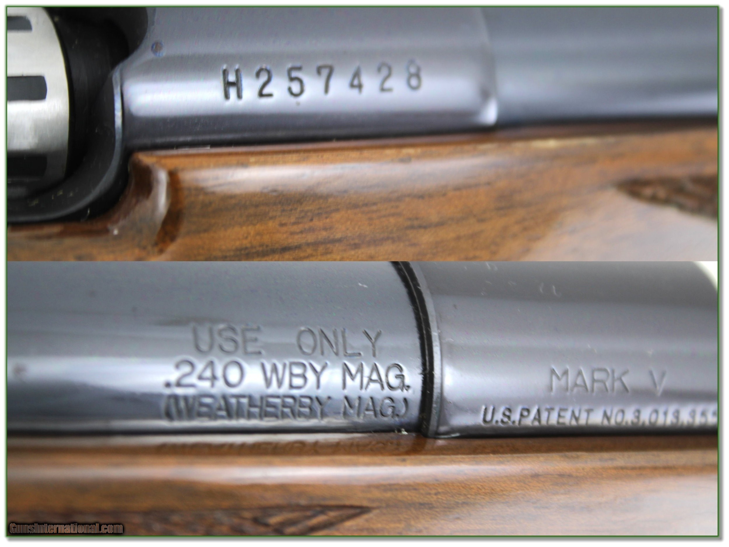 Description: This is an excellent condition Weatherby Mark V Deluxe in 240 Weatherby. It is the original 9-lug bolt and harder to find 26in barrel. The blue is near new and from the lugs I know only a few rounds fired. The wood has excellent grain and figure with only a few insignificant handing marks. It was made in Japan which is were many collectors believe was the highest quality production of all Weatherbys. It will make a classic hunting gun or be a fine addition to your collection. Shipping and insurance is $39. Please email me with any questions or larger pictures. (Consign your quality firearms with Shooting Investments for only 12%! Let me know if you have any you would like to sell!) 21-0645 Payment: Payment is by Money Order, Cashiers Check or Personal Check. I can now also accept Credit Cards (MasterCard, Visa, Discover & American Express) with a 3% convenience fee. Shipping: The shipping charge will be listed in each description. It is $39 for most firearms. Some heavy guns or those insured for over $2000 will be higher. Shipments to Alaska and Hawaii are higher because air shipment is required. Most firearms are shipped on Tuesday and Thursday and usually in 5 days of receipt of payment. We package all shipments carefully and insure them. Optics are shipped Priority Mail and most other non-firearm shipments are shipped First Class. Returns: Our return policy is simple. If for any reason you are not pleased with your purchase, you may return your item for a full refund of purchase price. Ammunition cannot be returned. It is important to us that you are happy. Guns cannot be fired or dissembled before returning them and they must be returned in the same condition as received. Notification of a return must occur with-in 3 days of receipt at your dealer. Shipping, convenience and dealer fees are not refundable and are the responsibility of the buyer. Lay-a-way: If needed, we offer a 60 day lay-a-way option on most firearms. It is 1/3 now, 1/3 in 30 days and 1/3 in 60 days. Lay-a-way firearm sales are final and if not completed the first payment cannot be returned. Consigning your firearms with Shooting Investments: We will help you get top dollar for your firearms. While most local guns shops charge 20% or more, our fee is only 12% with a minimum of $75. At your local gun shop it might take months to sell. Selling on-line provides instant access to thousands of interested buyers. You won’t find any other on-line dealer willing to sell your firearms for only 12% or listing every gun on 3 separate s. Selling through an House typically costs the seller 15% and the buyer an addition 15% (so 30%) and you have to wait several months to sell and longer to receive funds. If properly priced, we will sell your firearms in a few weeks. Send us an email or give us a call and we’ll explain how easy it is for you to get top dollar. Trading: Trading for use is really just buying your gun to re-sell. If you have a gun you want to trade, please email a picture and we will let you know what we can give or it. You will always get more if we sell it for you on consignment. Help for California Buyers: We are happy to ship to California. It is the buyer’s responsibility to make sure any item you buy is legal in your state. We are also happy to help with your purchase of a firearm from someone other than us. If you see a gun you would like to buy but the seller can’t or won’t ship to California they can ship to use and we’ll then ship it to your California dealer. The cost for this service is only $30 + shipping. Let us know if we can help! SOLD |